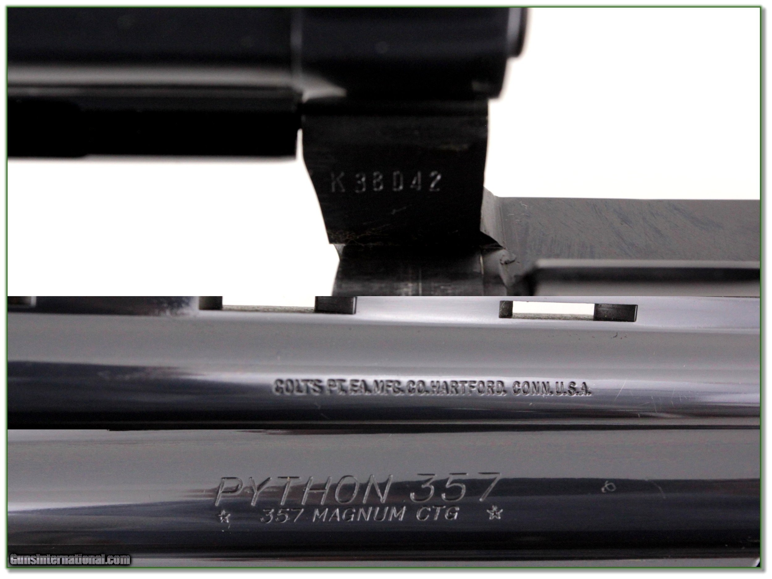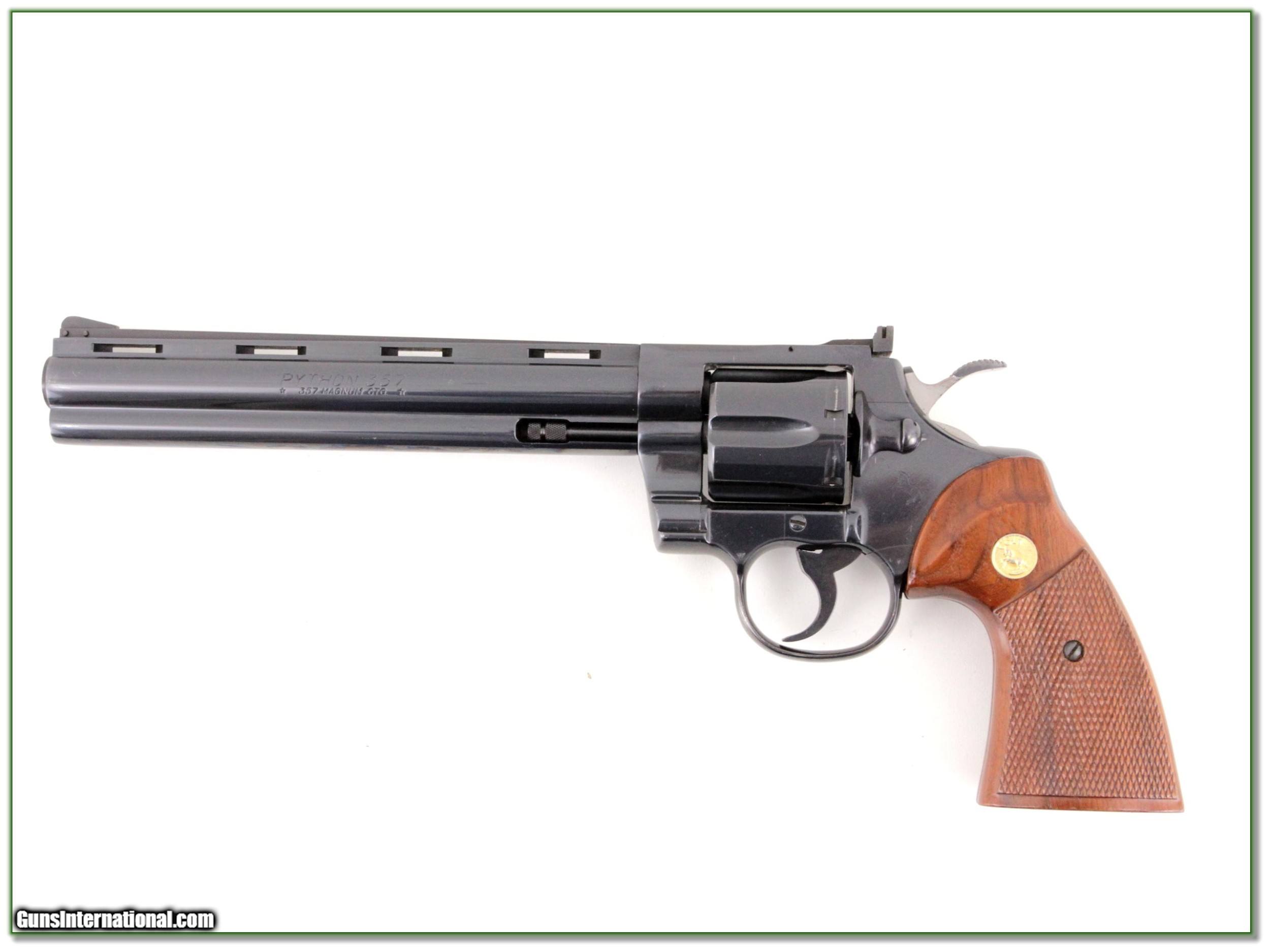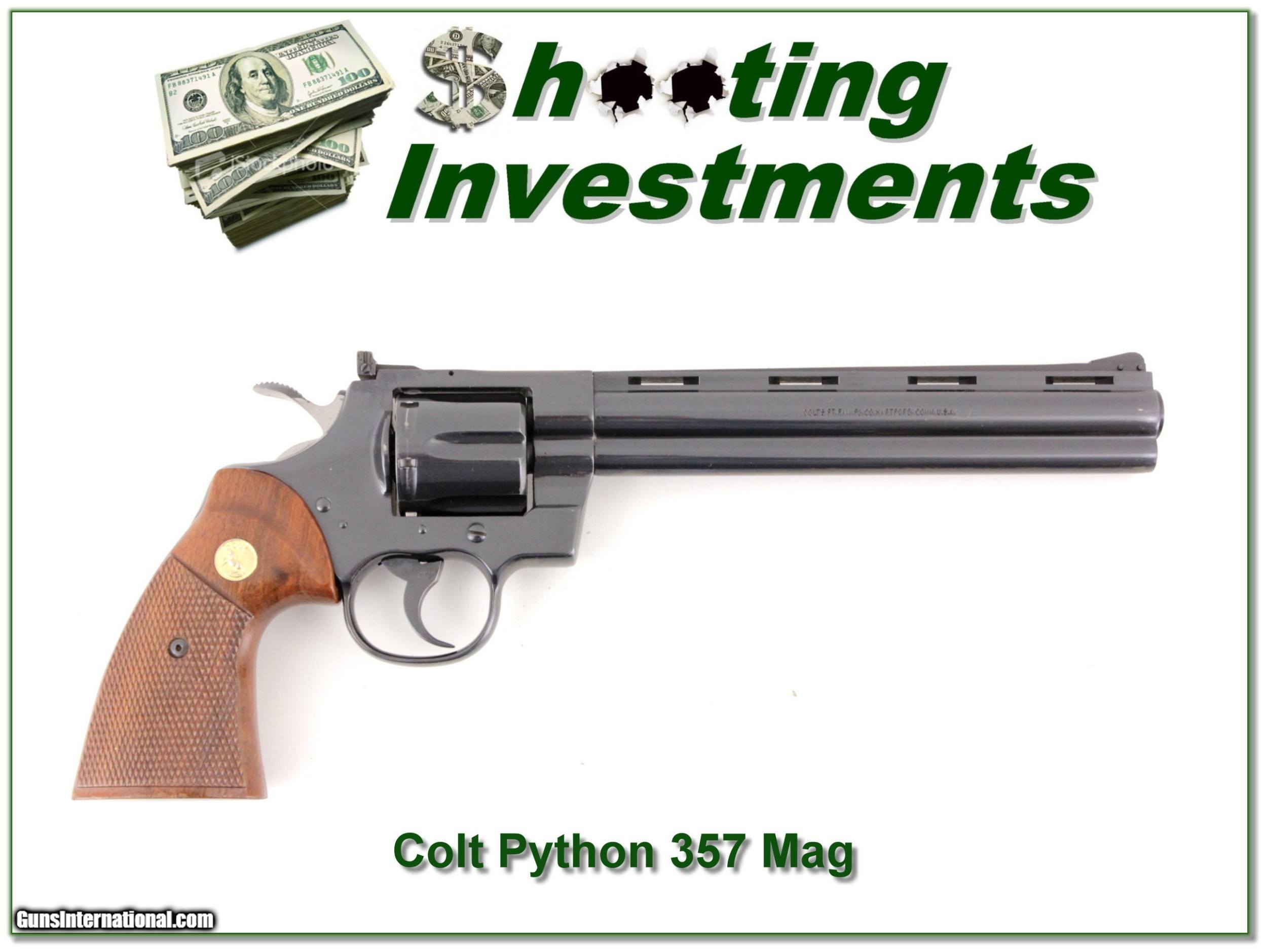 Description: This is a 1964 made Colt Python in excellent condition. It has a 8in barrel and just light muzzle wear. It will make a fine addition to your collection. And they just can’t make them like they used too! I am selling this one on consignment and as such lay-a-way can’t be used. It does of course have the standard 3-day inspection. Shipping with insurance is $49. Please email me with any questions or larger pictures. (Consign your quality firearms with Shooting Investments for only 12%! Let me know if you have any you would like to sell!) 19-1546 Payment: Payment is by Money Order, Cashiers Check or Personal Check. I can now also accept Credit Cards (MasterCard, Visa, Discover & American Express) with a 3% convenience fee. PayPal can be used for some items but never for firearms. Shipping: The shipping charge will be listed in each description. It is $39 for most firearms. Some heavy guns or those insured for over $2000 will be higher. Shipments to Alaska and Hawaii are higher because air shipment is required. Most firearms are shipped on Tuesday and Thursday and usually in 5 days of receipt of payment. We package all shipments carefully and insure them. Optics are shipped Priority Mail and most other non-firearm shipments are shipped First Class. Returns: Our return policy is simple. If for any reason you are not pleased with your purchase, you may return your item for a full refund of purchase price. Ammunition cannot be returned. It is important to us that you are happy. Guns cannot be fired or dissembled before returning them and they must be returned in the same condition as received. Notification of a return must occur with-in 3 days of receipt at your dealer. Shipping, convenience and dealer fees are not refundable and are the responsibility of the buyer. Lay-a-way: If needed, we offer a 60 day lay-a-way option on most firearms. It is 1/3 now, 1/3 in 30 days and 1/3 in 60 days. Lay-a-way firearm sales are final and if not completed the first payment cannot be returned. Consigning your firearms with Shooting Investments: We will help you get top dollar for your firearms. While most local guns shops charge 20% or more, our fee is only 12% with a minimum of $75. At your local gun shop it might take months to sell. Selling on-line provides instant access to thousands of interested buyers. You won’t find any other on-line dealer willing to sell your firearms for only 12% or listing every gun on 3 separate s. Selling through an House typically costs the seller 15% and the buyer an addition 15% (so 30%) and you have to wait several months to sell and longer to receive funds. If properly priced, we will sell your firearms in a few weeks. Send us an email or give us a call and we’ll explain how easy it is for you to get top dollar. Trading: Trading for use is really just buying your gun to re-sell. If you have a gun you want to trade, please email a picture and we will let you know what we can give or it. You will always get more if we sell it for you on consignment. Help for California Buyers: We are happy to ship to California. It is the buyer’s responsibility to make sure any item you buy is legal in your state. We are also happy to help with your purchase of a firearm from someone other than us. If you see a gun you would like to buy but the seller can’t or won’t ship to California they can ship to use and we’ll then ship it to your California dealer. The cost for this service is only $30 + shipping. Let us know if we can help! SOLD |