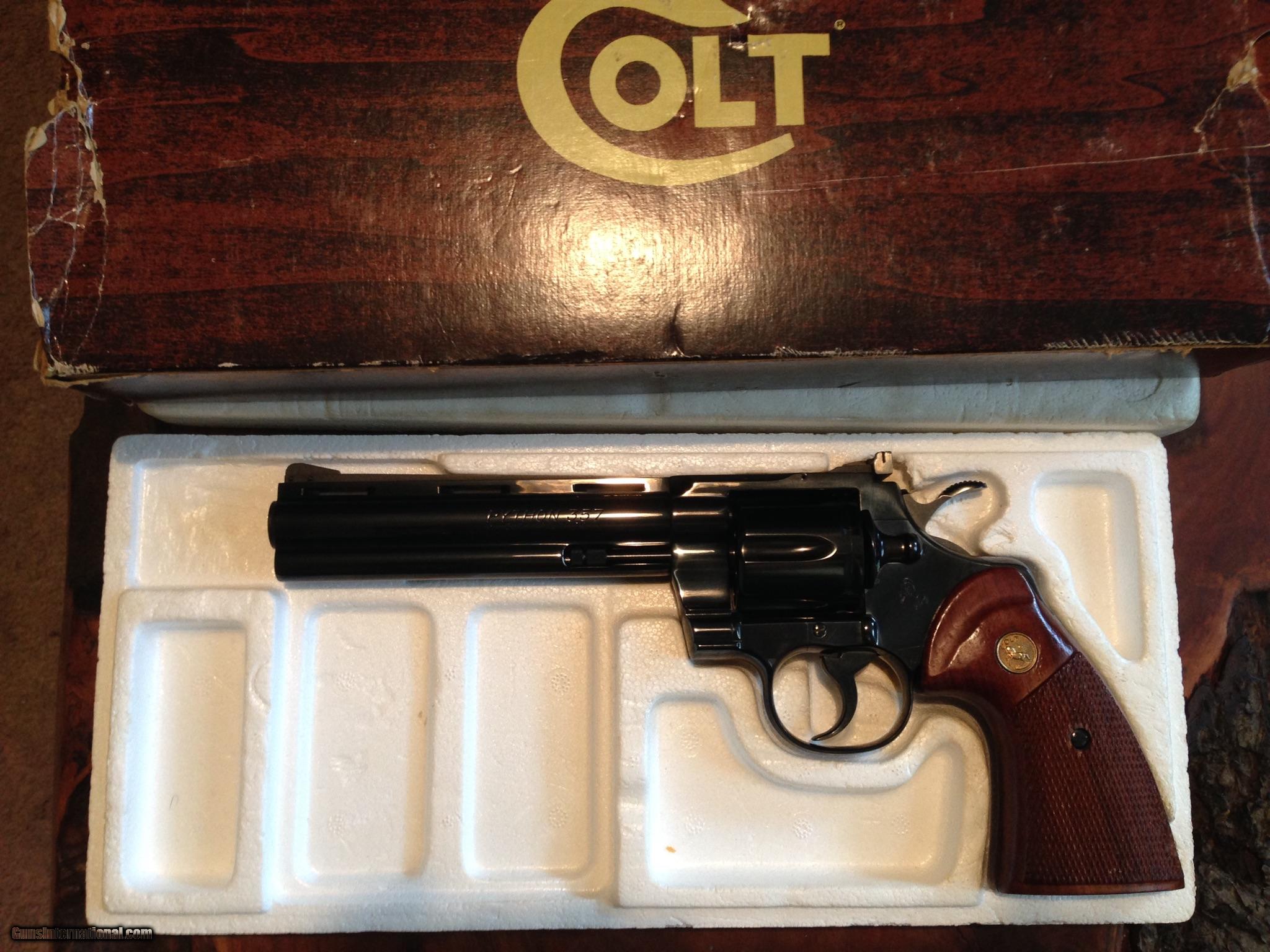 Description: **** SOLD PENDING FUNDS **** COLT PYTHON , 357 MAGNUM , ROYAL BLUE , 6" BARREL , AS NEW , FACTORY TEST FIRED ONLY , COMES WITH IT'S BOX. SERIAL NUMBER # V19859 = 1978 . SOLD |