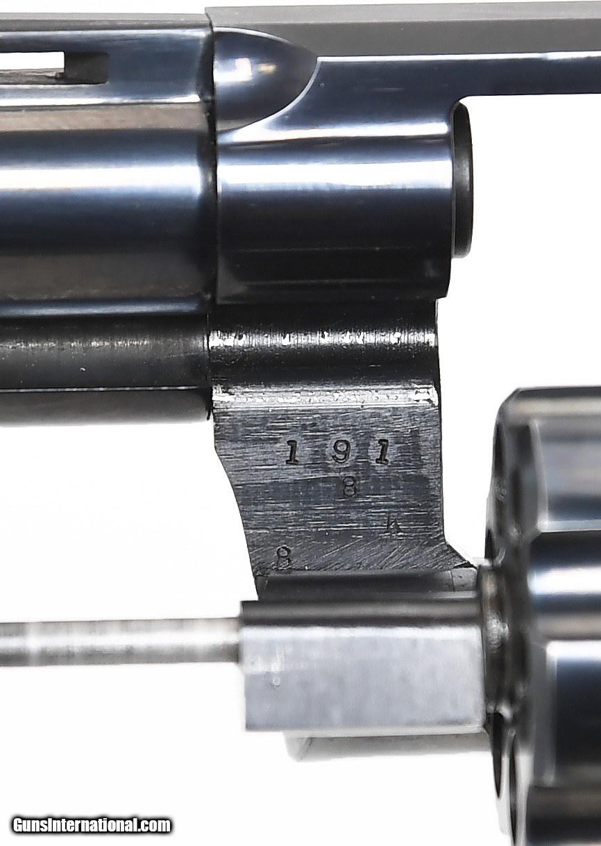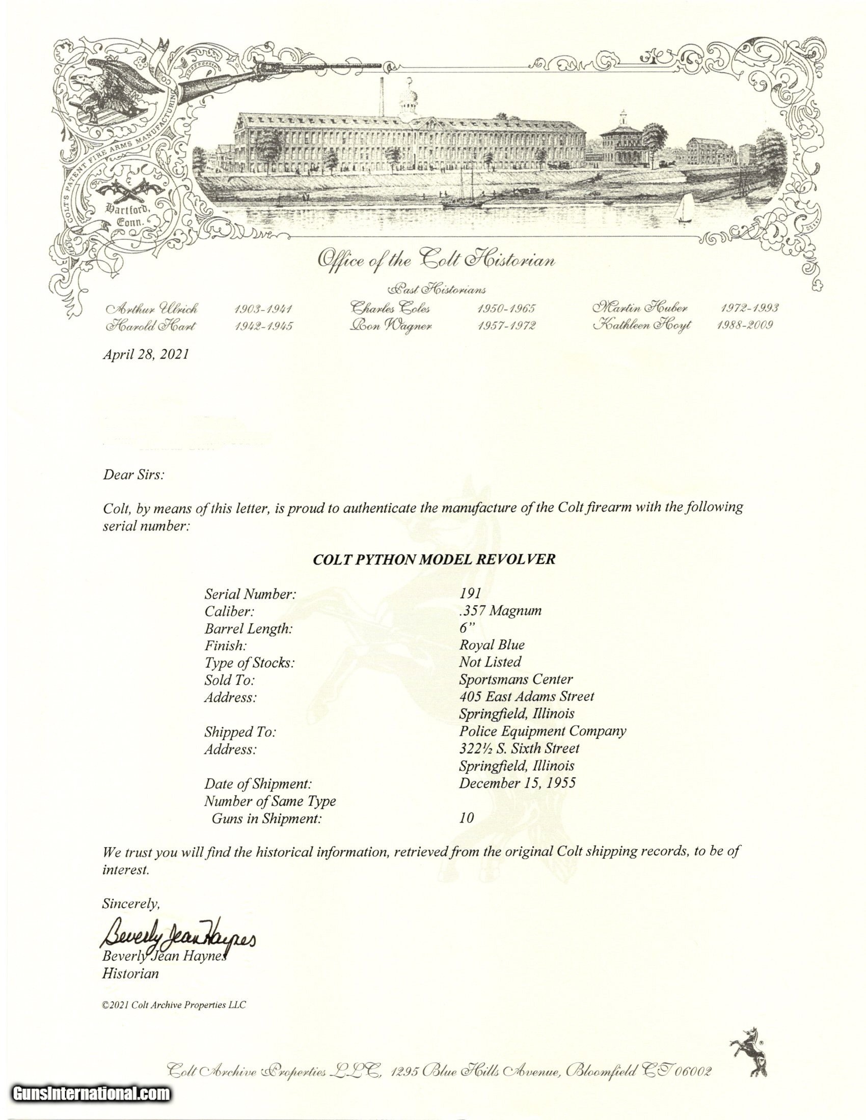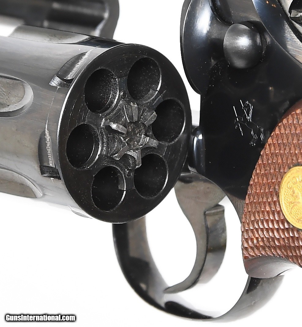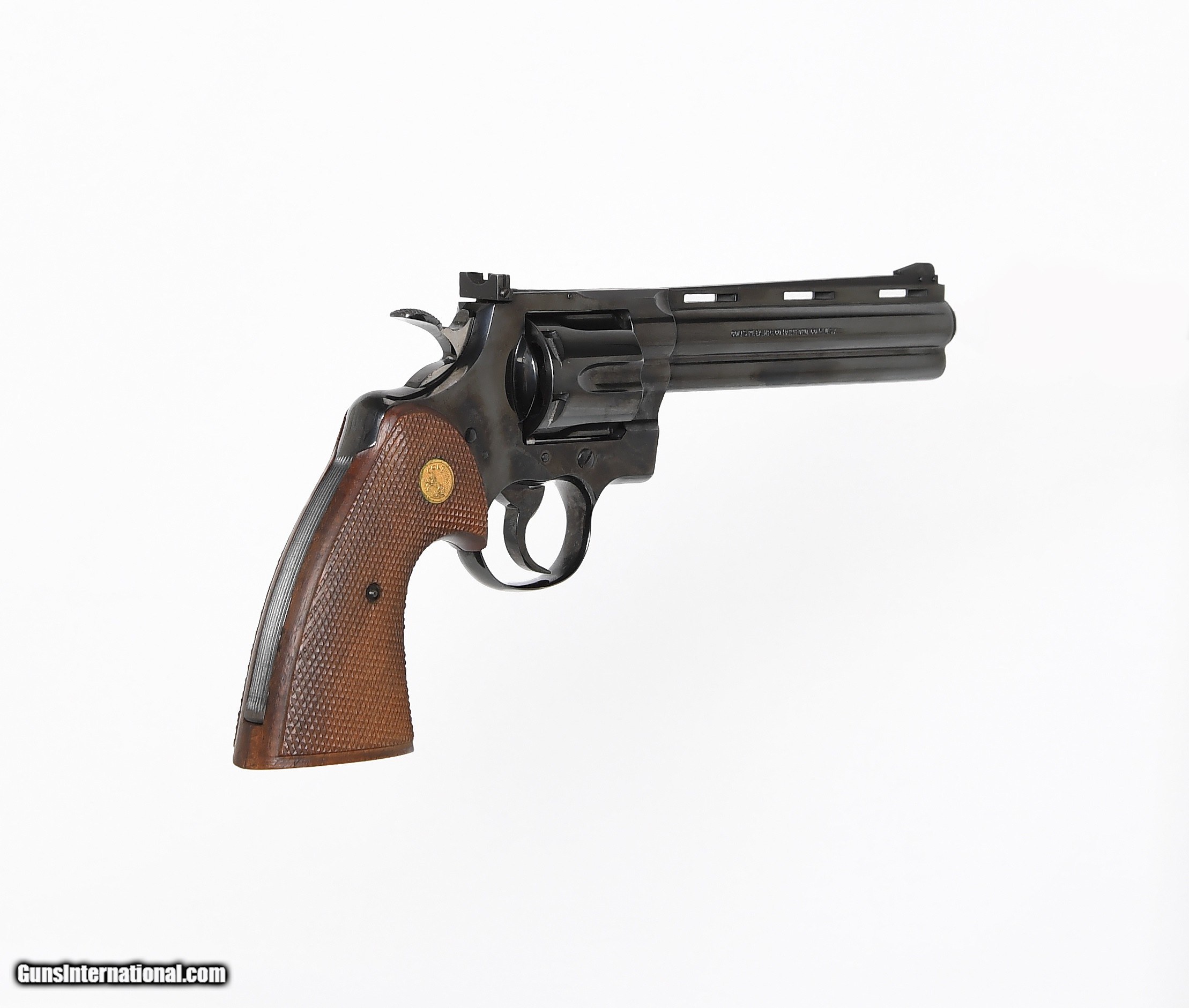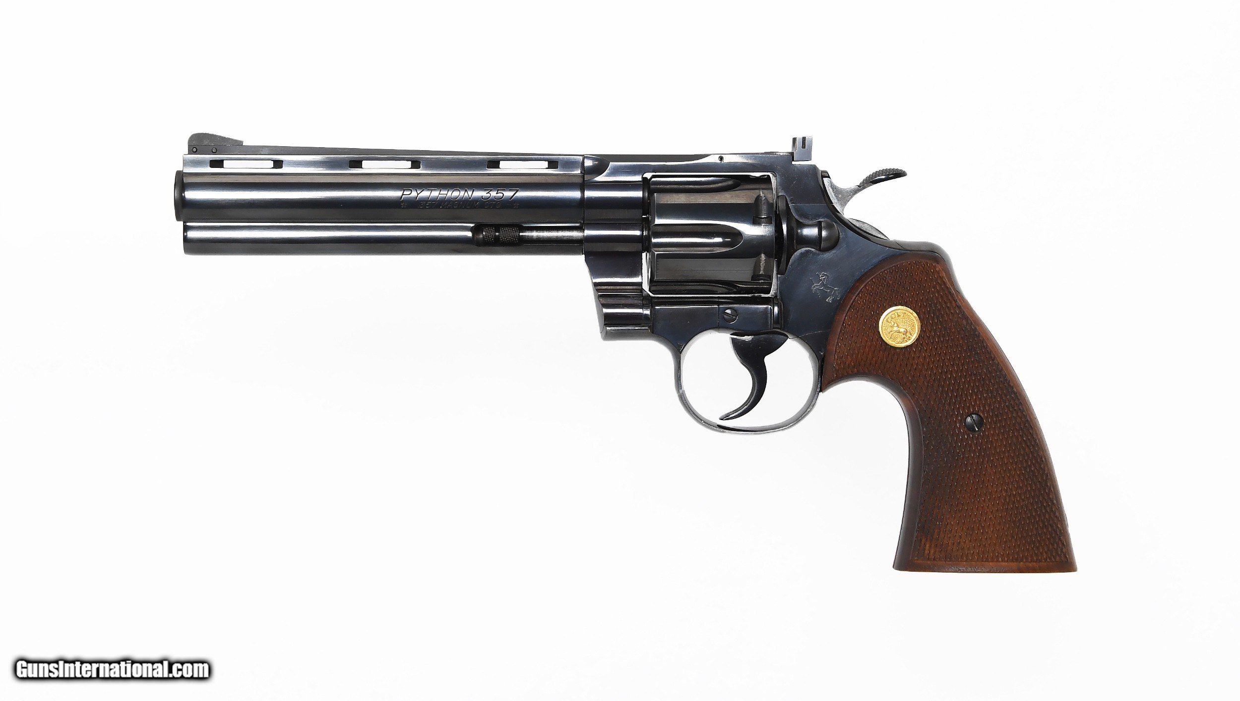 Description: Serial number 191! One of the very first Pythons shipped in December of 1955. This 6" Royal Blue version is nearly as "minty" as it was 66 years ago when it left Colt. All metal finishes are 98-99% with just the most faint "drag" line around the cylinder as the deduction. The grips are perfect without a single diamond in the checkering being "dinged" or bumped. If only I had the original box and paperwork...! Truly this Python is one of the best First Year guns in existence. SOLD |
