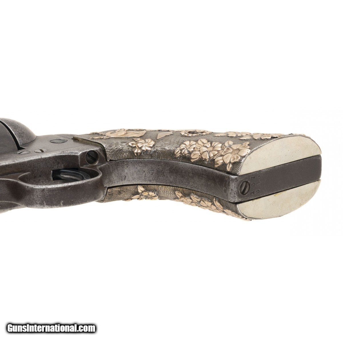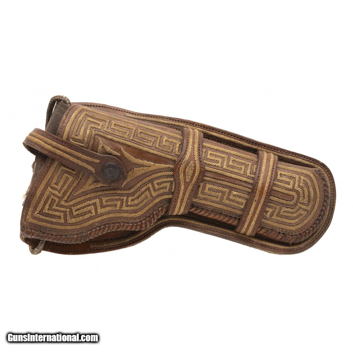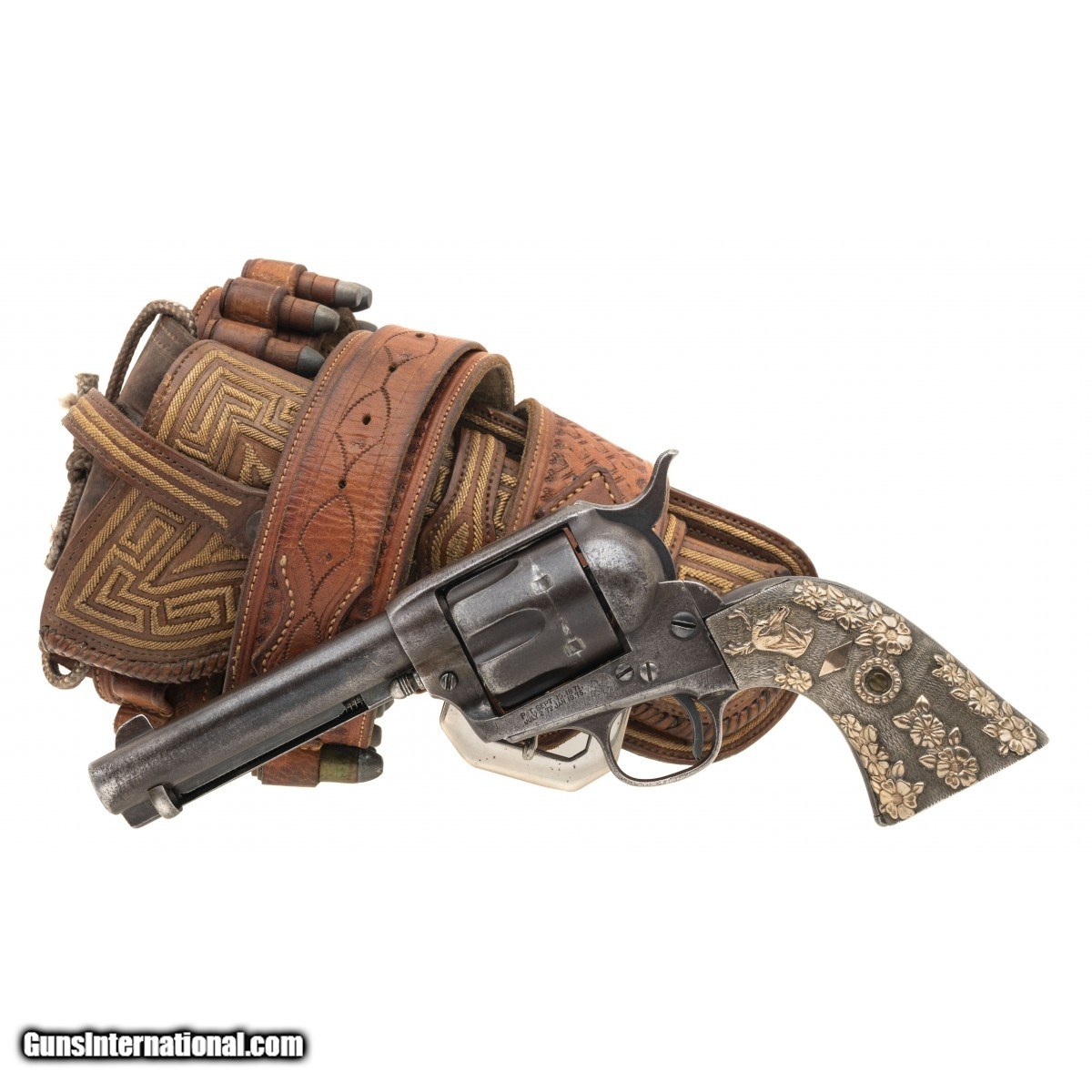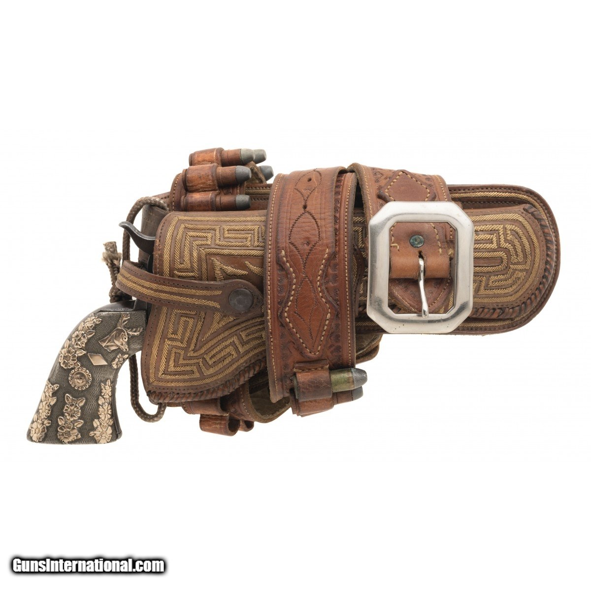 Description: "Serial number 167685. Made in 1896. 45 Colt with a 4 ¾" barrel. This gun has a brown to gray patina. Grips are silver with gold inlays. Along with this gun comes a Piteado Holster. The cartridge belt rig has carved leather. (Consignment) SOLD |