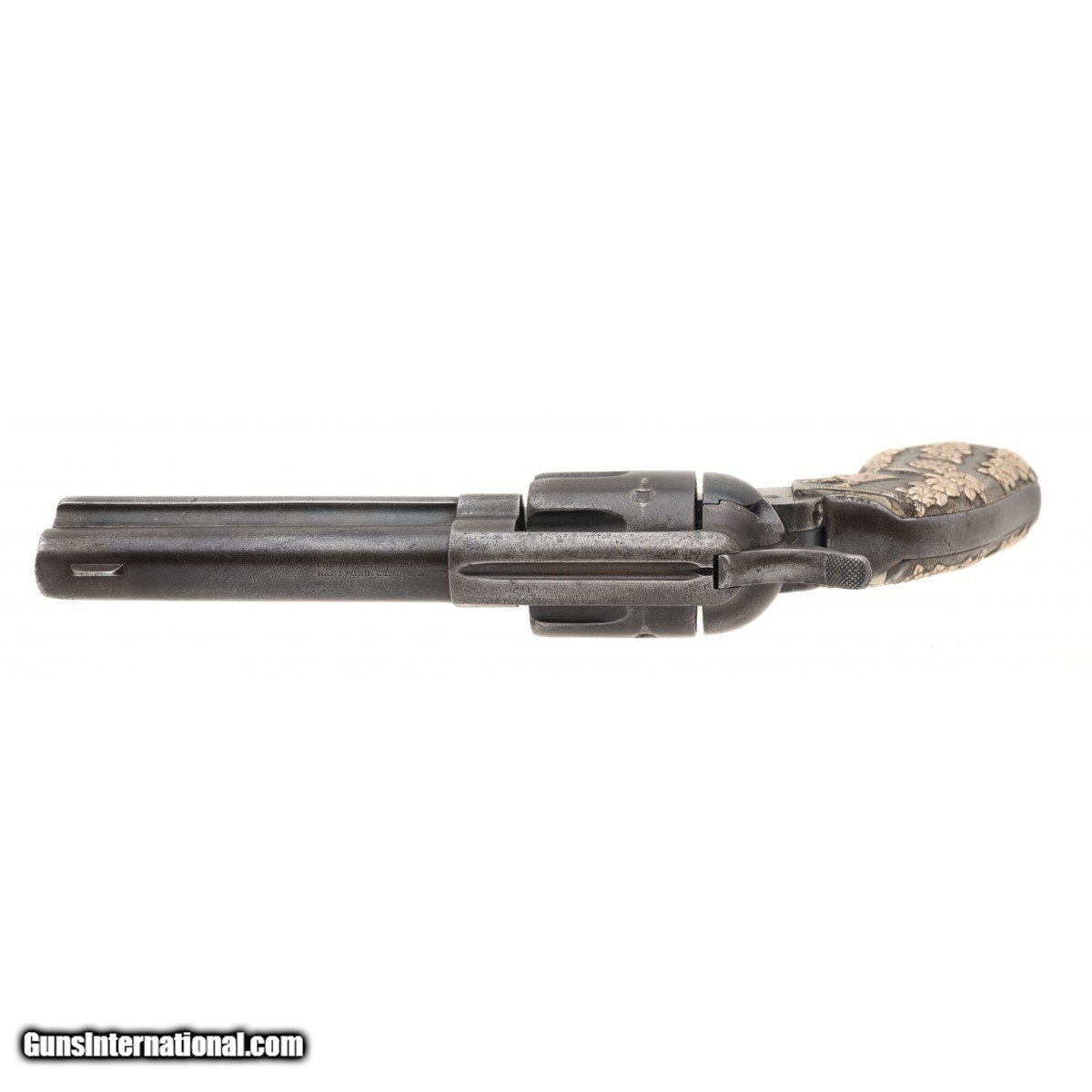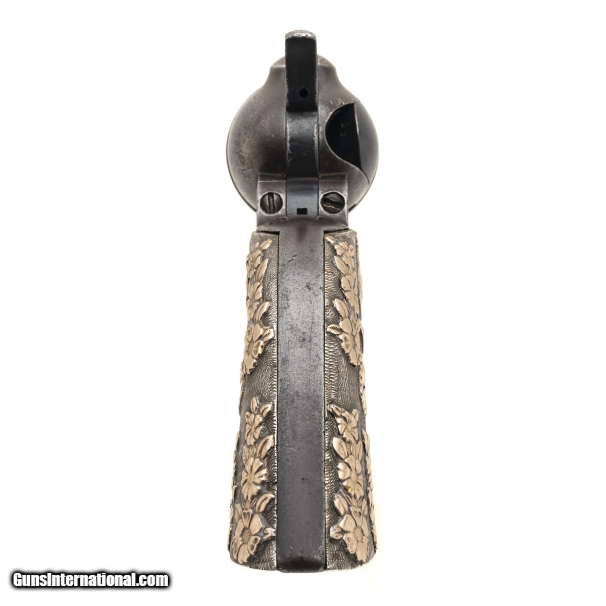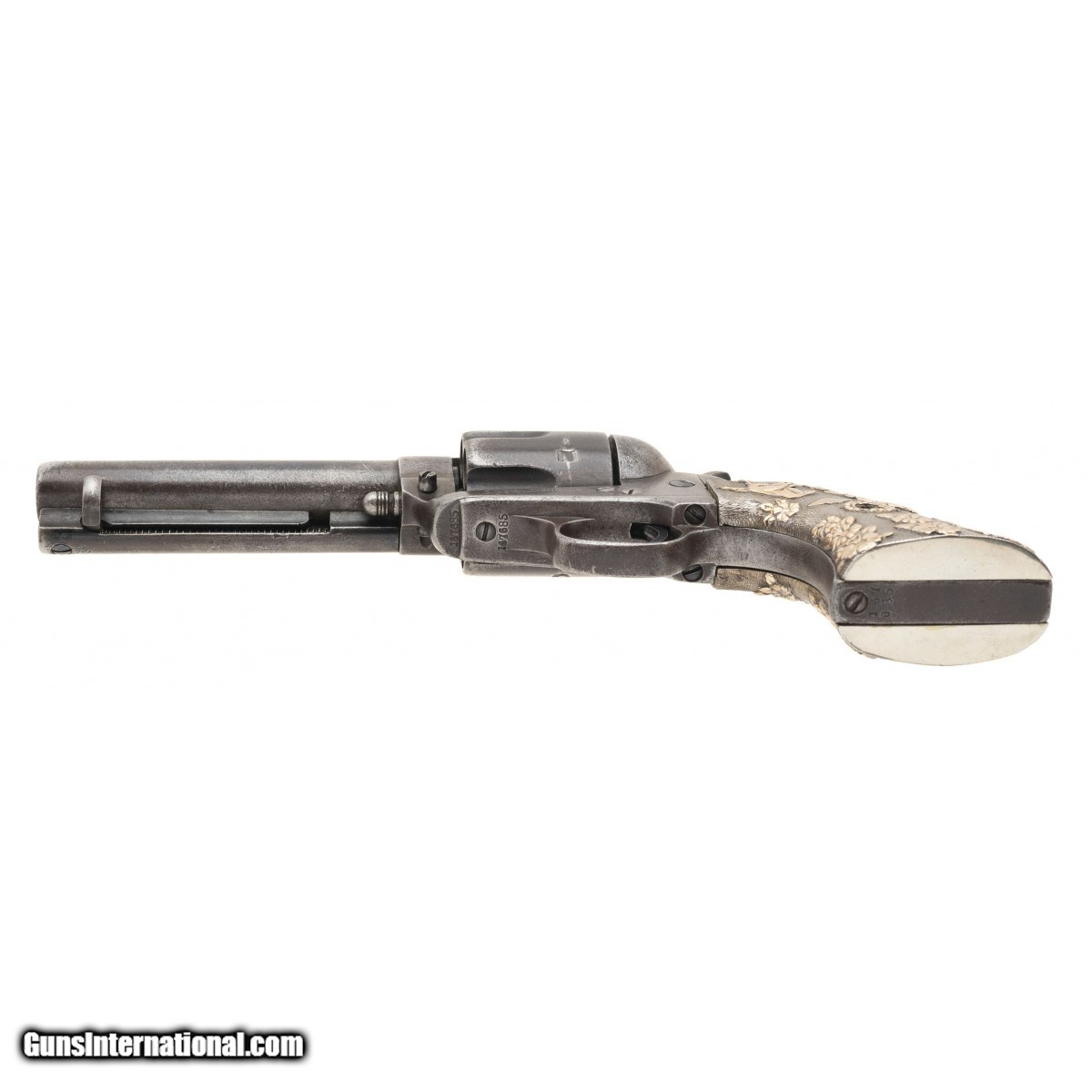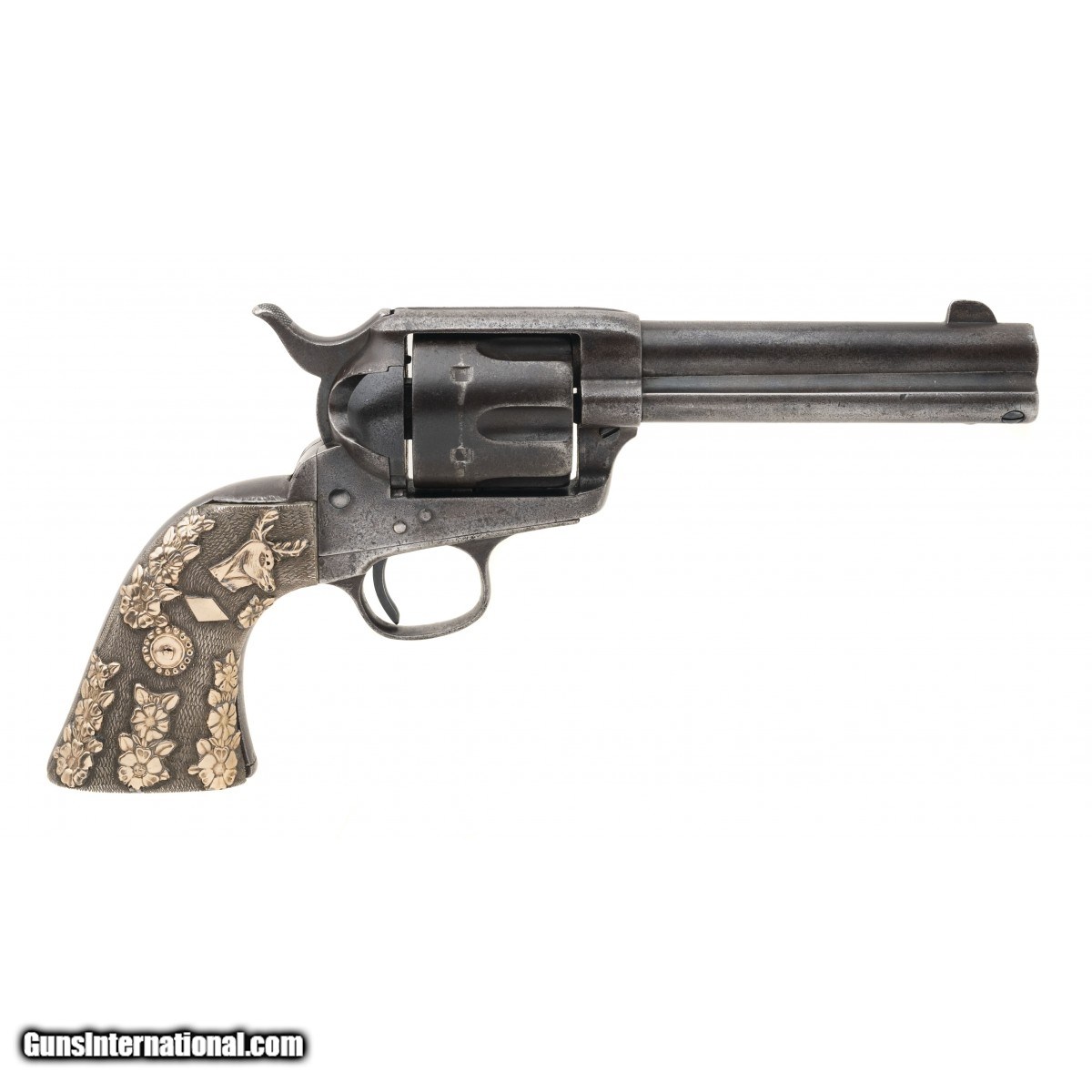 Description: "Serial number 167685. Made in 1896. 45 Colt with a 4 ¾" barrel. This gun has a brown to gray patina. Grips are silver with gold inlays. Along with this gun comes a Piteado Holster. The cartridge belt rig has carved leather. (Consignment) SOLD |