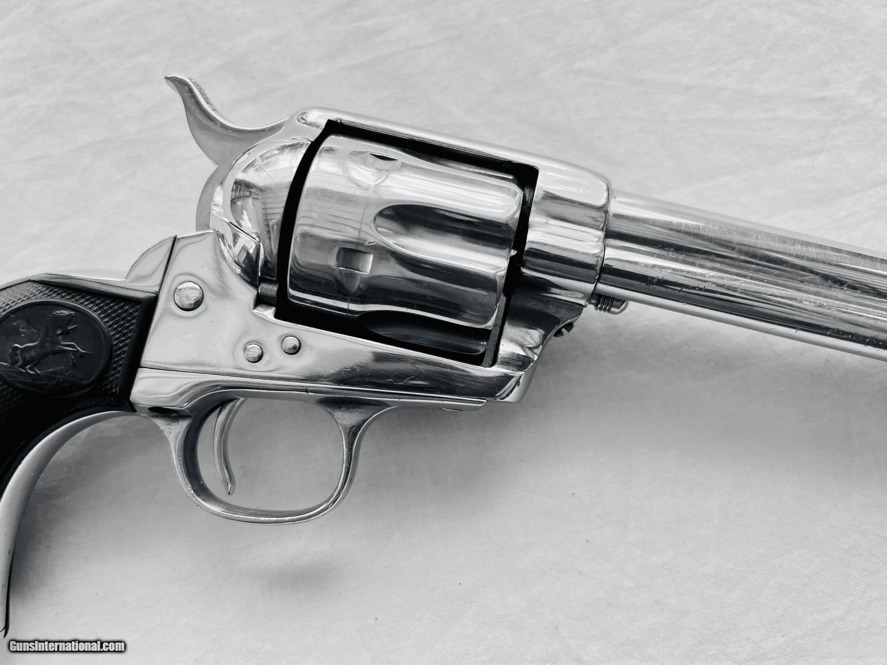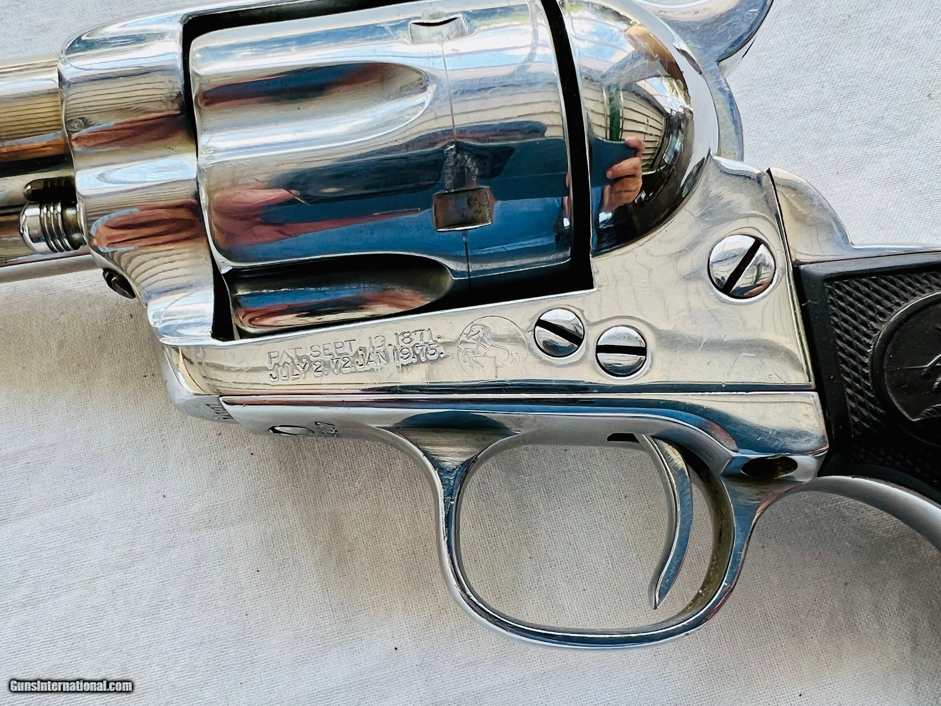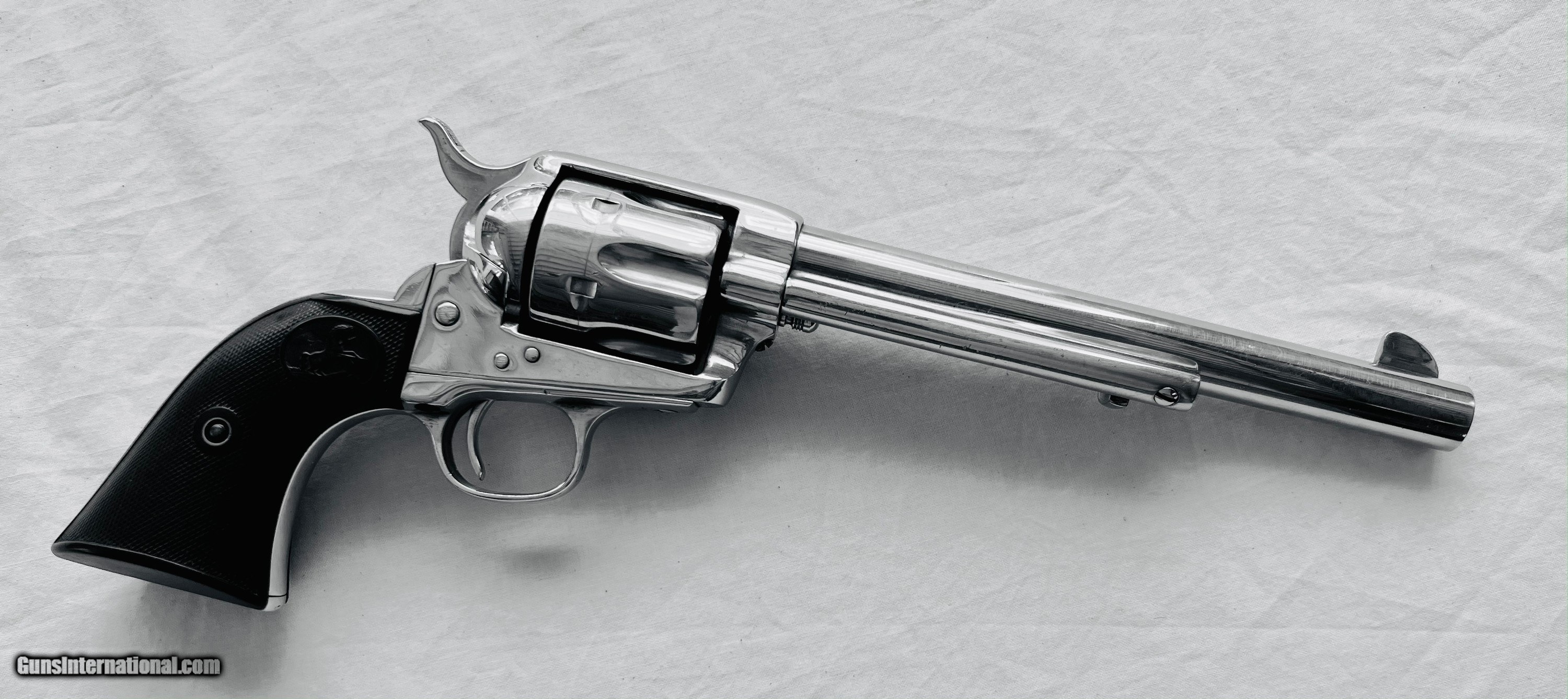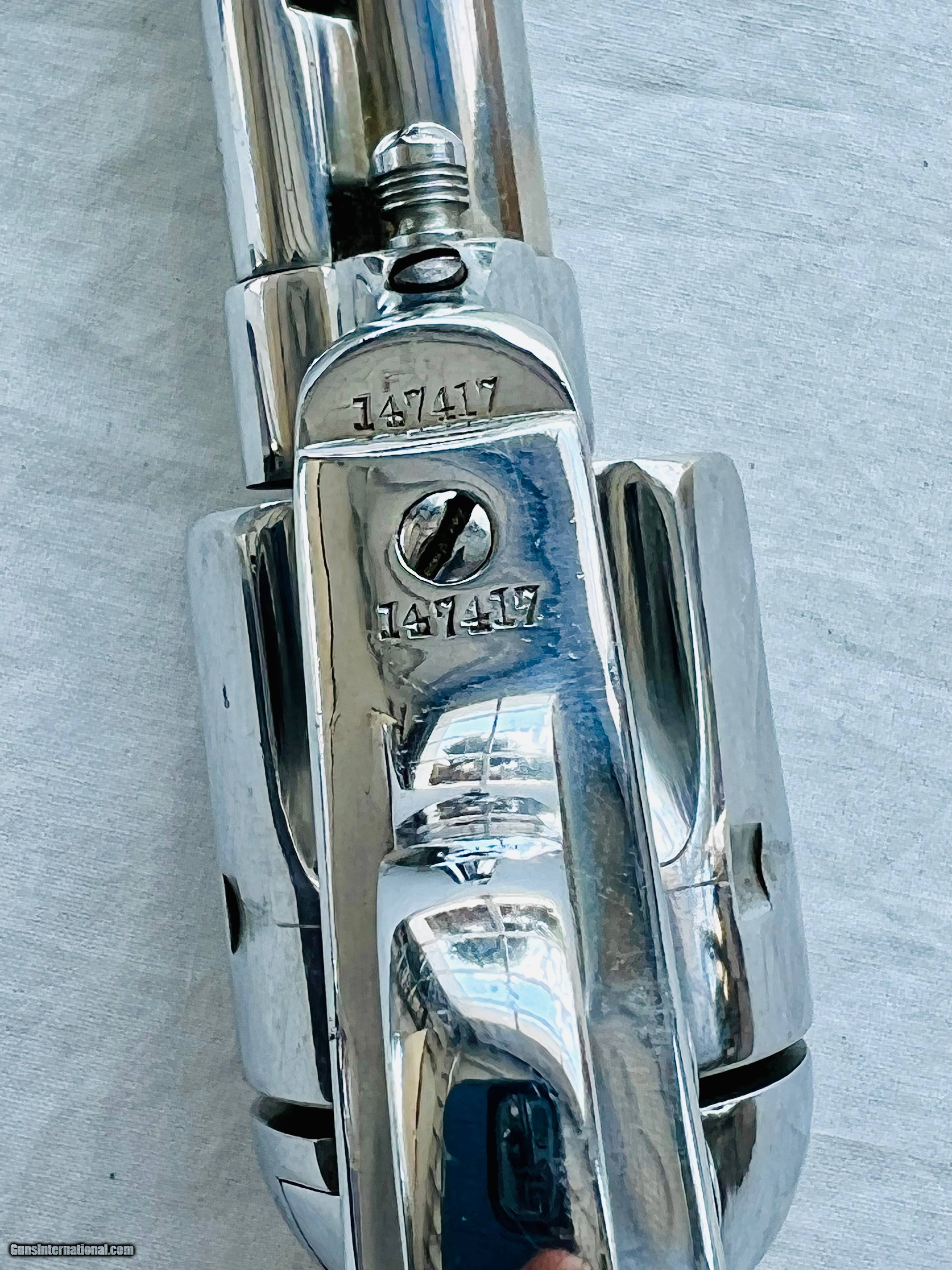 Description: Very Nice Antique 1st Generation Singe Action Army Revolver which has been professionally restored to a museum state. Serial number 147417 all matching except absent on cylinder. which indicates manufacture in 1892. Overall excellent in every way, action is flawless, grips are near perfect and finish is found in very high condition with some signs of handiling . Was found in a very old collection recently in the northeast. Overall a very nice SAA in excellent mechanical condition with great eye appeal. SOLD Antique: Yes Handgun Caliber: .45 Colt Manufacturer: Colt Model: Single Action Army Serial Number: 147417 Condition: Excellent as Refinished Metal Condition: Excellent Bore Condition: Good Action: Single Action Triggers: Single Finish: Nickel |
