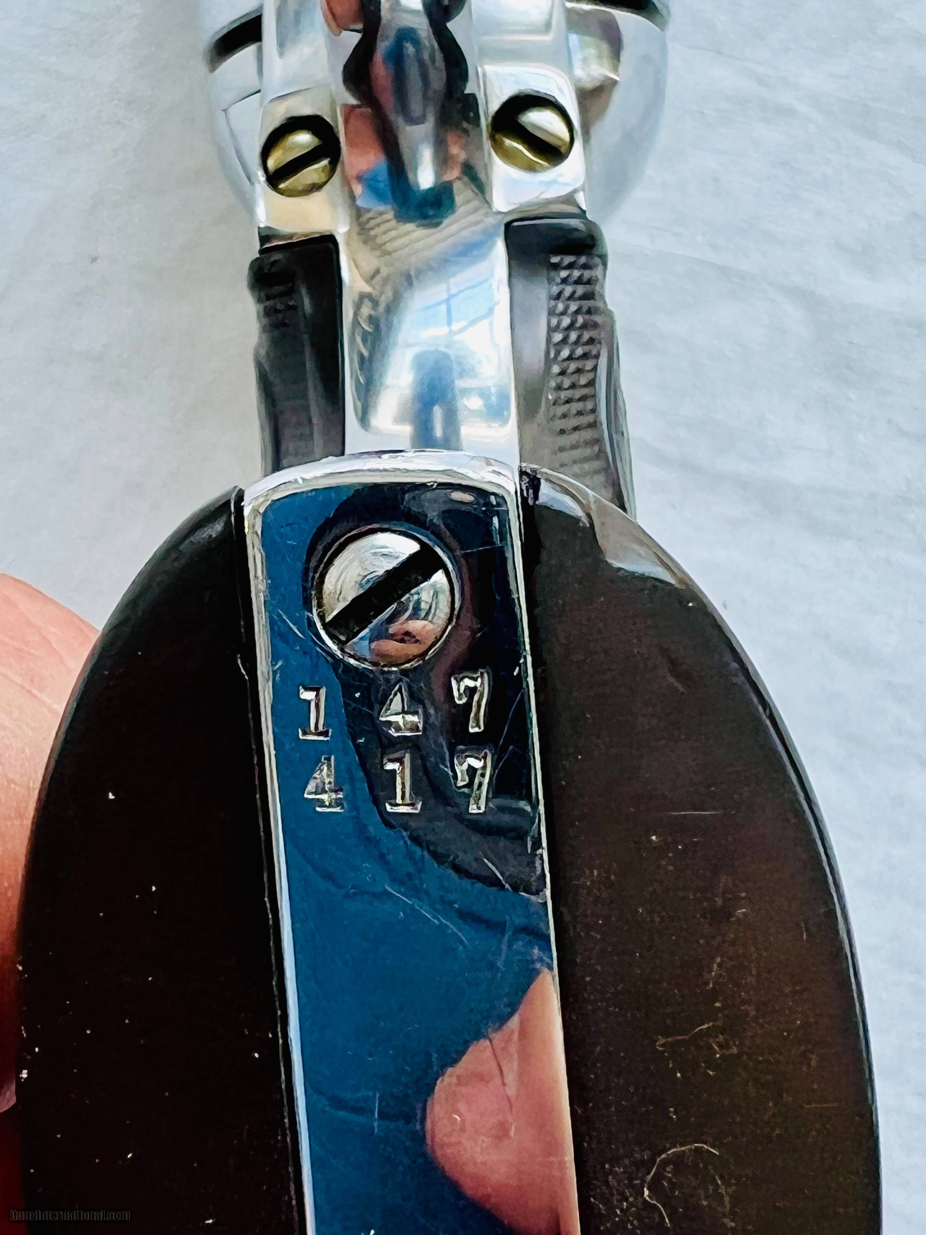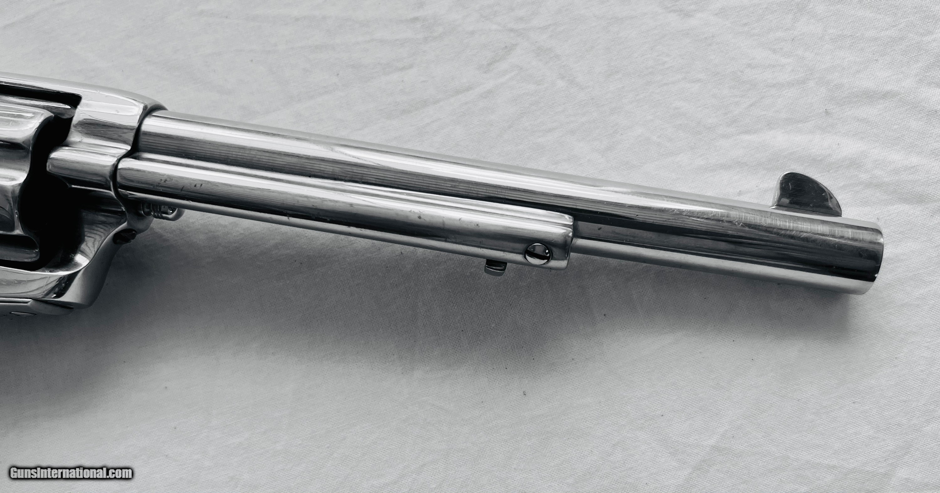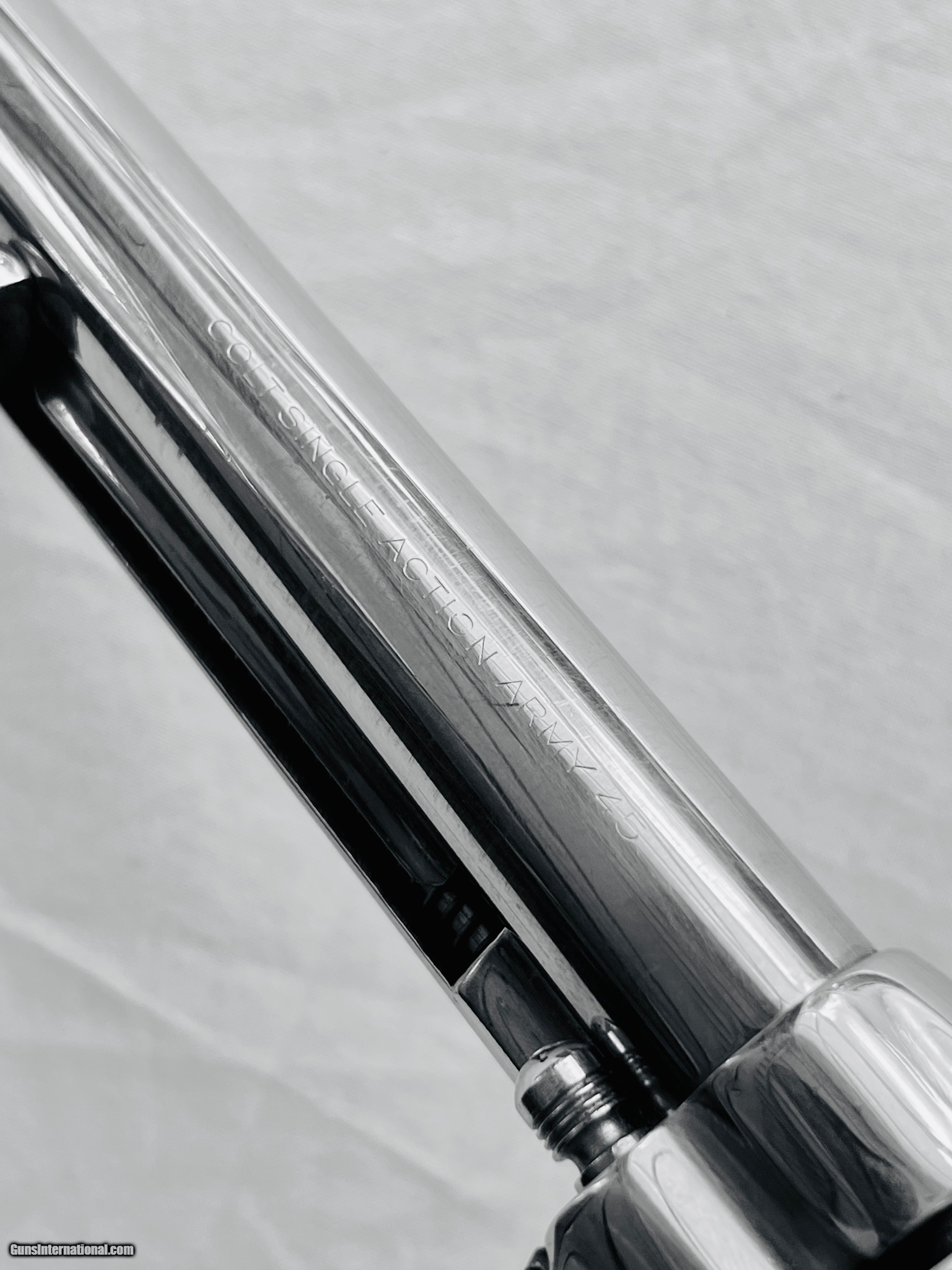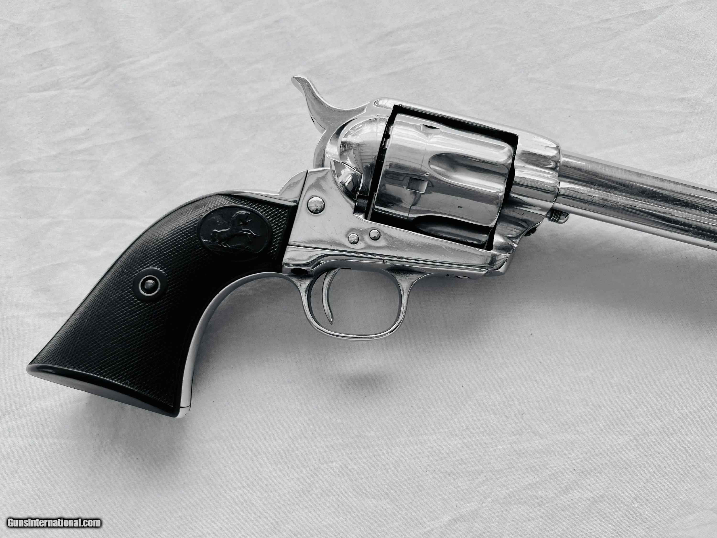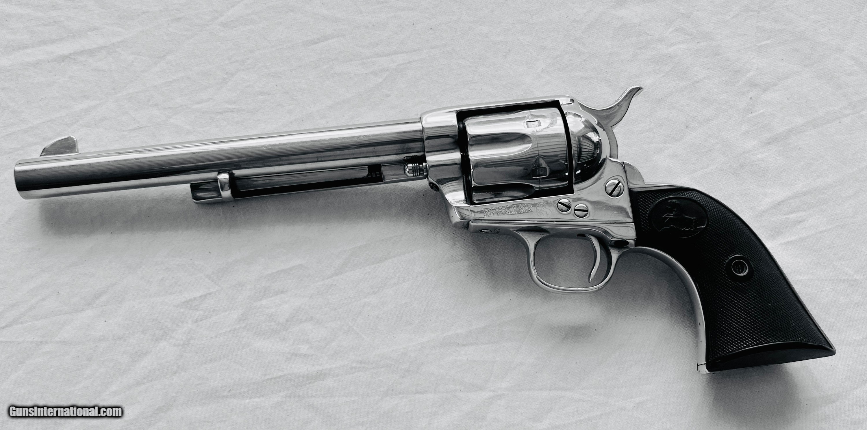 Description: Very Nice Antique 1st Generation Singe Action Army Revolver which has been professionally restored to a museum state. Serial number 147417 all matching except absent on cylinder. which indicates manufacture in 1892. Overall excellent in every way, action is flawless, grips are near perfect and finish is found in very high condition with some signs of handiling . Was found in a very old collection recently in the northeast. Overall a very nice SAA in excellent mechanical condition with great eye appeal. SOLD Antique: Yes Handgun Caliber: .45 Colt Manufacturer: Colt Model: Single Action Army Serial Number: 147417 Condition: Excellent as Refinished Metal Condition: Excellent Bore Condition: Good Action: Single Action Triggers: Single Finish: Nickel |