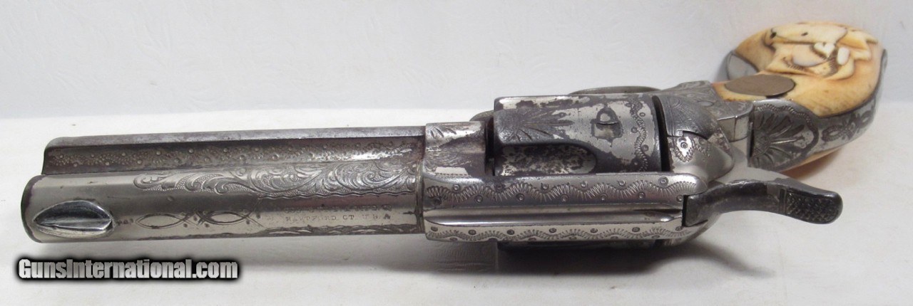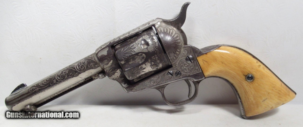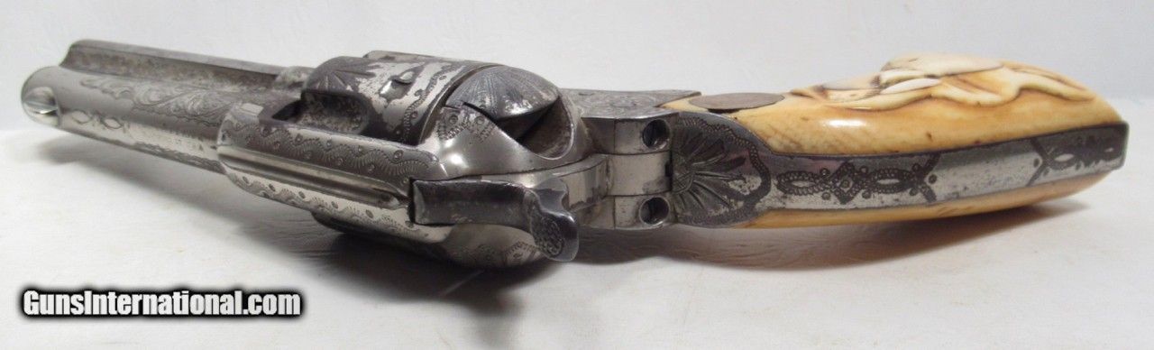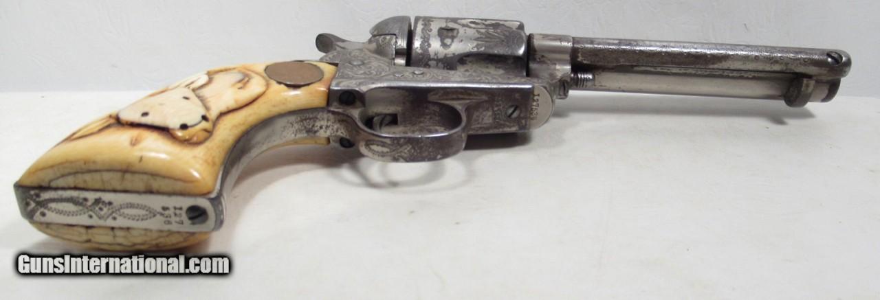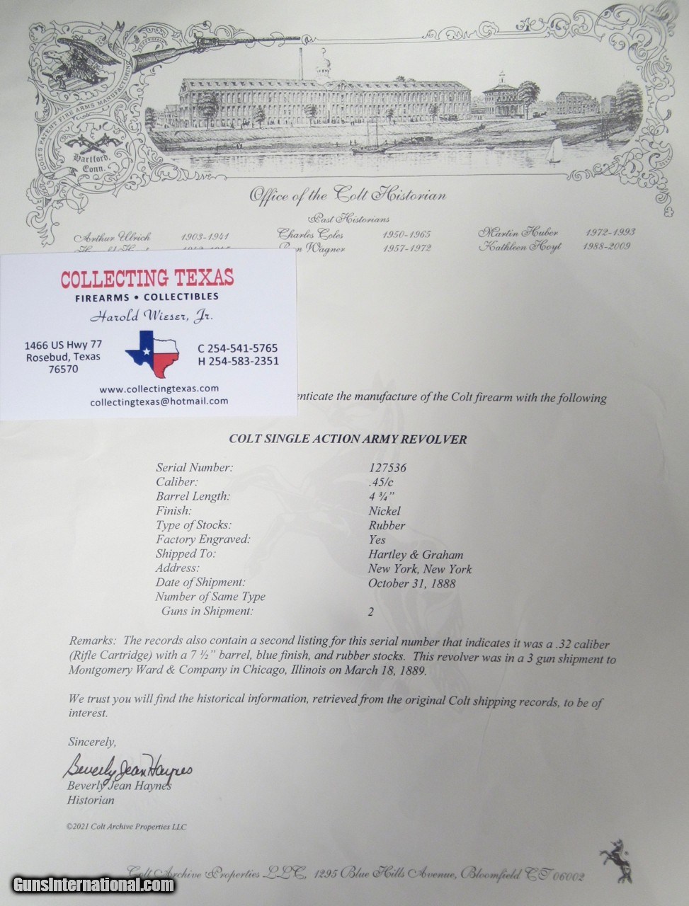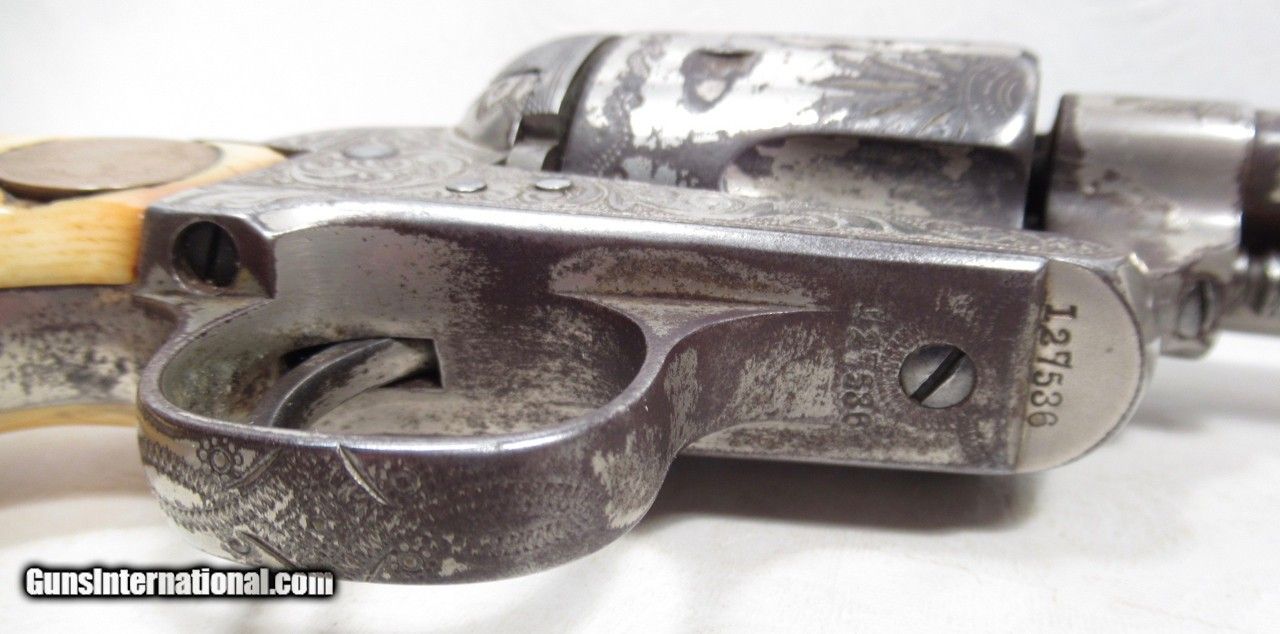 Description: Colt Single Action Army Revolver; Serial No. 127536; Per Included Factory Letter: Part of a 2 Gun Shipment to Colt Major Distributor Hartley & Graham, New York, NY on October 31, 1888; .45 Caliber with 4 ¾” Barrel, Nickel Finish, Rubber Grips, and FACTORY ENGRAVED; Good Amount of Original Factory Nickel Present; Front Sight is a Silver Inlay; Nice Colt Carved Ivory Grips; Fantastic Engraving; Perfect Action and Very Strong Bore with light Black Powder pitting; Gun Surfaced in Houston, Texas in 2021; Beautiful, Colorful, Rare 134 Year-Old Texas Colt .45 S.A.A. Revolver; See All Photos for Condition; No Texts; Call (254)541-5765 or Email Only; PERSONAL PROPERTY of Harold Wieser; Price: $39,975 + $45 S&H Via USPS PRIORITY MAIL; Payment Address: Harold Wieser - 1466 U.S. Hwy 77 - Rosebud, TX 76570; SEND PAYMENTS VIA USPS PRIORITY MAIL; BEWARE of SCAMS!!! – DO NOT SEND MONEY or CORRESPONDENTS ELECTRONICALLY UNLESS YOU HAVE SPOKEN to HAROLD WIESER FIRST! 254-541-5765 SOLD Antique: Yes Manufacturer: Colt Model: 1873 Serial Number: 127536 |