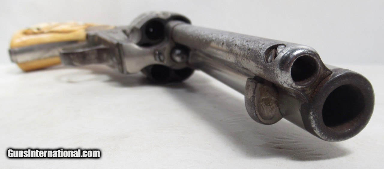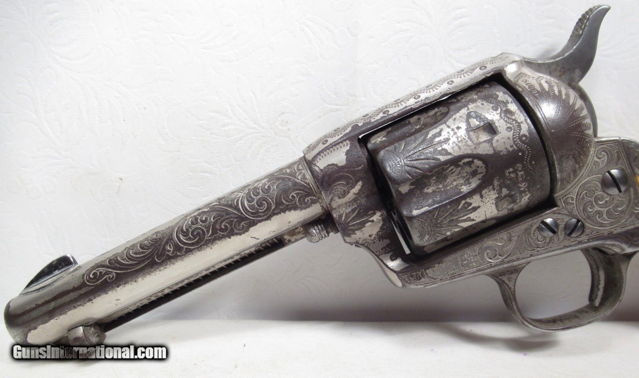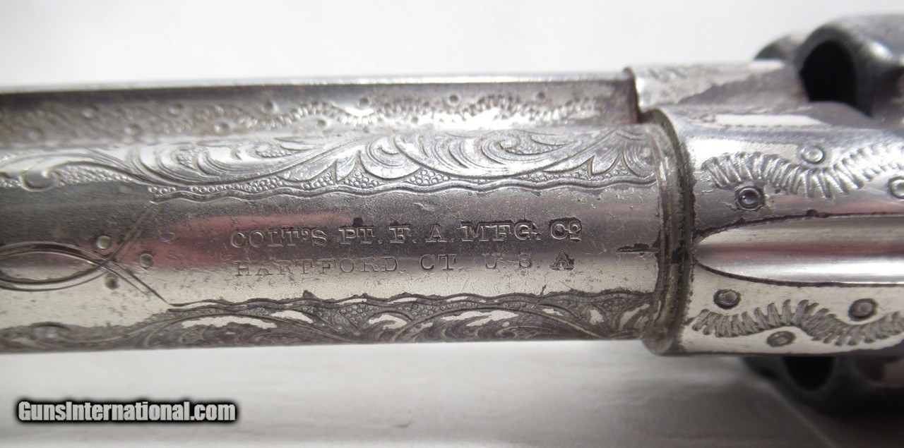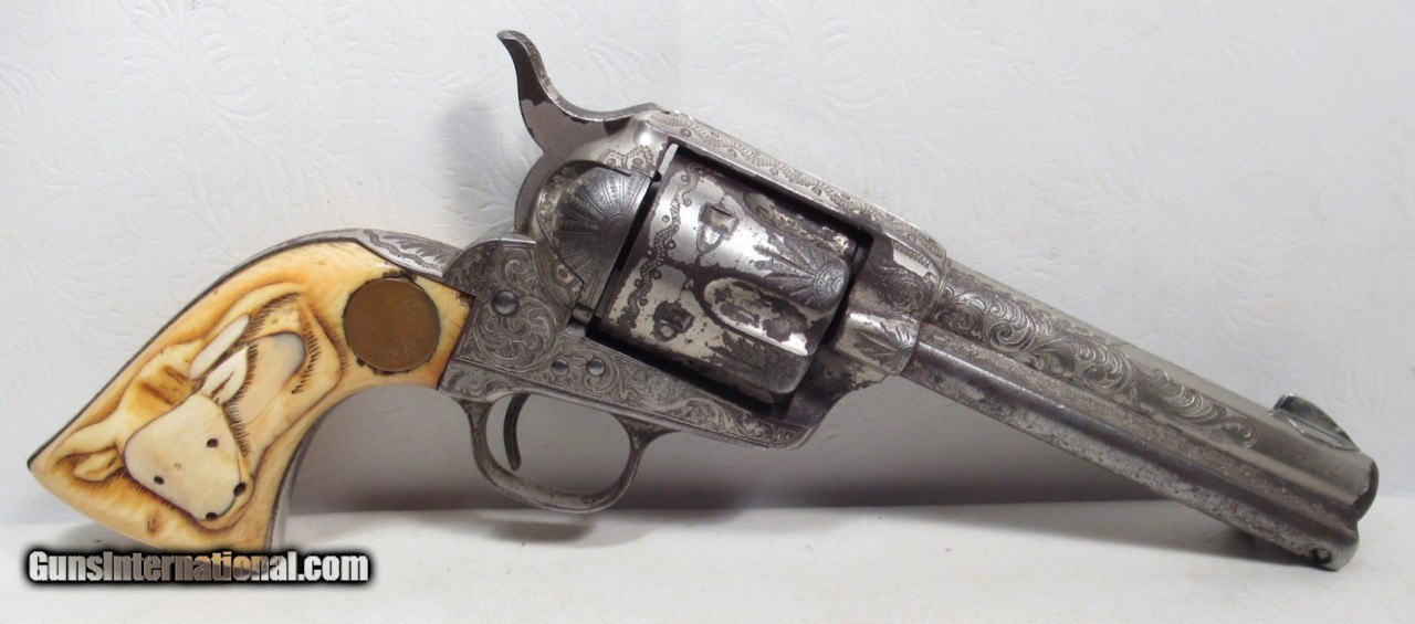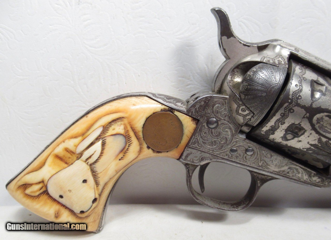 Description: Colt Single Action Army Revolver; Serial No. 127536; Per Included Factory Letter: Part of a 2 Gun Shipment to Colt Major Distributor Hartley & Graham, New York, NY on October 31, 1888; .45 Caliber with 4 ¾” Barrel, Nickel Finish, Rubber Grips, and FACTORY ENGRAVED; Good Amount of Original Factory Nickel Present; Front Sight is a Silver Inlay; Nice Colt Carved Ivory Grips; Fantastic Engraving; Perfect Action and Very Strong Bore with light Black Powder pitting; Gun Surfaced in Houston, Texas in 2021; Beautiful, Colorful, Rare 134 Year-Old Texas Colt .45 S.A.A. Revolver; See All Photos for Condition; No Texts; Call (254)541-5765 or Email Only; PERSONAL PROPERTY of Harold Wieser; Price: $39,975 + $45 S&H Via USPS PRIORITY MAIL; Payment Address: Harold Wieser - 1466 U.S. Hwy 77 - Rosebud, TX 76570; SEND PAYMENTS VIA USPS PRIORITY MAIL; BEWARE of SCAMS!!! – DO NOT SEND MONEY or CORRESPONDENTS ELECTRONICALLY UNLESS YOU HAVE SPOKEN to HAROLD WIESER FIRST! 254-541-5765 SOLD Antique: Yes Manufacturer: Colt Model: 1873 Serial Number: 127536 |