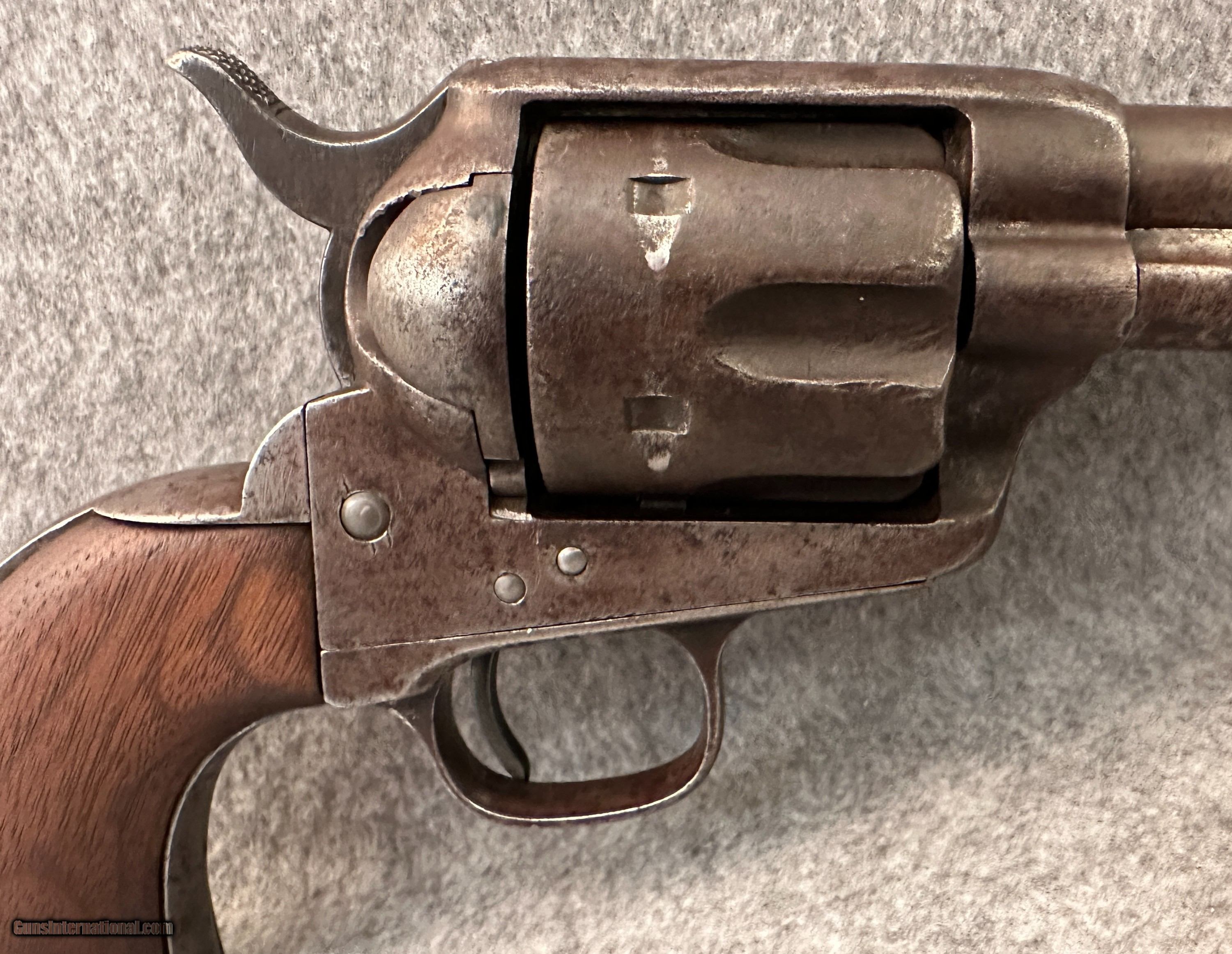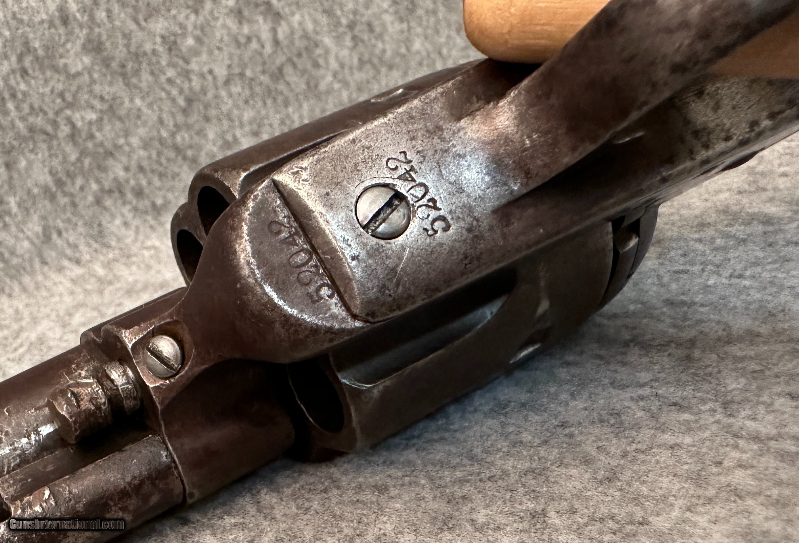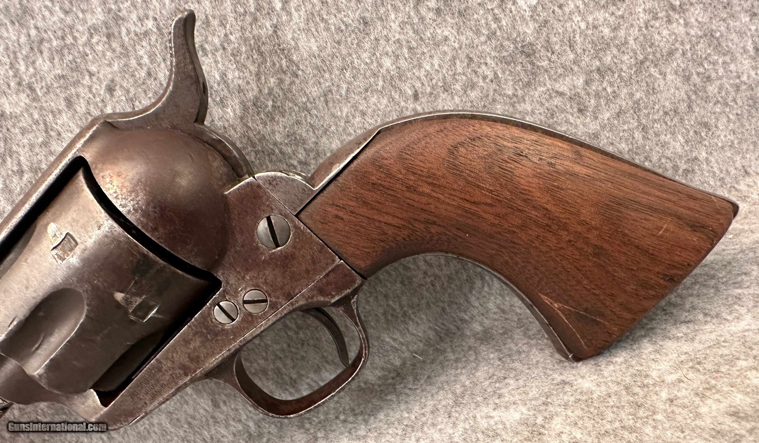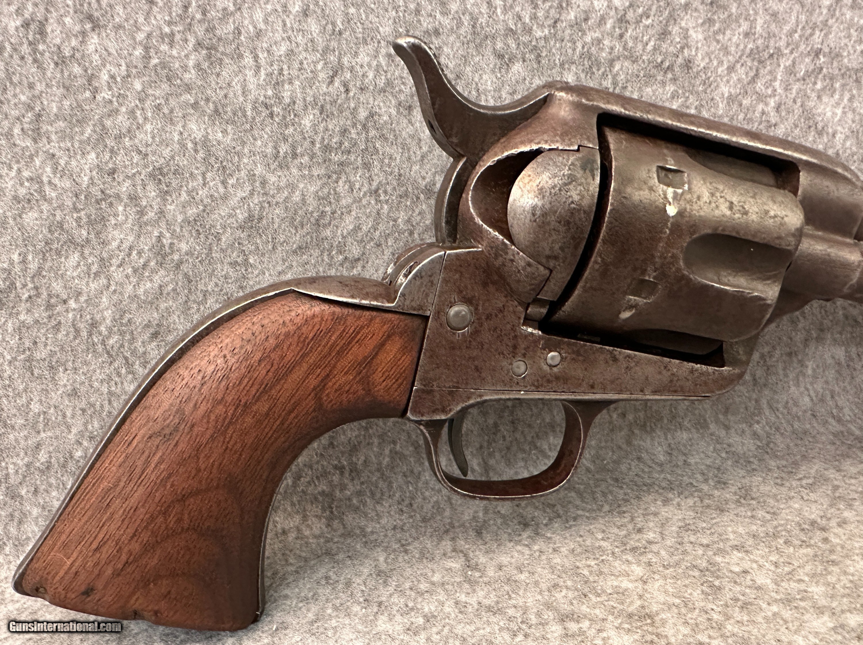 Description: Very nice example of a 1st generation Colt 1873 SAA in .44 Caliber with original wood one piece grips & matching serial numbers. 5 digit serial number, possibly 1879 date of manufacture. 44 CF appears on the left top trigger guard Barrel is 7 1/2 inches Metal is pretty well aged and faded although all original and untouched. Action is in very good condition for the age, 4 clicks with no slop or movement of the hammer, timing is perfect, functions without any flaws or hooks ups. Bore is very good for a gun of this age and will make a fine shooter. Overall not much known about this gun, grips have not been removed to check for any inscriptions or notoriety, a Colt letter would settle the score. SOLD Handgun Caliber: .44-40 Winchester (.44 WCF) |