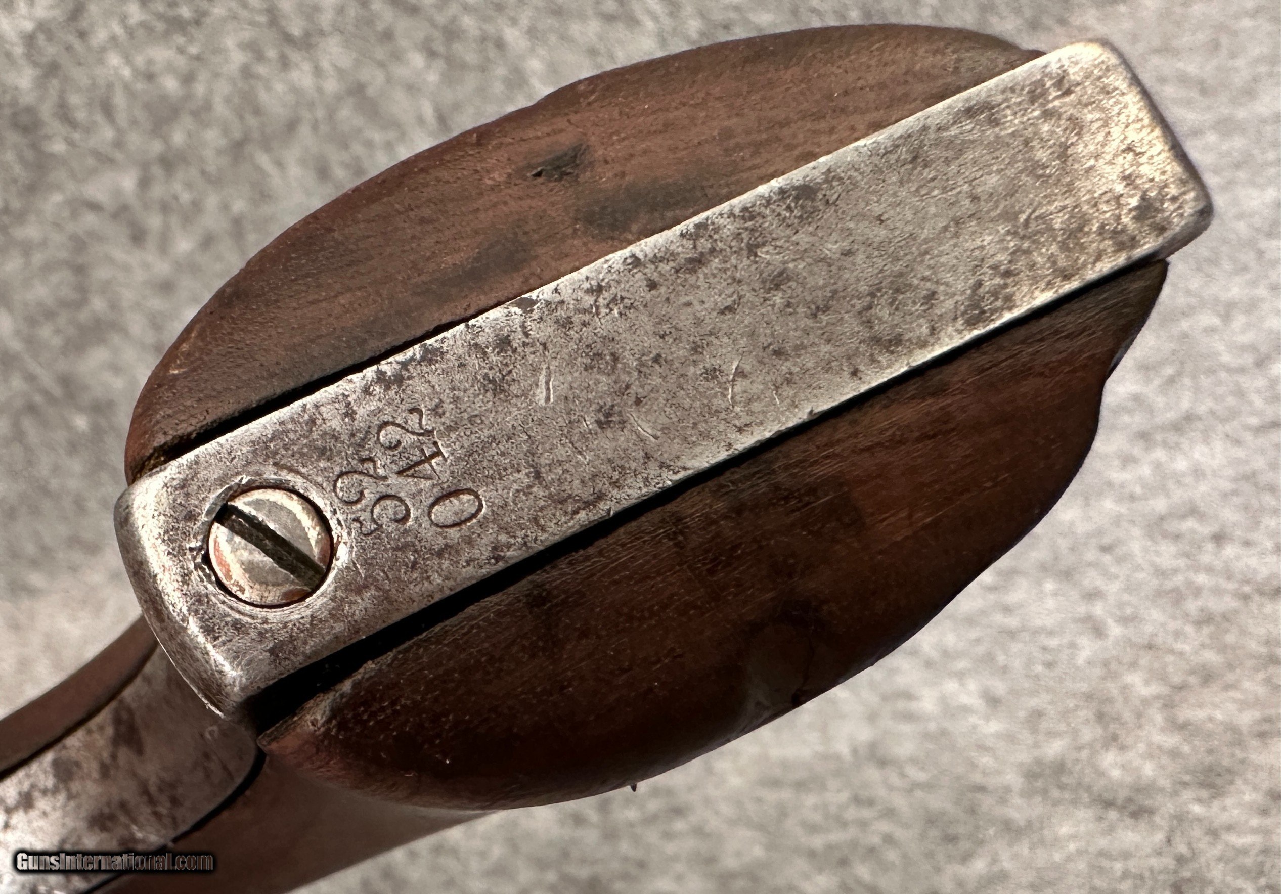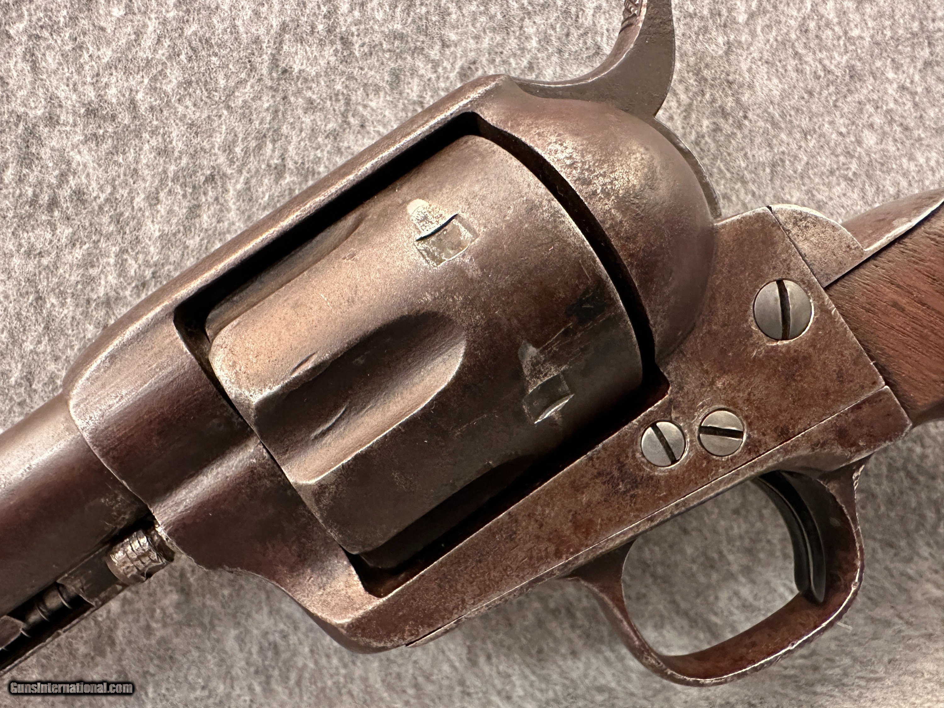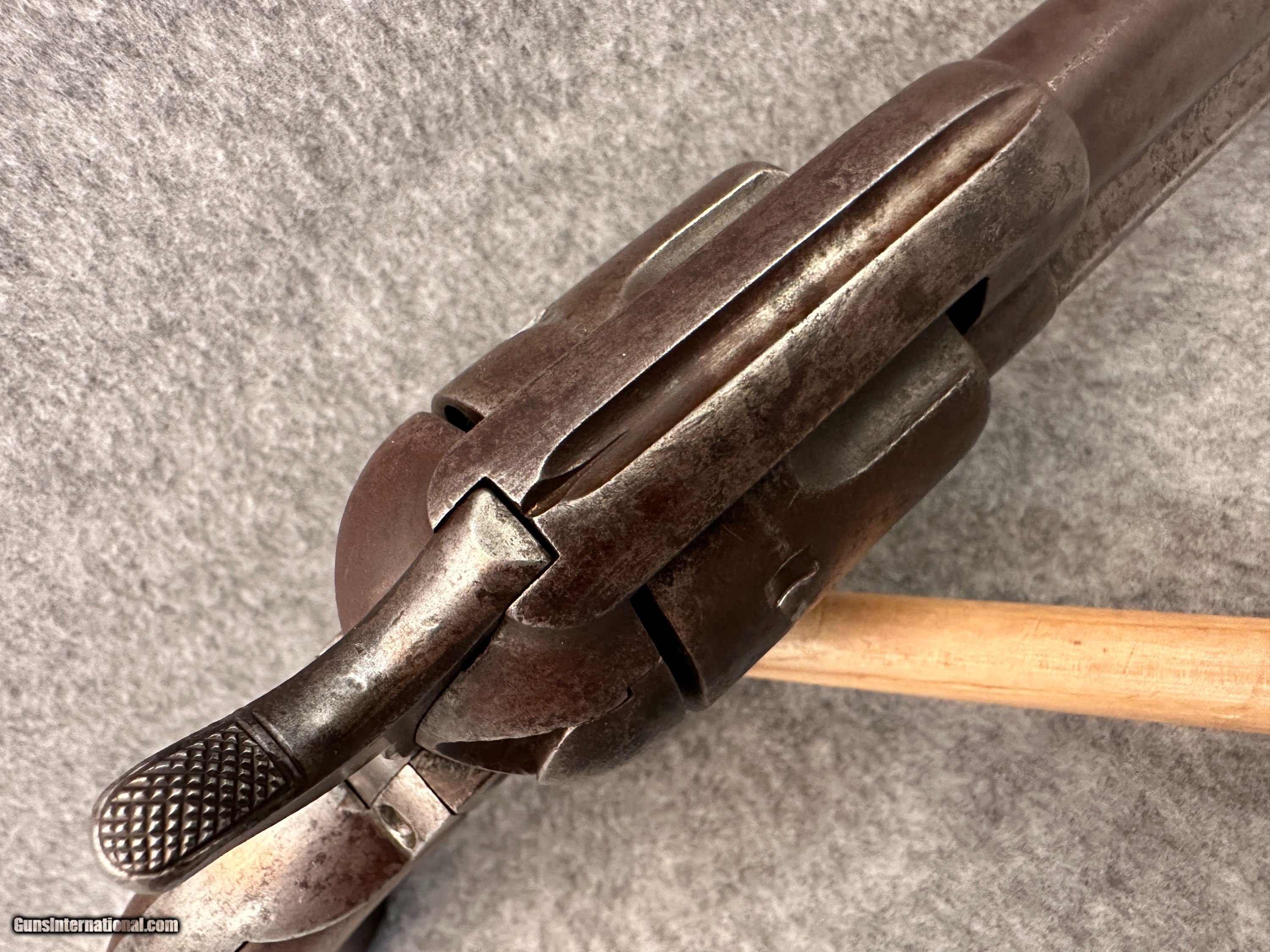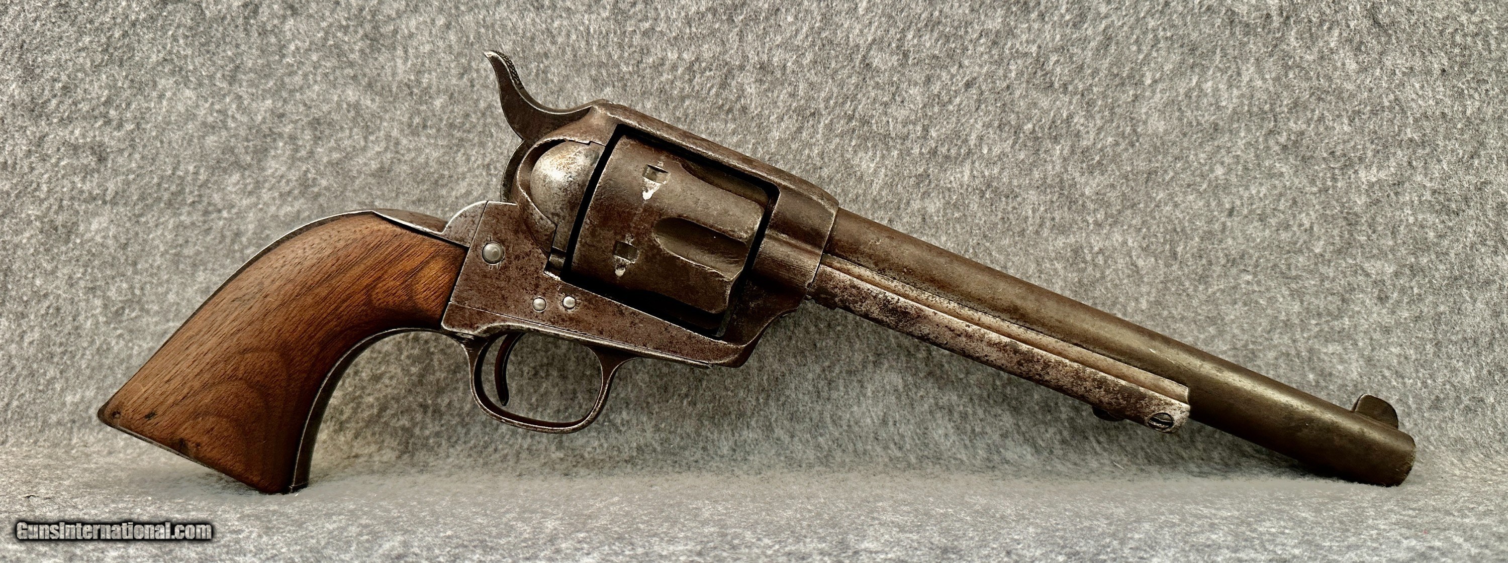 Description: Very nice example of a 1st generation Colt 1873 SAA in .44 Caliber with original wood one piece grips & matching serial numbers. 5 digit serial number, possibly 1879 date of manufacture. 44 CF appears on the left top trigger guard Barrel is 7 1/2 inches Metal is pretty well aged and faded although all original and untouched. Action is in very good condition for the age, 4 clicks with no slop or movement of the hammer, timing is perfect, functions without any flaws or hooks ups. Bore is very good for a gun of this age and will make a fine shooter. Overall not much known about this gun, grips have not been removed to check for any inscriptions or notoriety, a Colt letter would settle the score. SOLD Handgun Caliber: .44-40 Winchester (.44 WCF) |