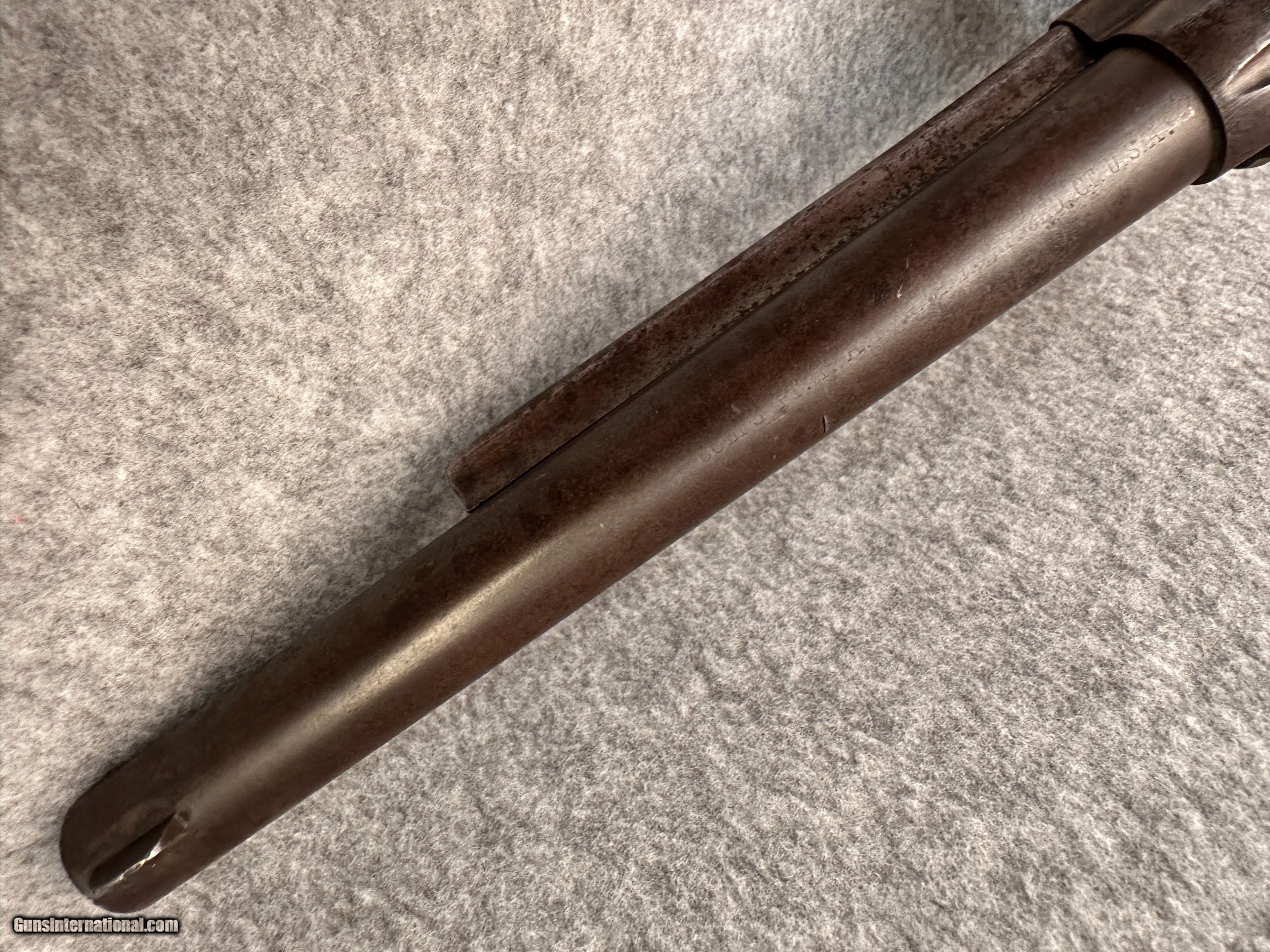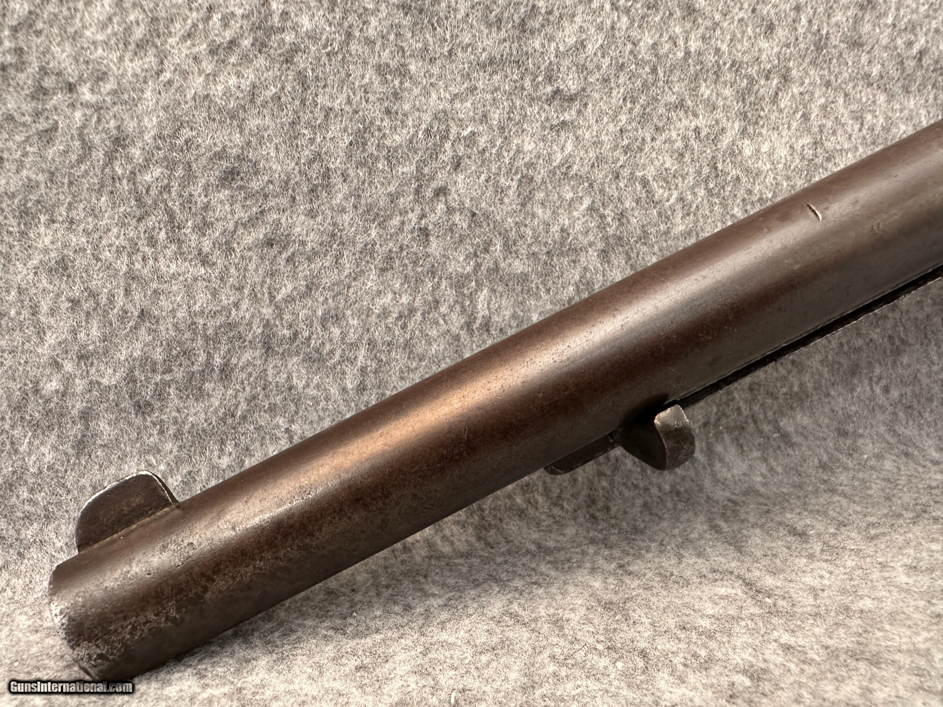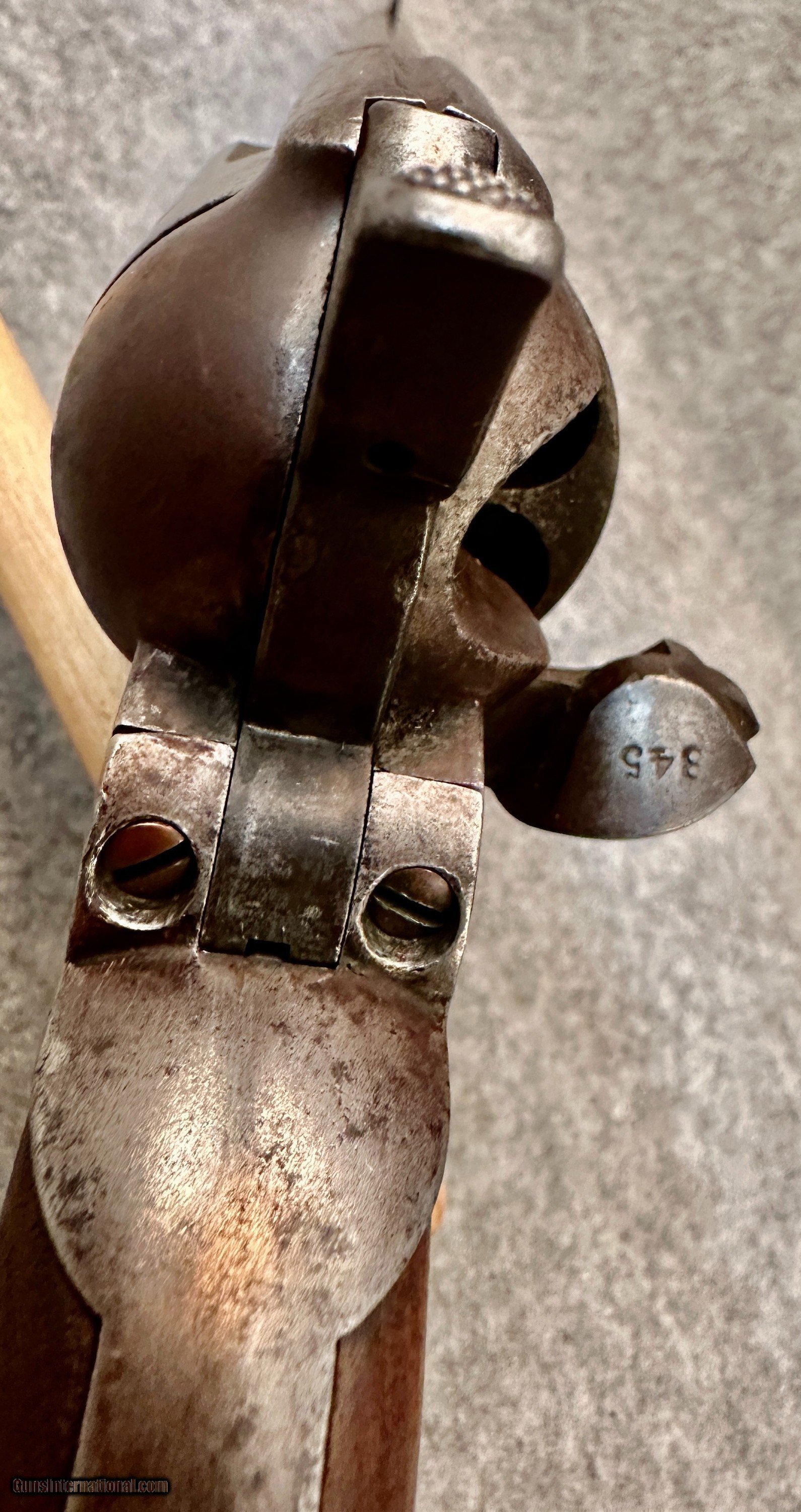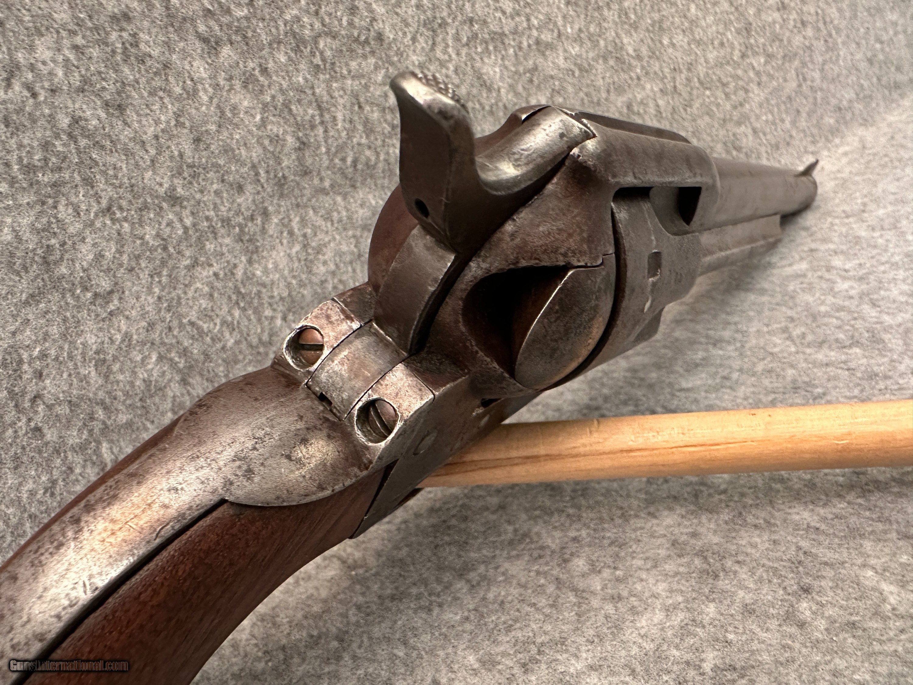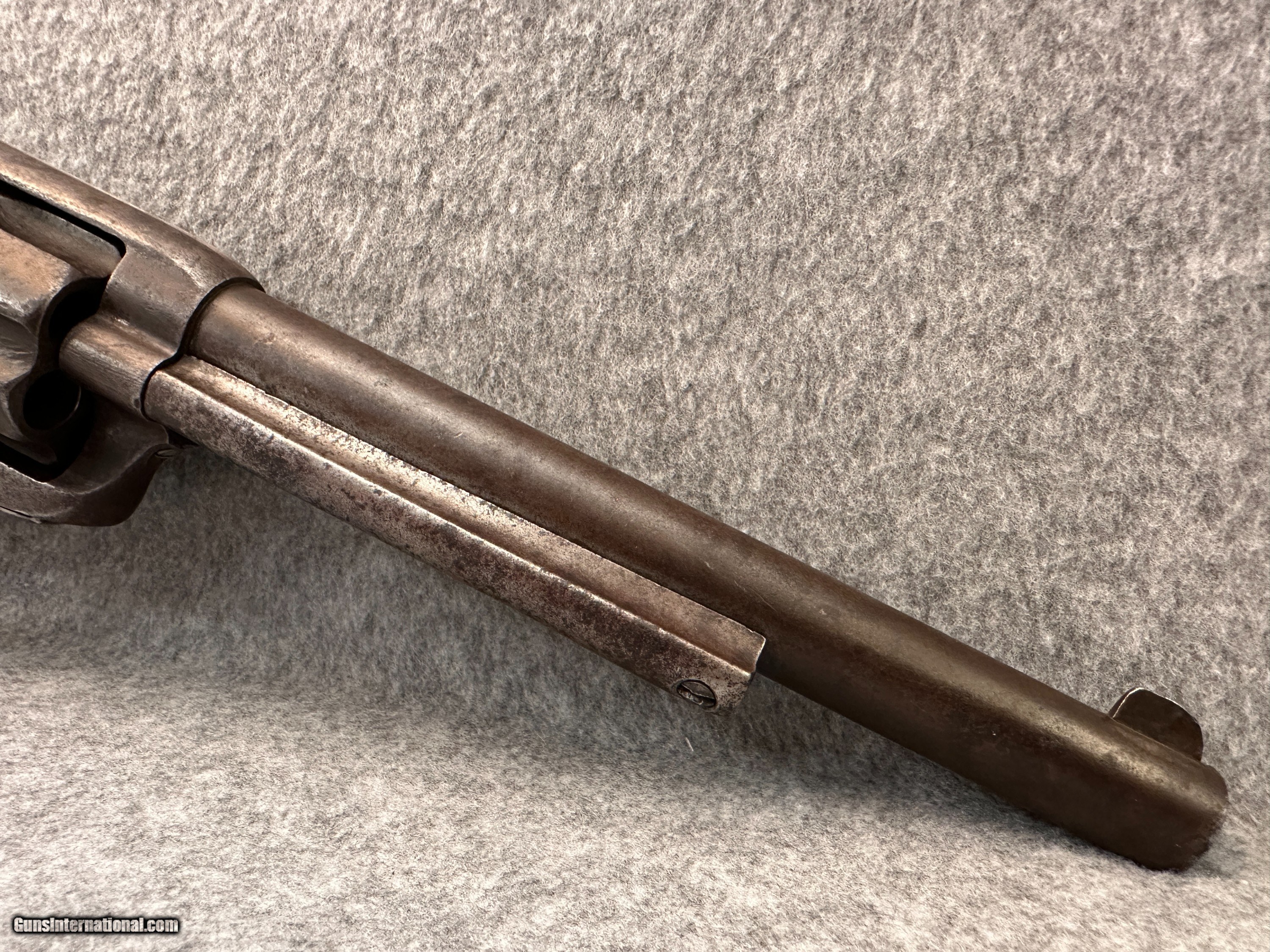 Description: Very nice example of a 1st generation Colt 1873 SAA in .44 Caliber with original wood one piece grips & matching serial numbers. 5 digit serial number, possibly 1879 date of manufacture. 44 CF appears on the left top trigger guard Barrel is 7 1/2 inches Metal is pretty well aged and faded although all original and untouched. Action is in very good condition for the age, 4 clicks with no slop or movement of the hammer, timing is perfect, functions without any flaws or hooks ups. Bore is very good for a gun of this age and will make a fine shooter. Overall not much known about this gun, grips have not been removed to check for any inscriptions or notoriety, a Colt letter would settle the score. SOLD Handgun Caliber: .44-40 Winchester (.44 WCF) |