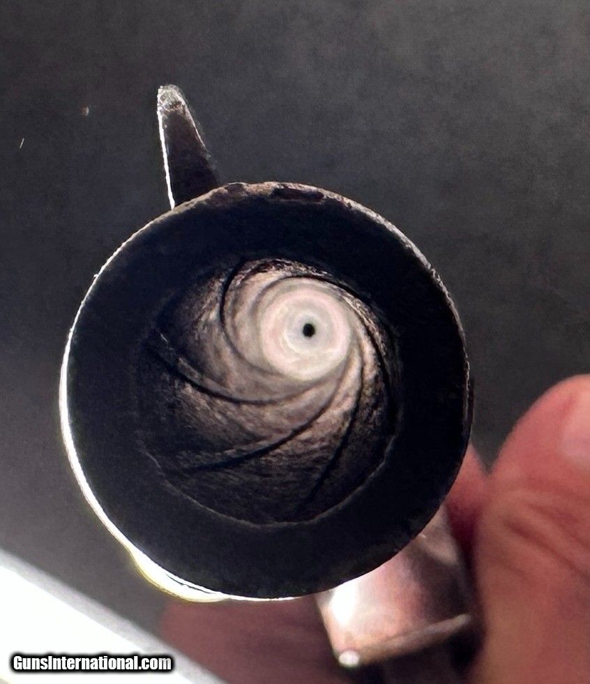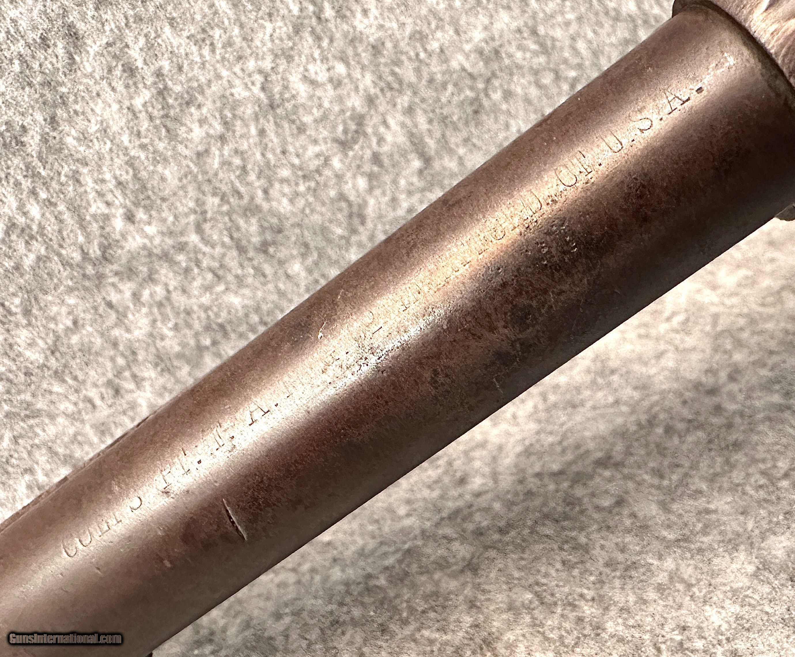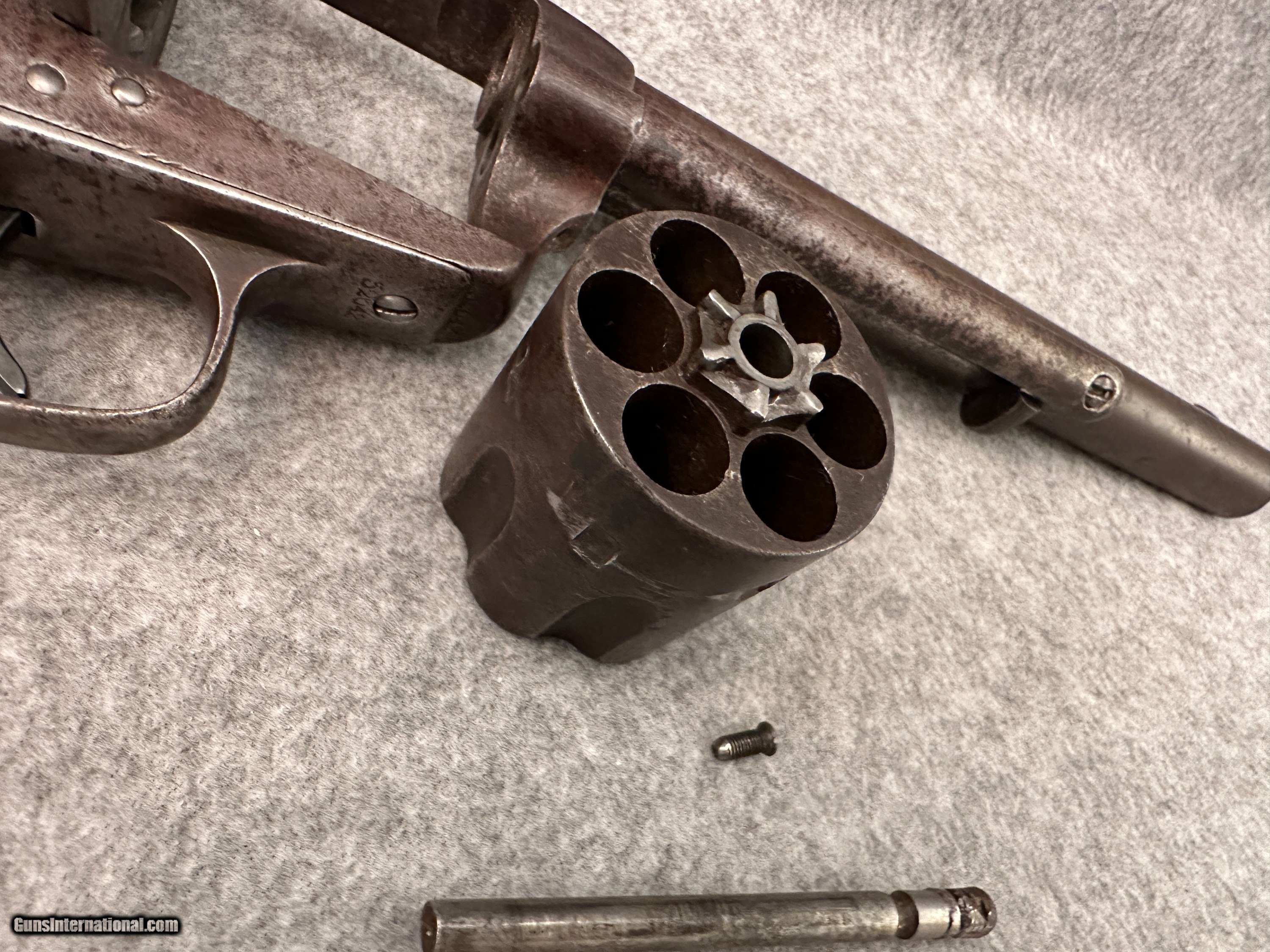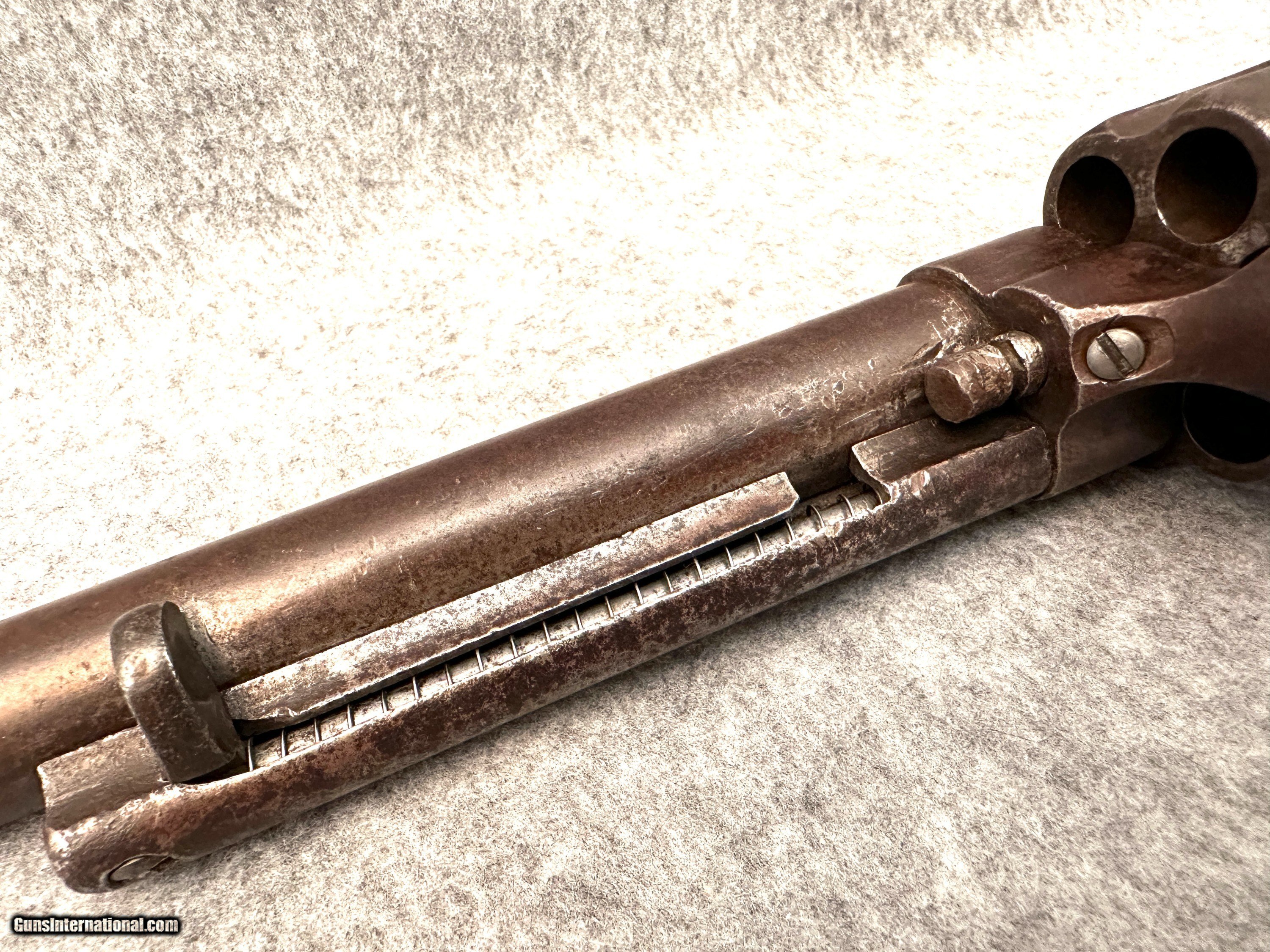 Description: Very nice example of a 1st generation Colt 1873 SAA in .44 Caliber with original wood one piece grips & matching serial numbers. 5 digit serial number, possibly 1879 date of manufacture. 44 CF appears on the left top trigger guard Barrel is 7 1/2 inches Metal is pretty well aged and faded although all original and untouched. Action is in very good condition for the age, 4 clicks with no slop or movement of the hammer, timing is perfect, functions without any flaws or hooks ups. Bore is very good for a gun of this age and will make a fine shooter. Overall not much known about this gun, grips have not been removed to check for any inscriptions or notoriety, a Colt letter would settle the score. SOLD Handgun Caliber: .44-40 Winchester (.44 WCF) |