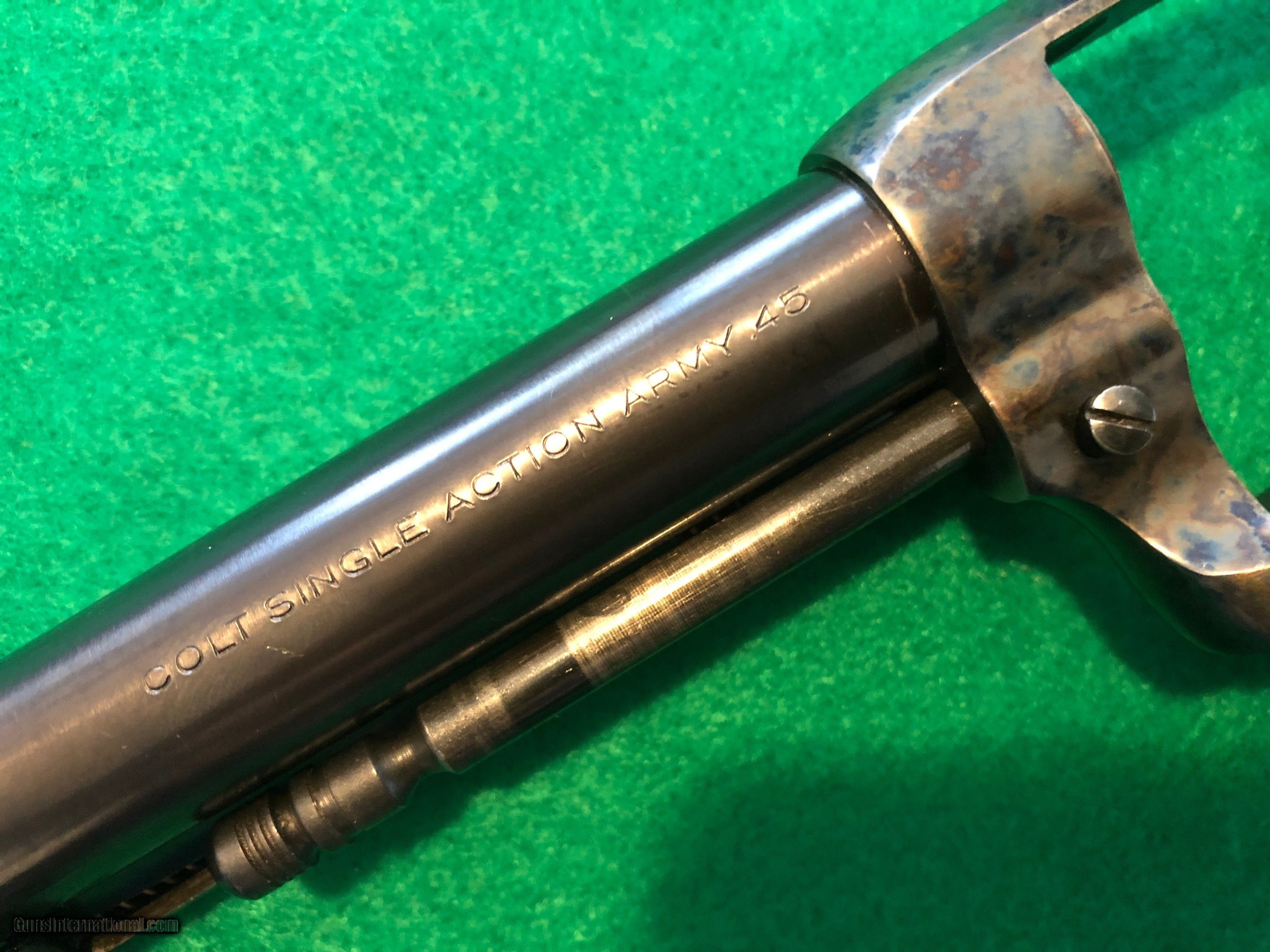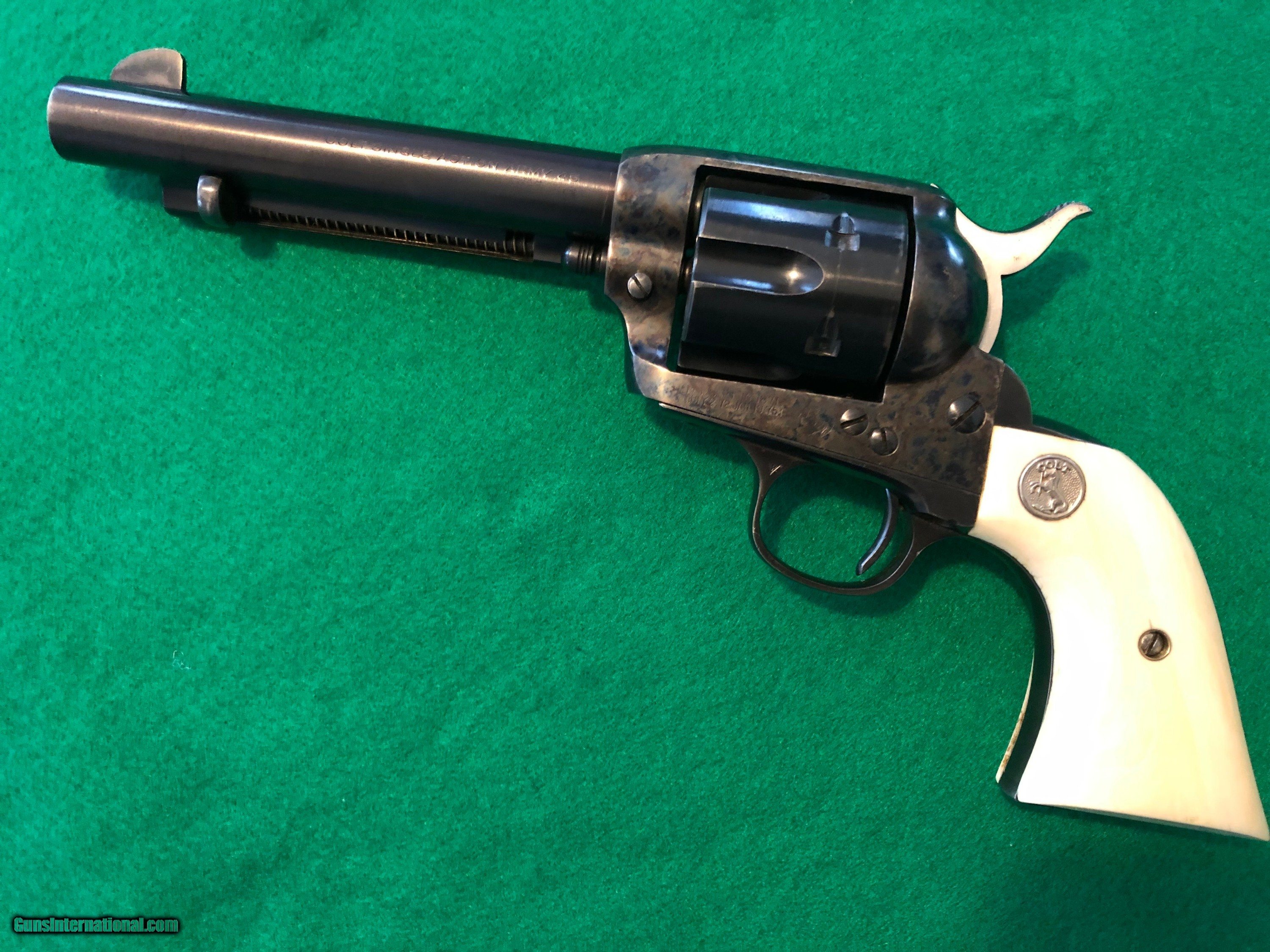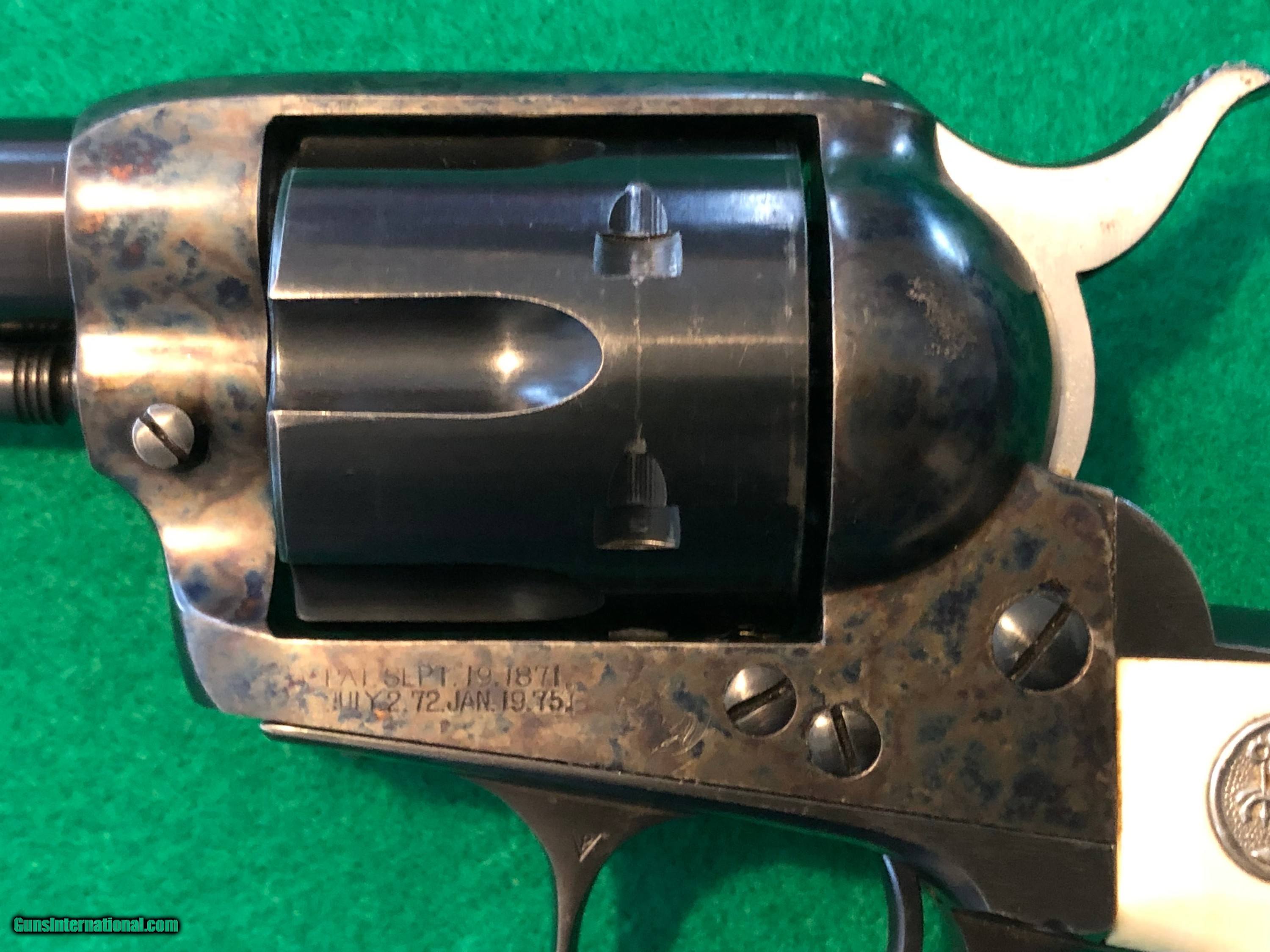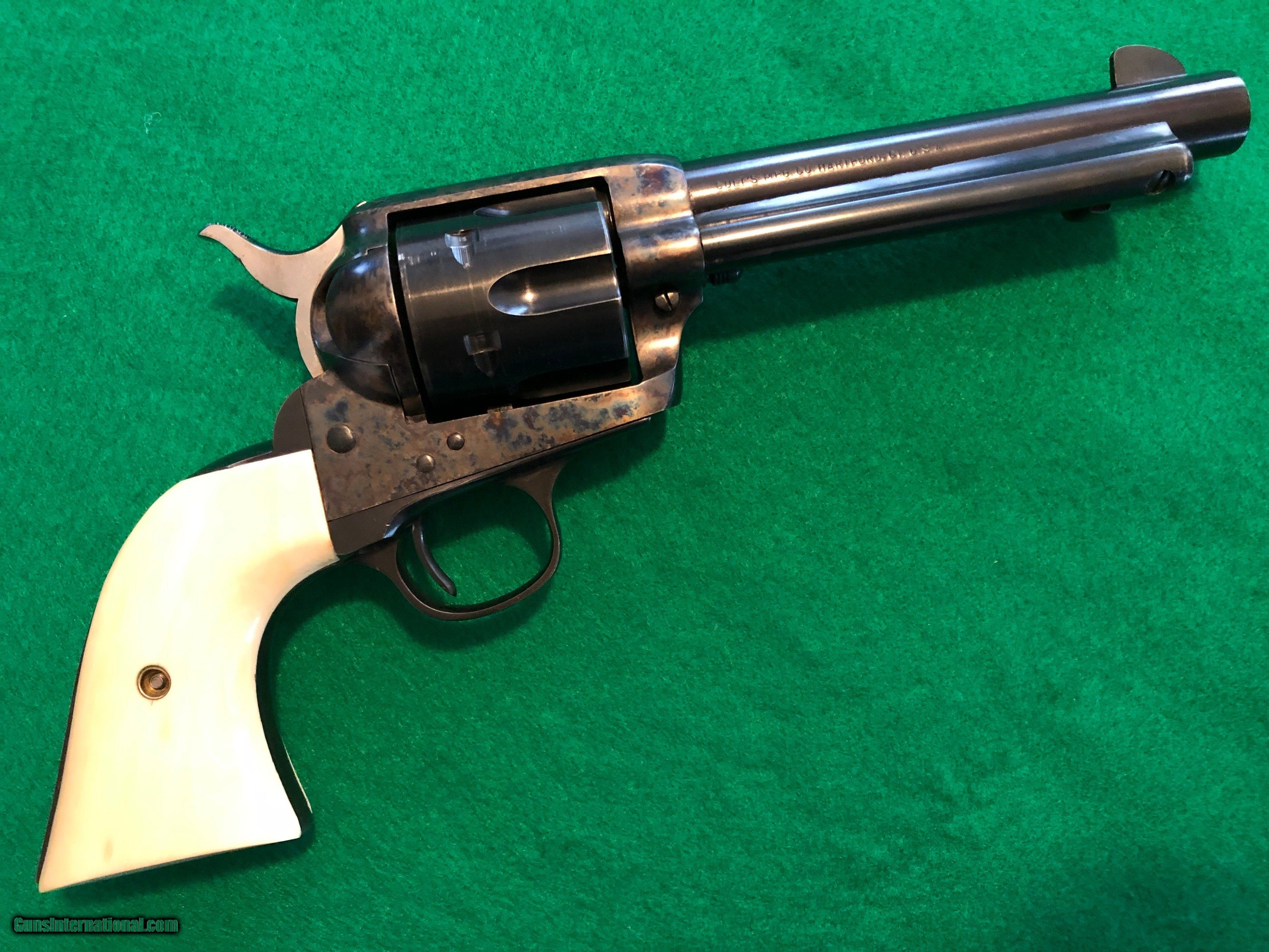 Colt 45 1st Gen 5-1/2" SAA Single Action Army, CA OK!  Description: Nice shooter grade 1st Gen Single Action Colt 45. Almost certainly replacement barrel and cylinder, redone case colors, reblued grip frame. Excellent bore, rifling, chambers. Great action and lock up. And have you noticed...those grips?! Great looking package, ready for a new home. Ser#2258xx matching # across frame, grip frame, backstrap. Ser# places it around 1902 Email or call for more info. CA sales welcome. C&R OK in most areas. FFL needed to ship. SOLD Handgun Caliber: .45 Colt |