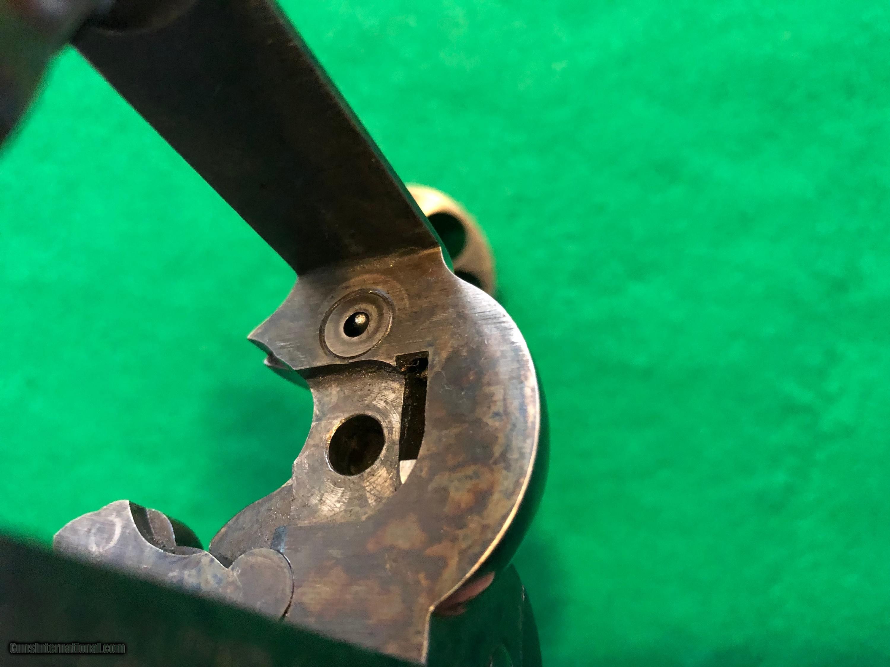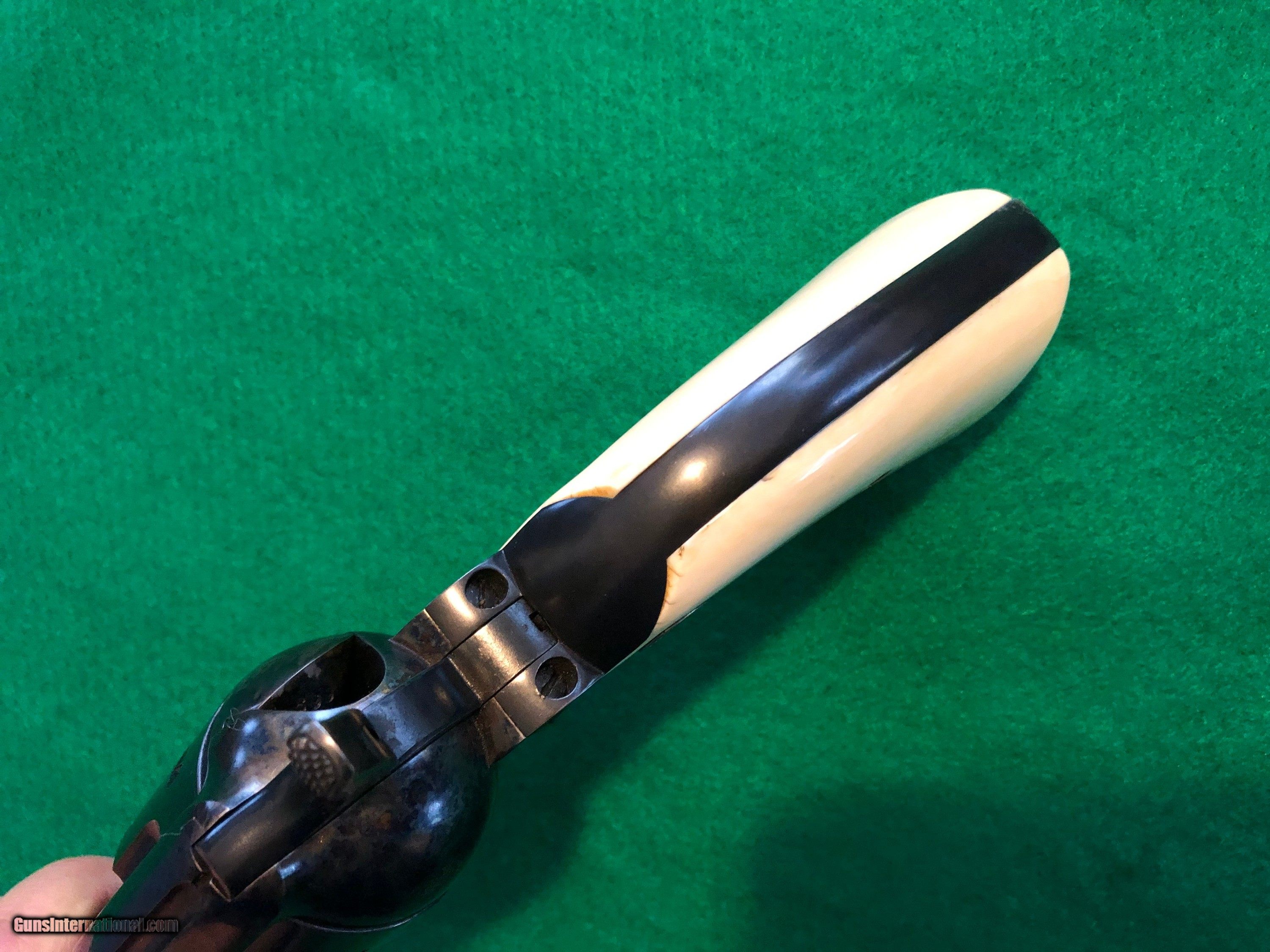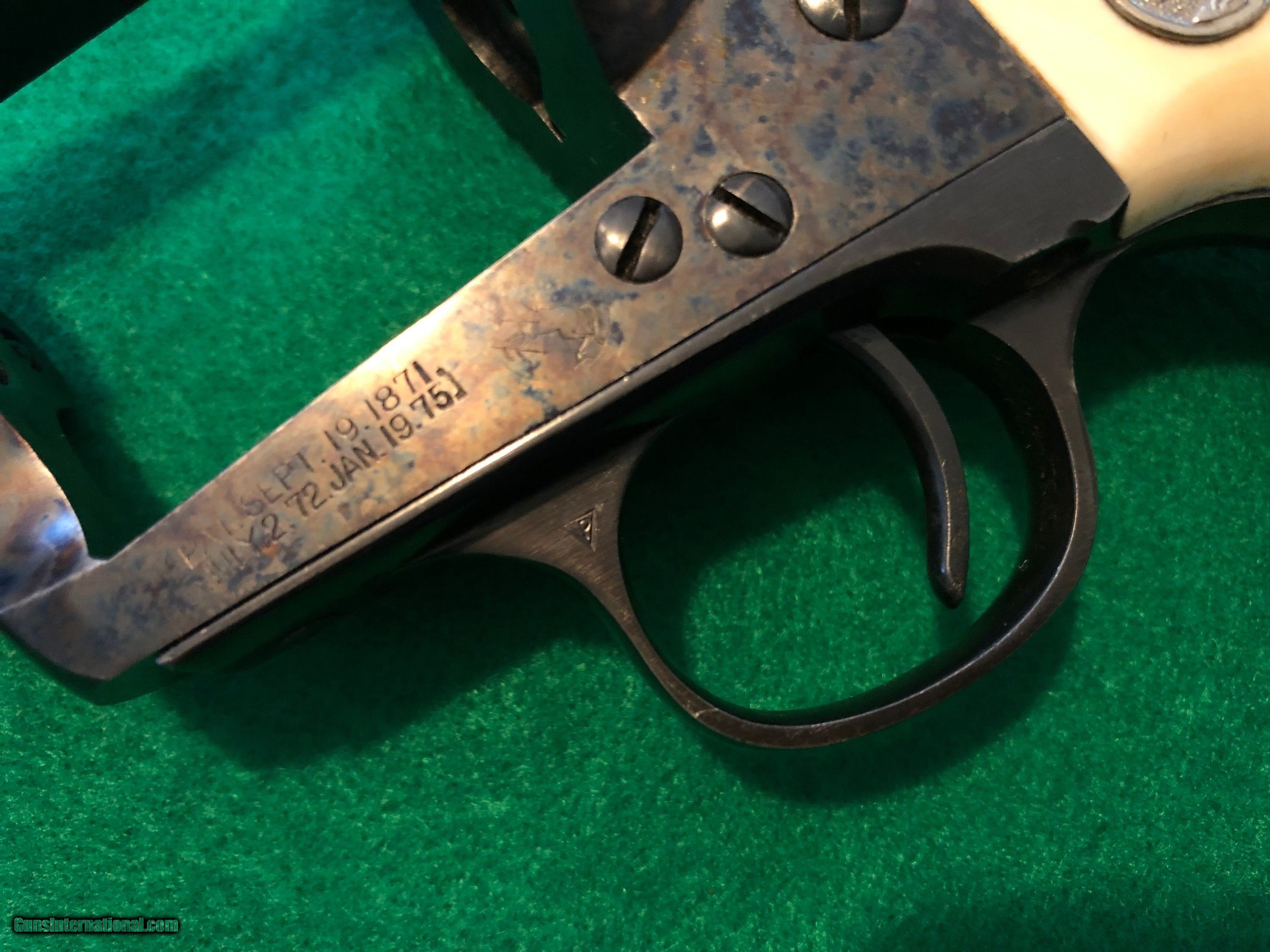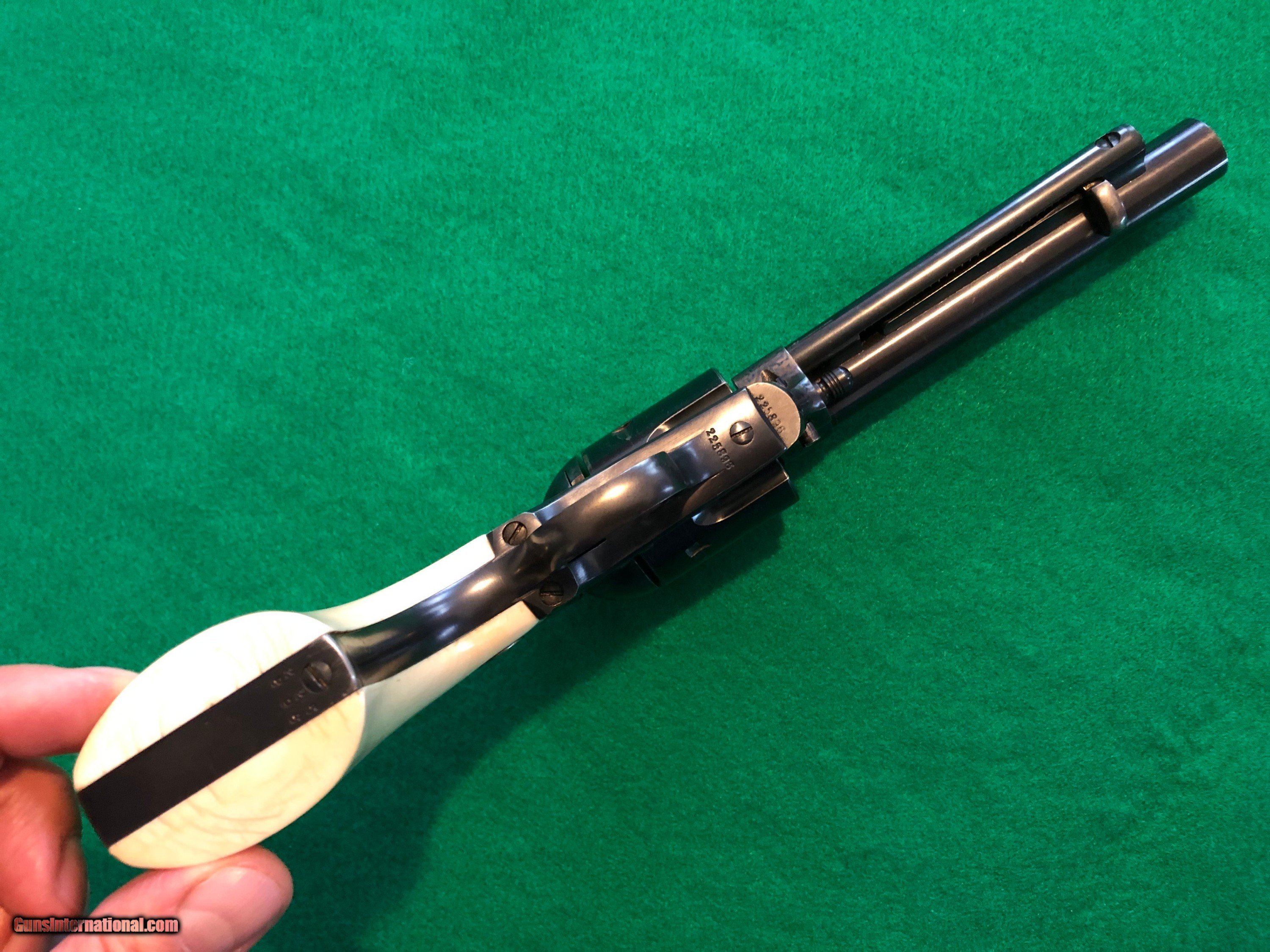 Colt 45 1st Gen 5-1/2" SAA Single Action Army, CA OK!  Description: Nice shooter grade 1st Gen Single Action Colt 45. Almost certainly replacement barrel and cylinder, redone case colors, reblued grip frame. Excellent bore, rifling, chambers. Great action and lock up. And have you noticed...those grips?! Great looking package, ready for a new home. Ser#2258xx matching # across frame, grip frame, backstrap. Ser# places it around 1902 Email or call for more info. CA sales welcome. C&R OK in most areas. FFL needed to ship. SOLD Handgun Caliber: .45 Colt |