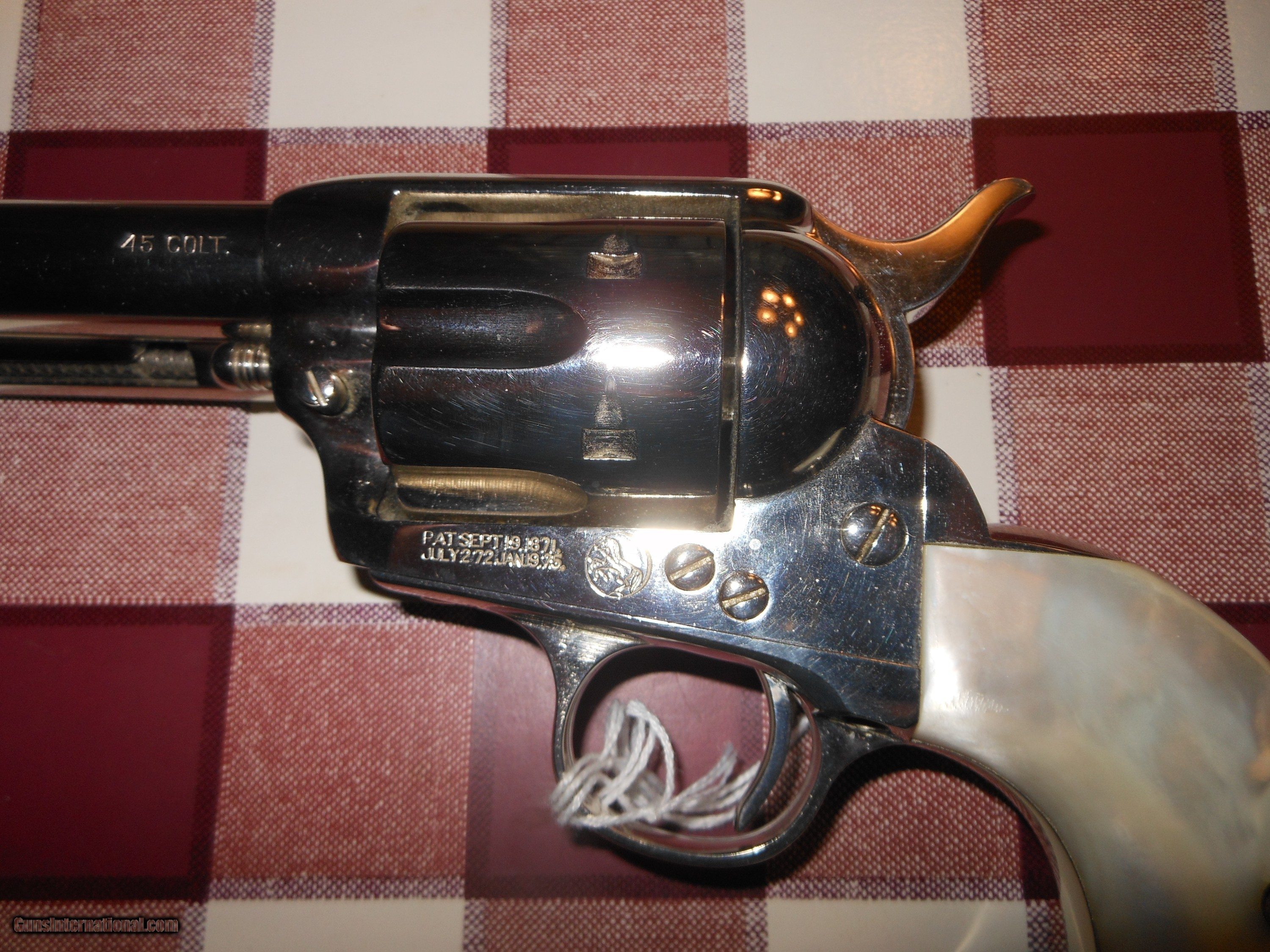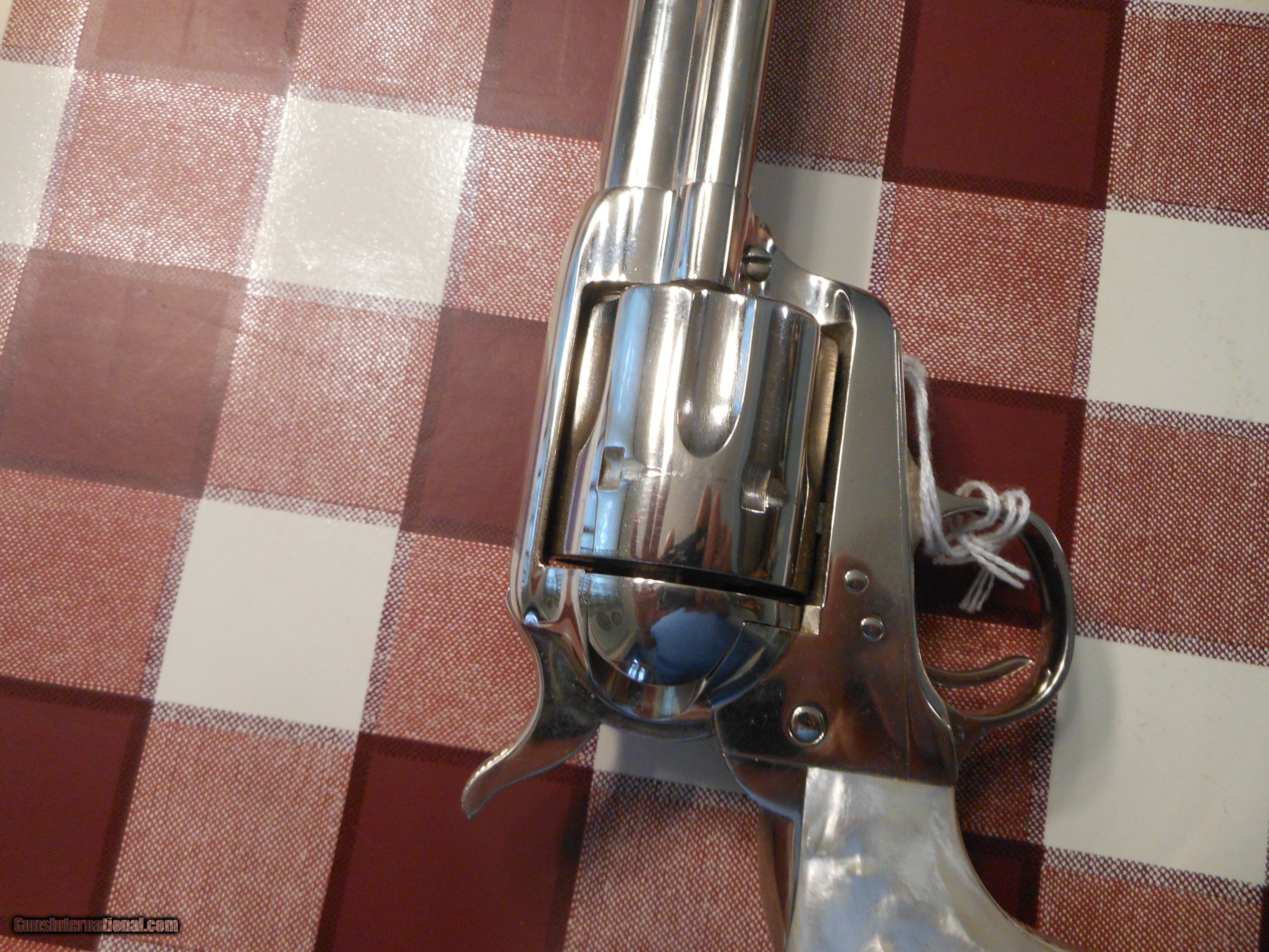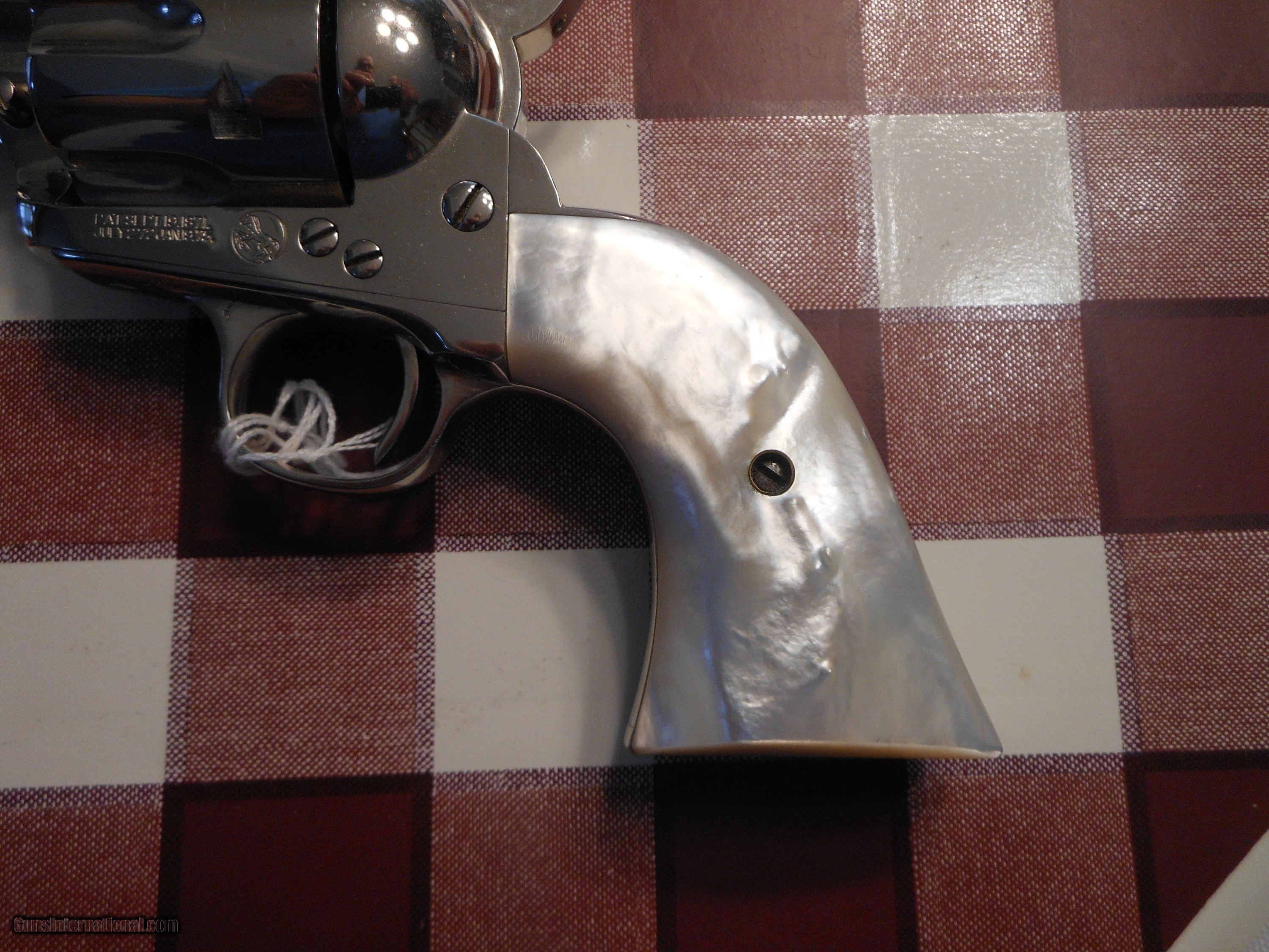 Description: This is a Colt Single Action Aemy in .45 Cal. It has a 4.75 inch barrel and is nickle with zmother of Pearl grips. They fit perfect. The gun has a perfect action with all 4 clicks. Locks up very tight with no play. All markings are sharp and crisp. This has never seen a buffer. buyer pays any ins and shipping. Made in 1901. SOLD Curio/Relic: Yes |