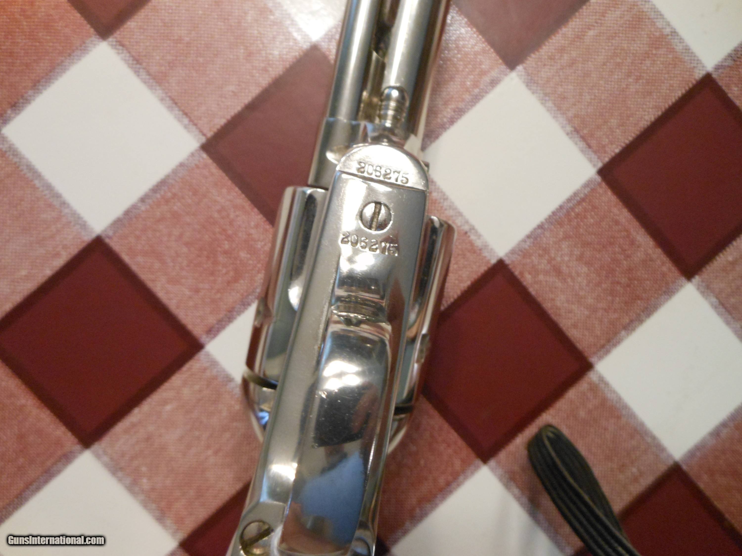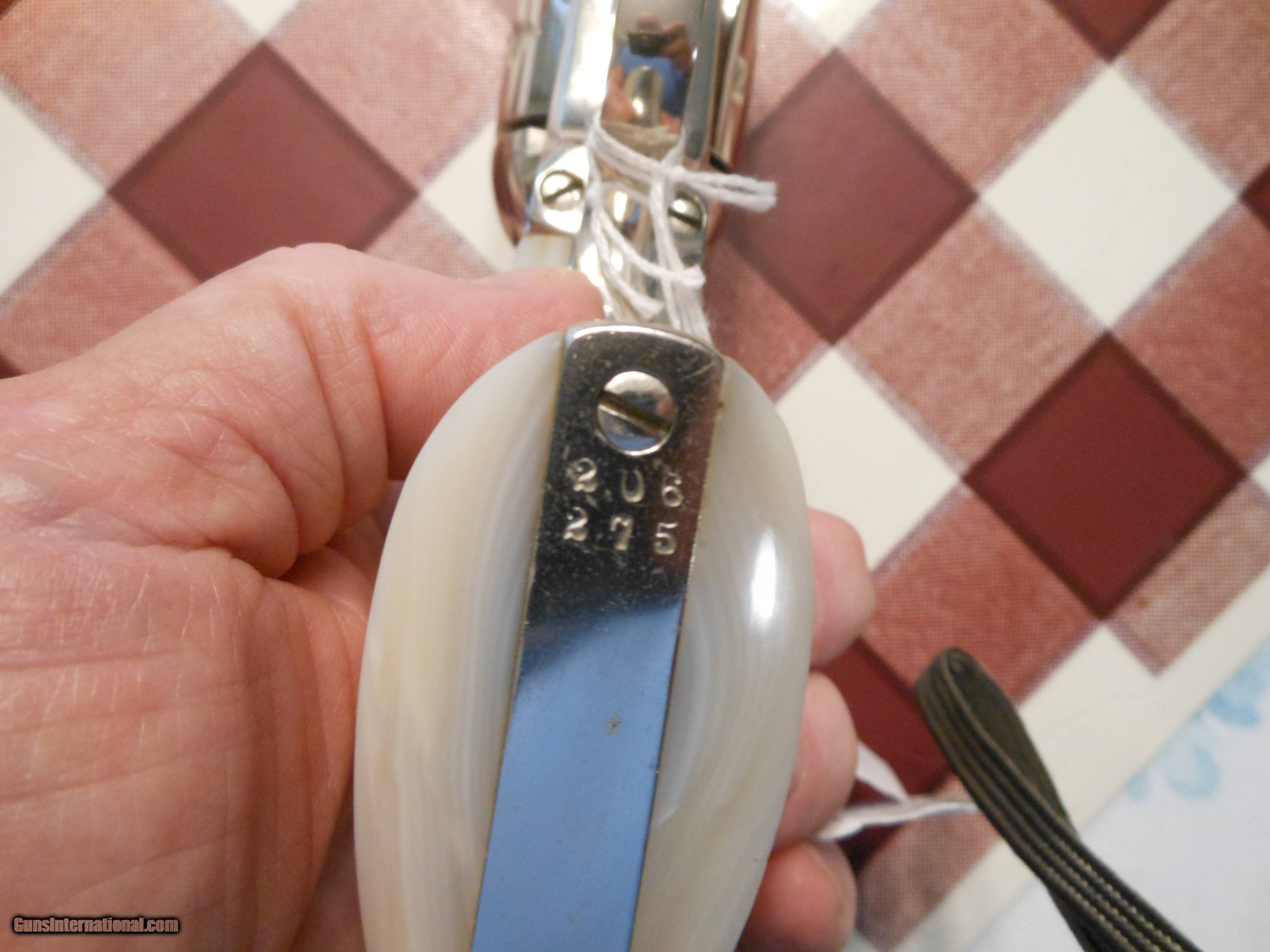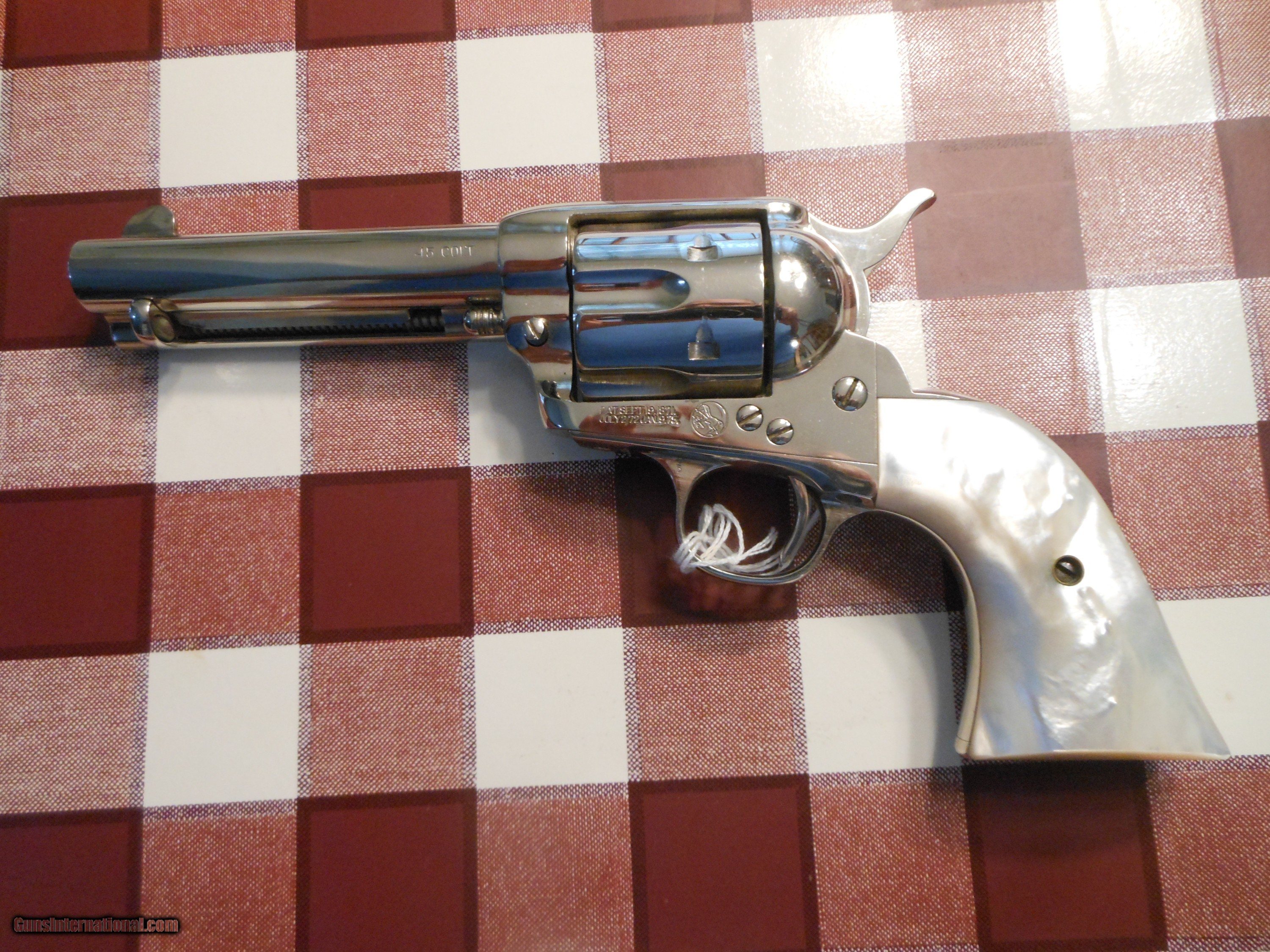 Description: This is a Colt Single Action Aemy in .45 Cal. It has a 4.75 inch barrel and is nickle with zmother of Pearl grips. They fit perfect. The gun has a perfect action with all 4 clicks. Locks up very tight with no play. All markings are sharp and crisp. This has never seen a buffer. buyer pays any ins and shipping. Made in 1901. SOLD Curio/Relic: Yes |