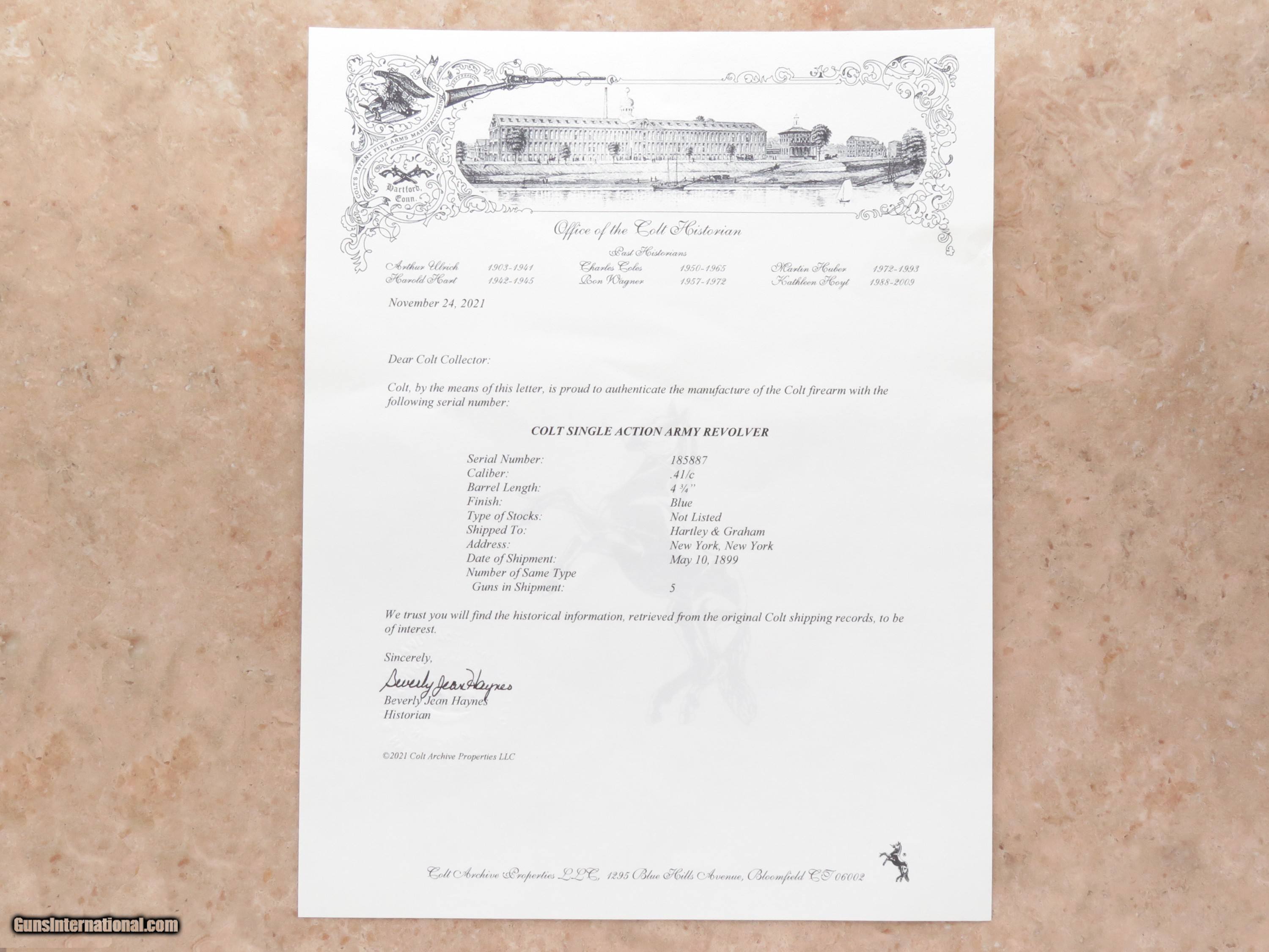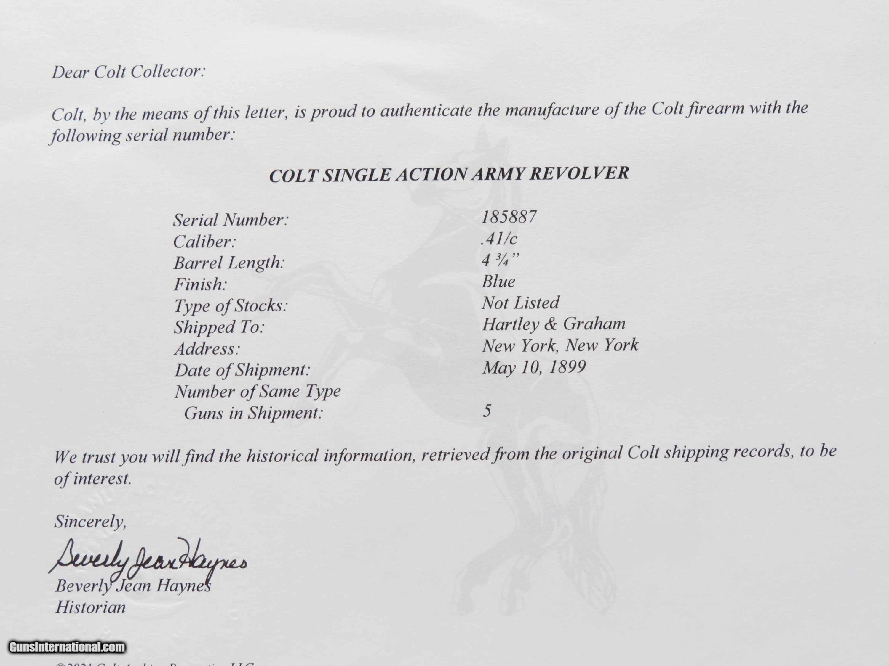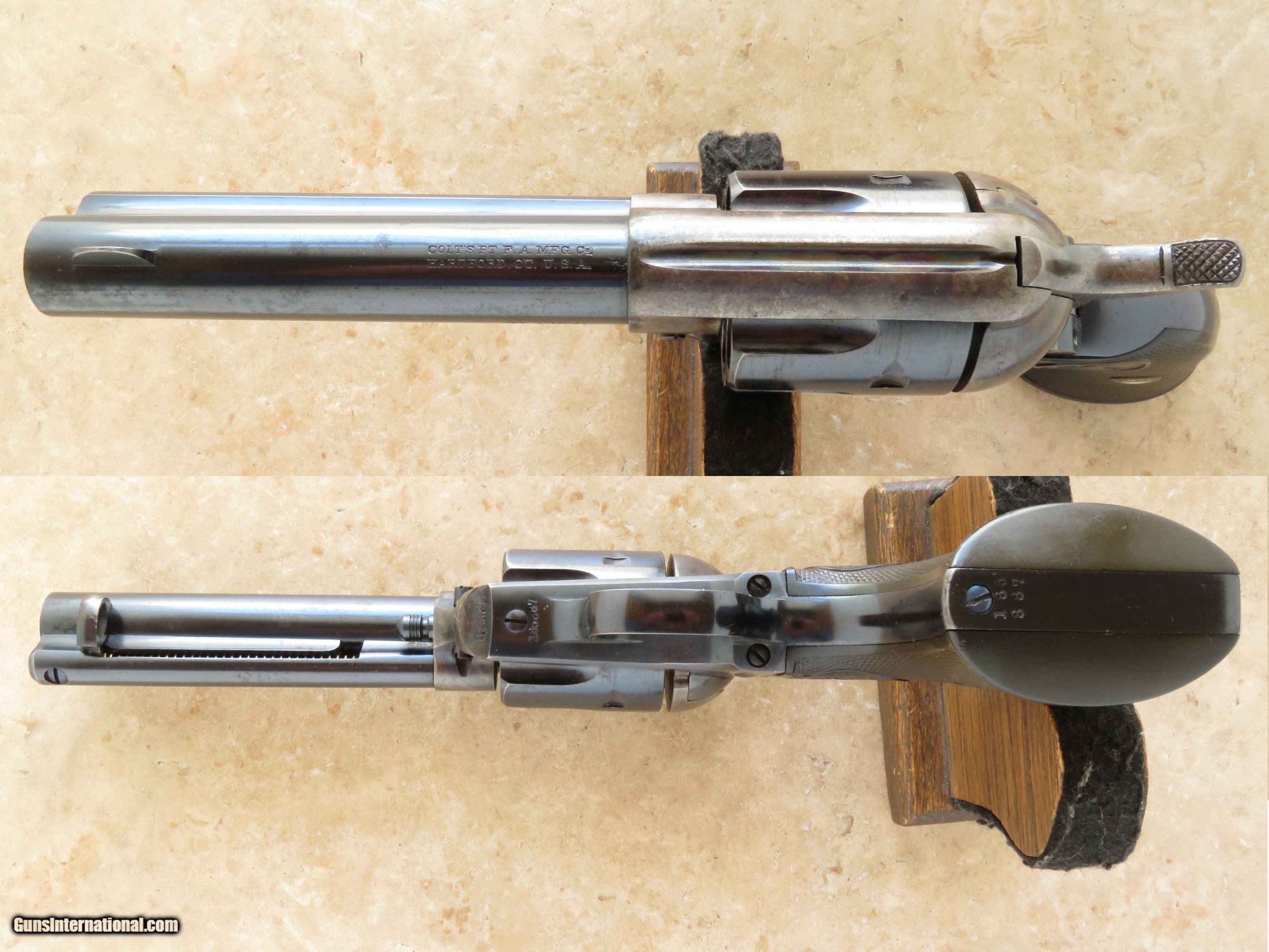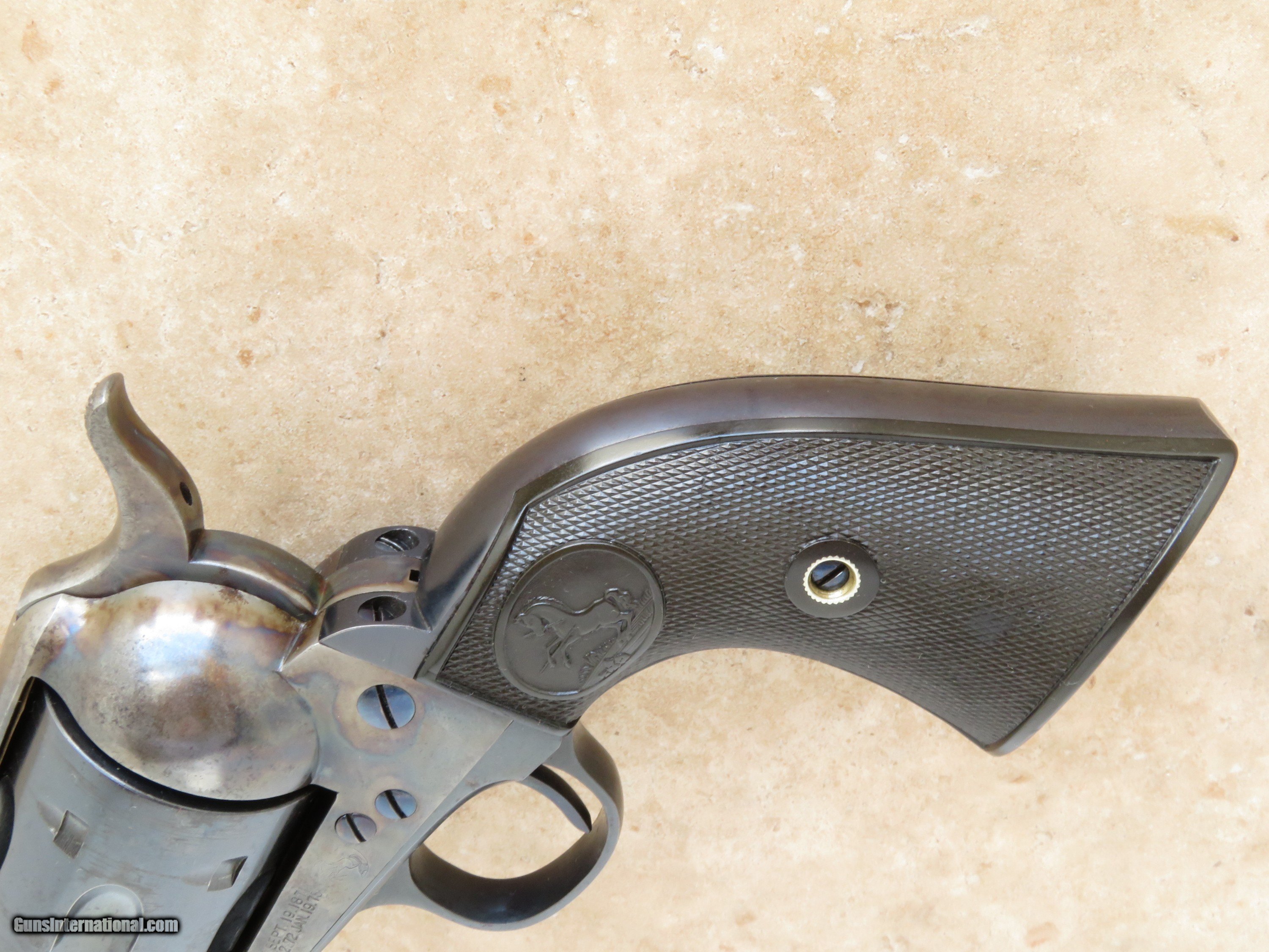 Description: Manufactured in late 1898 or early 1899, this beautiful and rare Colt Single Action was shipped to Hartley & Graham in New York City on May 10th, 1899. While it has the new cylinder release frame design, this gun was not guaranteed for use of smokeless powder ammunition and does not have the verified proof (VP) on the trigger guard. It neither has the larger front sight nor improved rifling, specifically designed for smokeless powder cartridges. For these reasons, Single Action guns manufactured in this brief period (1896 to 1899) are considered "Transitional", and are difficult to find. Apparently, this gun was used very little and was well cared for. The bore is sharp and bright, the mechanics are as new, and it retains approximately 95% of its original finish. No parts have been replaced. Screw heads are all excellent and still show factory bright blue. It is 100% original to the day it left the factory in 1899. A Colt historical letter accompanies the gun. CURIO & RELIC PRICE: $15,995.00 We are Antique & Modern Firearms in Lexington, KY, a dealer of fine firearms since 1974. PH. 859-276-1419 We Buy, Sell, and Trade Firearms & Knives. Do you have an Individual Firearm, Firearms Collection, or Firearms Estate to sell? Call or email us, and we can talk about buying the item(s) outright or selling them on consignment for you. NOTE: No additional fee for a Credit Card payment. YES, We have a Layaway Program: 1/3 down---60 days to pay off. SOLD Curio/Relic: Yes Handgun Caliber: .41 Long Colt (.41 Colt, .41 LC) Manufacturer: Colt Model: Single Action Army Finish: Blued / Case Colored Manufacture Date: 1899 |