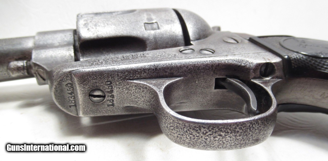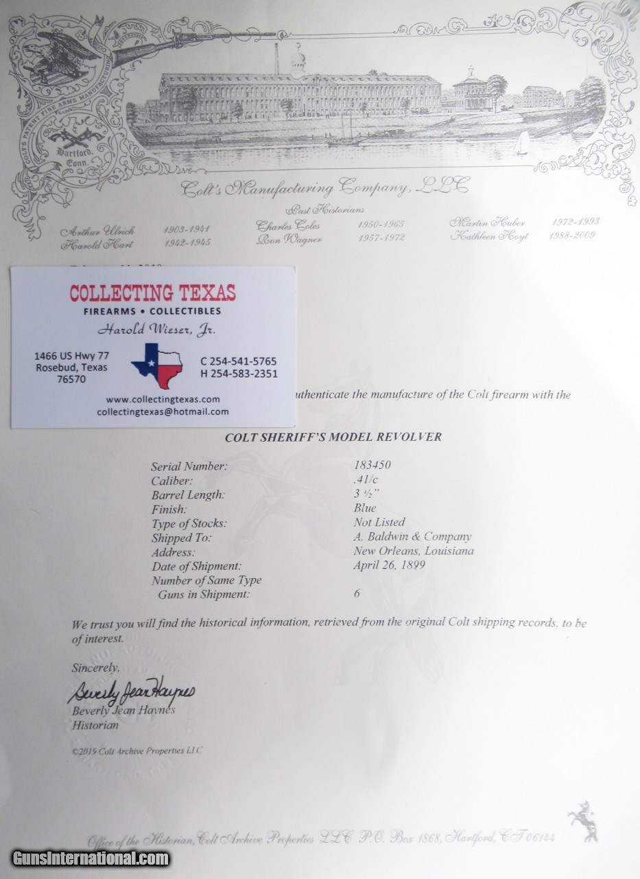 Description: Colt Single Action Army Sheriff’s Model Revolver; Serial No. 183450; Black Powder Frame; Per Included Factory Letter: .41 Caliber with 3 ½” Barrel and Blue Finish; Shipped to A. Baldwin & Company of New Orleans, Louisiana on April 26, 1899 as Part of a 6 Gun Shipment; As Noted, Frame was Made in Black Powder Era; See “A Study of the Colt S.A.A. Revolver” by Graham, Kopec, and Moore – Page 73; No Original Metal Finish Remains; Nice Original Hard Rubber Grips Which Fit Perfectly and are Original to Gun; Perfect Action and Strong Bore with moderate even frosting but No Pitting; The Combination of .41 Caliber and 3 ½” Barrel Makes this Old Colt Very Rare Indeed; 100% Correct and Original Colt Revolver; See All Photos for Condition; No Texts; Call (254)541-5765 or Email Only; PERSONAL PROPERTY of Harold Wieser; Price: $15,975 + $45 S&H Via USPS PRIORITY MAIL; Payment Address: Harold Wieser - 1466 U.S. Hwy 77 - Rosebud, TX 76570; SEND PAYMENTS VIA USPS PRIORITY MAIL; BEWARE of SCAMS!!! – DO NOT SEND MONEY or CORRESPONDENTS ELECTRONICALLY UNLESS YOU HAVE SPOKEN to HAROLD WIESER FIRST! 254-541-5765 SOLD Manufacturer: Colt Model: Sheriff's Serial Number: 183450 |