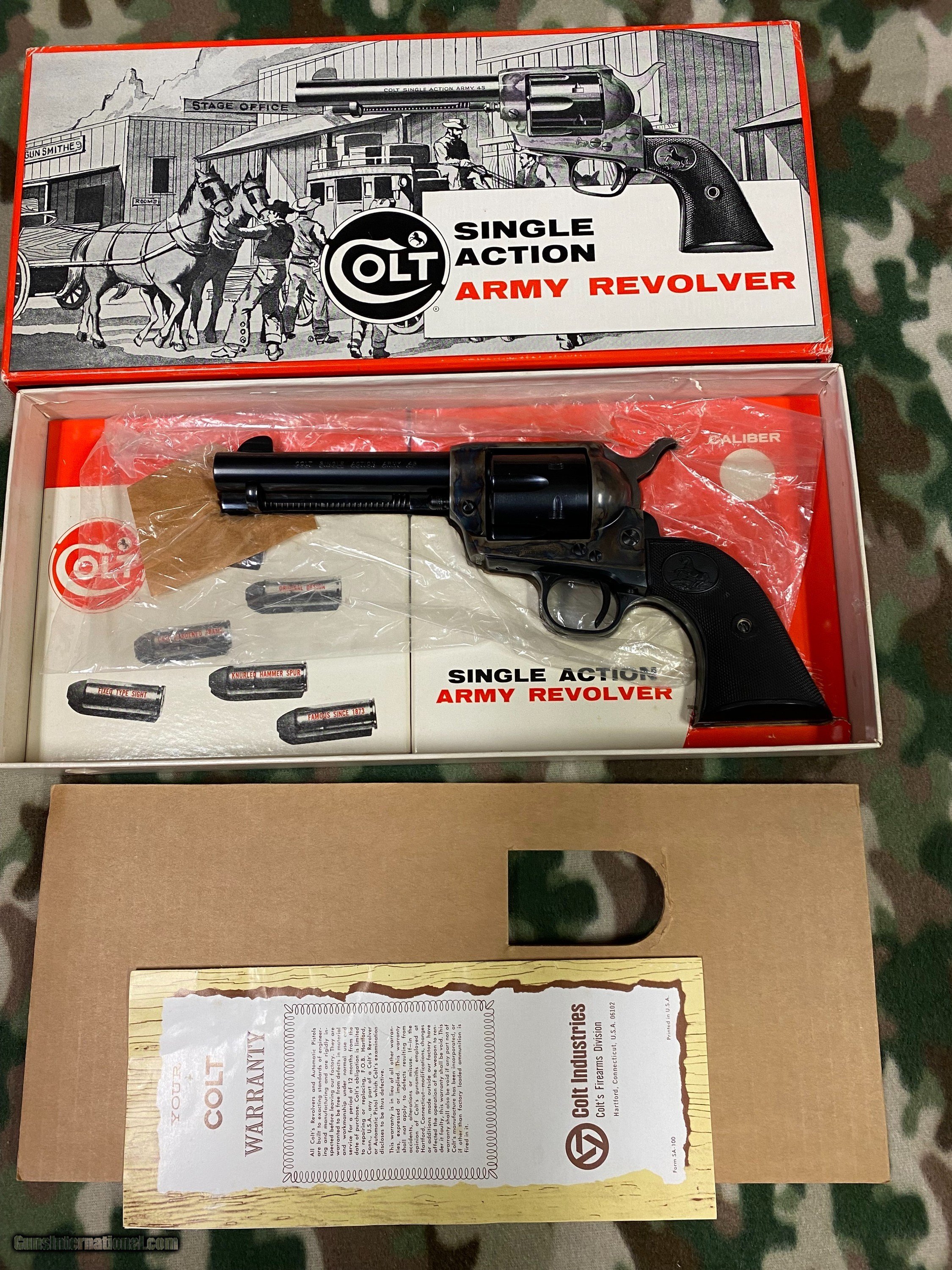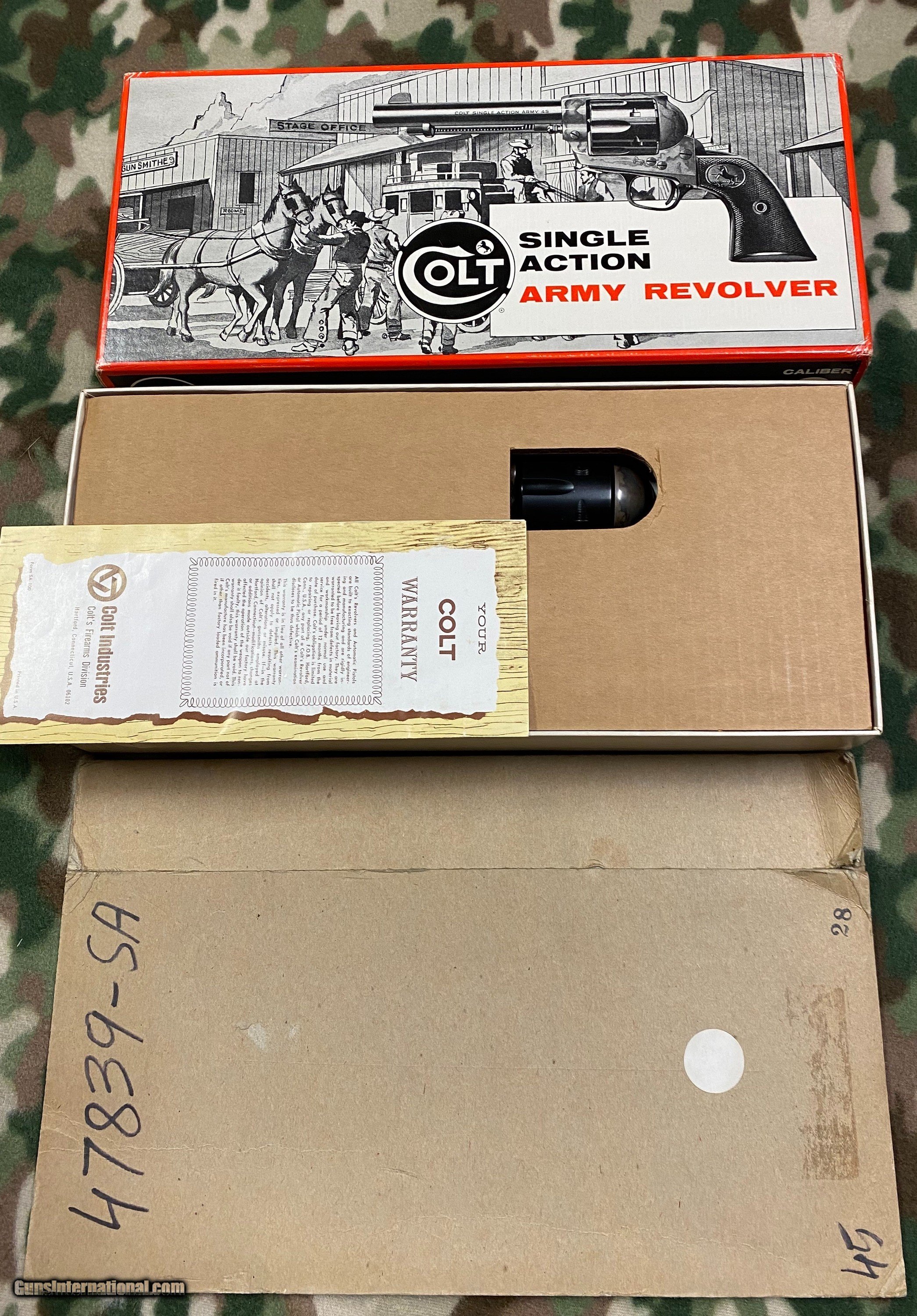 Description: 99.9% condition Colt SAA 45 Colt test fired only. Made in 1968. Very tight action. Papers including scarce sleeve with stage coach box, 4 3/4" barrel. Scarce in this condition. Shipping $75.00 to include insurance. SOLD Handgun Caliber: .45 Colt Manufacturer: Colt Model: SAA Condition: 99.9% |