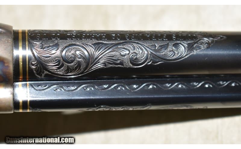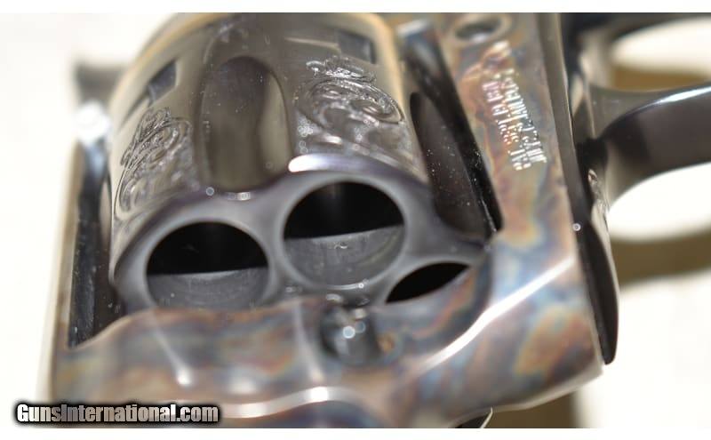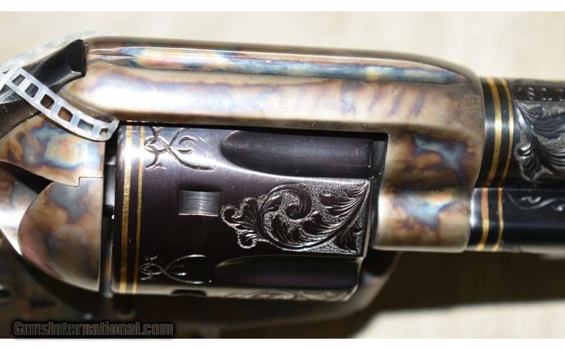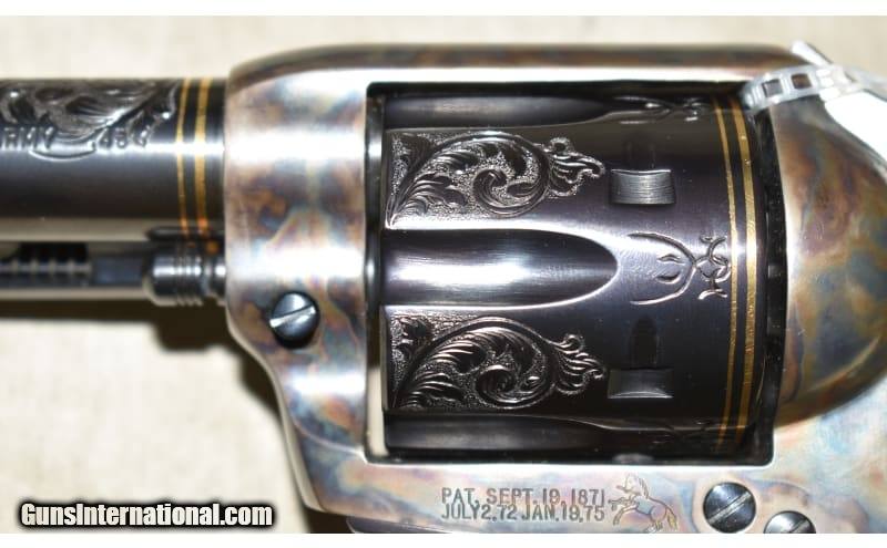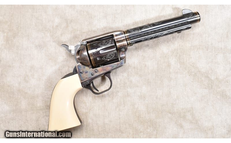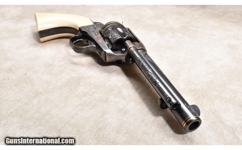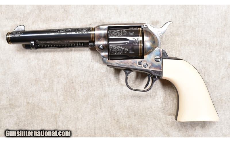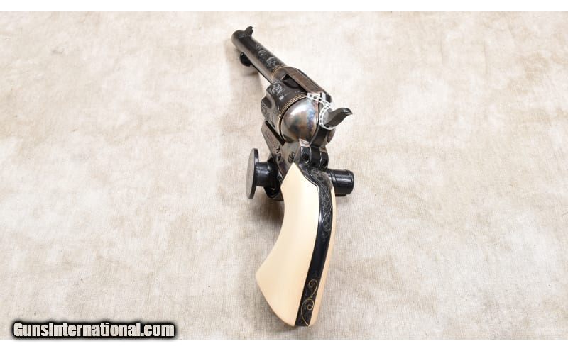 Description: Ultra-nice Single Action Army featuring case colored frame, blue barrel/cylinder, and synthetic ivory grips. Most surfaces of barrel and cylinder have some Acanthus engraving. There are gold accents on the barrel and cylinder as well. Appears unfired with factory strap on the hammer and the cylinder unturned. YOM is 1980. .45 Colt SOLD Chambers: 6 rounds Metal Condition: AsNIB. Wood Condition: AsNIB. Bore Condition: AsNIB. Barrels: 5-3/8 inches Triggers: Factory single action only. Butt Pad: Synthetic ivory. Weight: 38 Ounces Sights: Blade and top strap groove/notch. Item Location: Rogers |