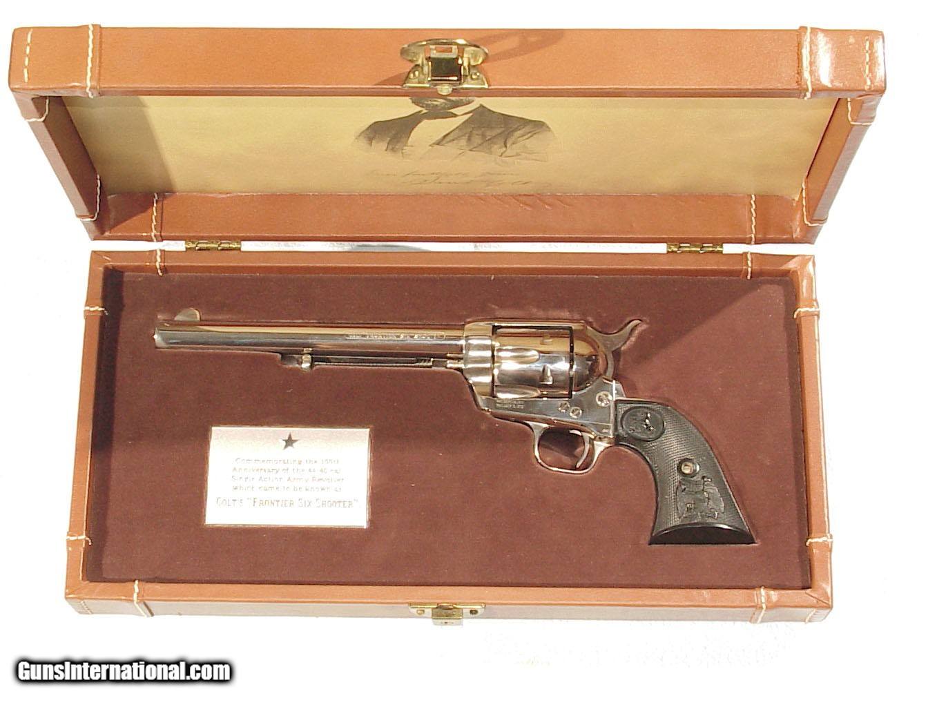Description: .44-40 caliber, 7 1/2" barrel, finished in nickel with black checkered hardrubber factory grips. In new, unused original condition retaining 100% nickel. In it's original leather presentation box. SOLD |
