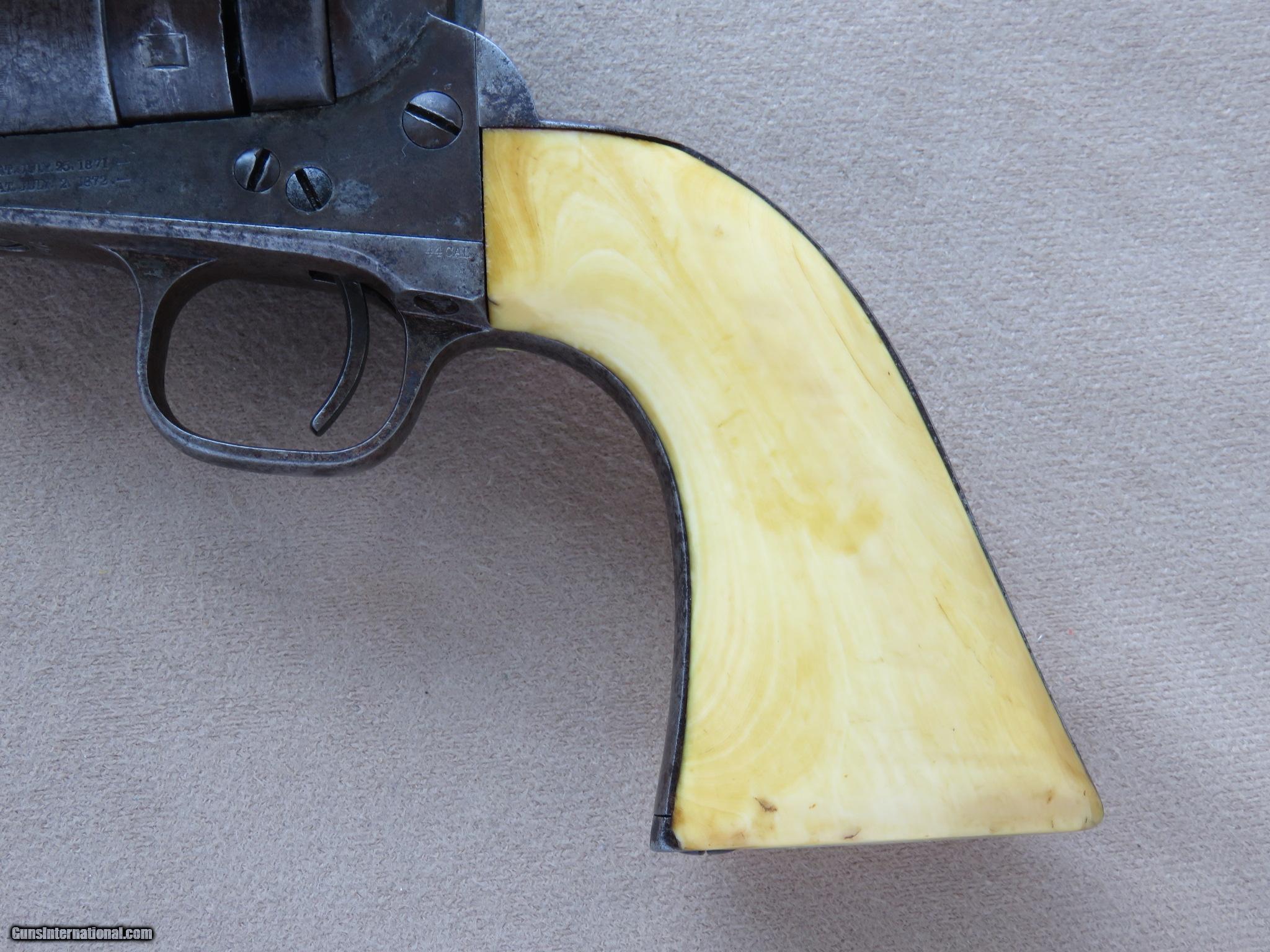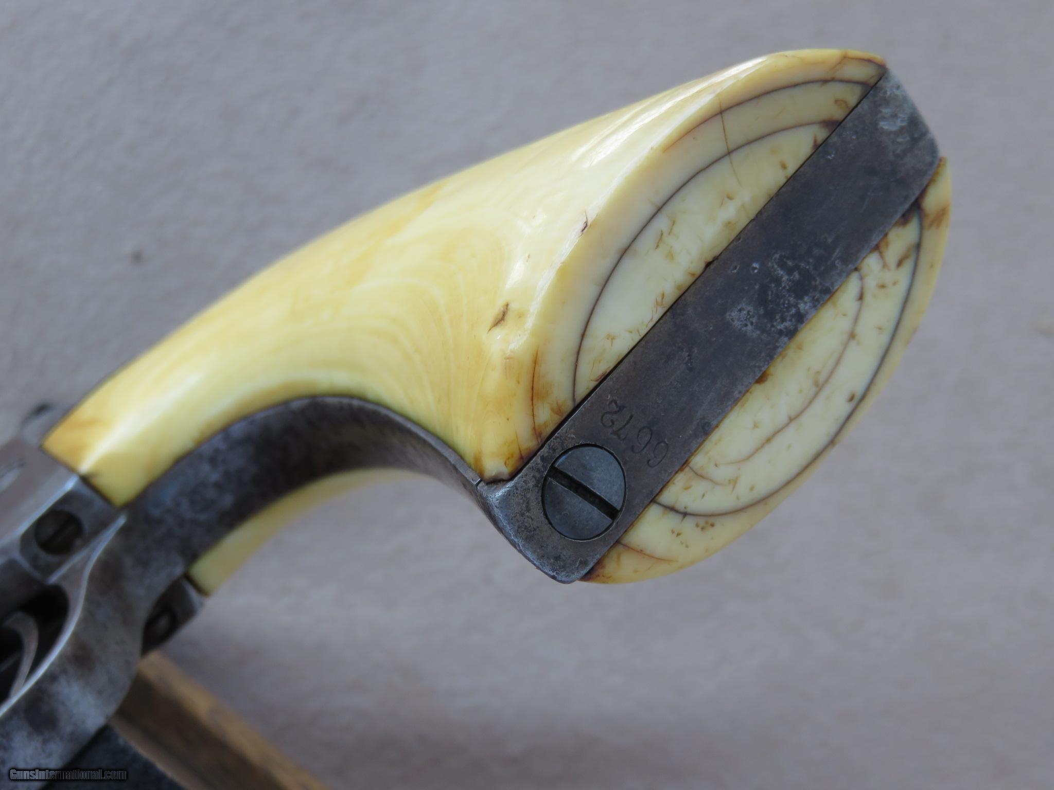Description: The last of the so called conversions because they utilized some left over parts from the civil war 1860 Model Colt, these guns were actually the first of the metallic cartridge handguns made by Colt in thier own serial number range. They fired the new .44 centerfire ammunition, and they were actually being made at the factory at the same time as the 1873 Peacemaker, the 71-72 Open Top, and the 1st and 2nd model Richards Conversions. This gun was finished in blue and color hardening and fitted with 1 piece ivory grips. All numbers match and the cylinder still shows a faint naval battle scene. It is tight and in perfect working order. This Colt comes accompanied by a period double loop holster and cartridge belt. A very attractive gun and rig, this outfit has probably witnessed a lot of history! SOLD Antique: Yes Manufacturer: Colt Model: Richards-Mason Conversion Serial Number: 6672 Caliber Info: .44 Centerfire |