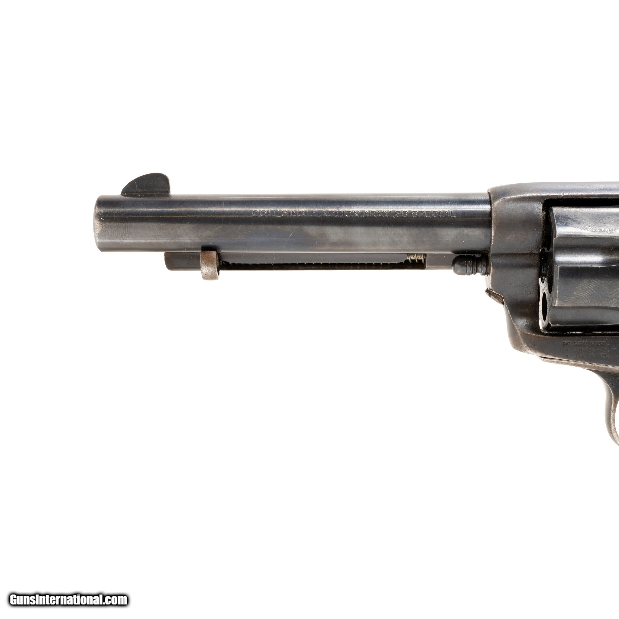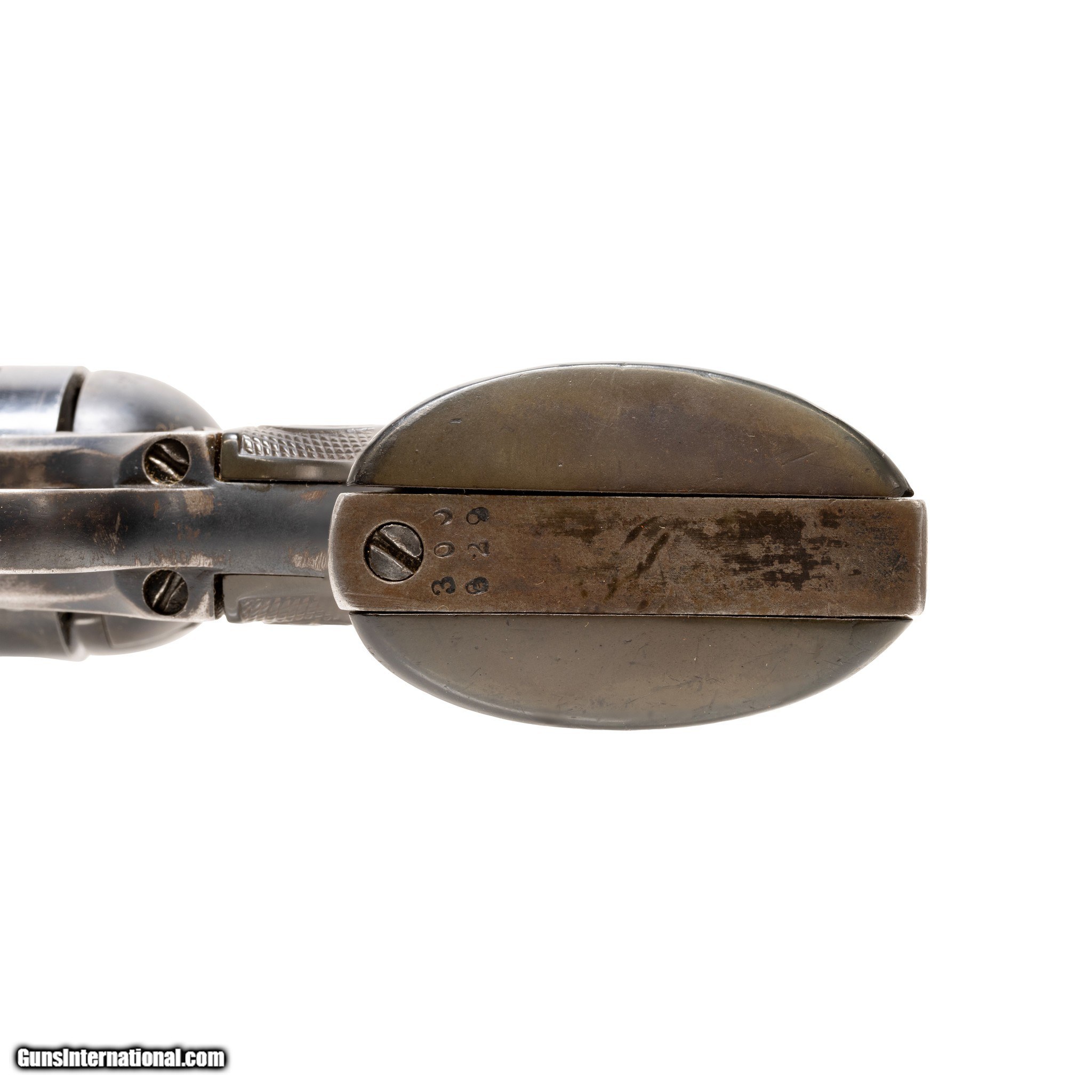 Description: Colt Single Action Army revolver. 38 Special caliber, 5 1/4" barrel, 6 shot fluted cylinder and plastic grips with rampant stallion and eagle designs. The revolver's trigger guard and buttstrap feature the same serial number 300629 (manufactured 1907), while the frame is numbered 39622 (manufactured 1877). The barrel and cylinder appear to be a later replacement. The barrel is marked Colt's MFG. Co. Hartford, CT U.S.A on the right side and Colt Single Action Army 38 Special on the left. The frame is marked with the three line patent date marking of 1871, 1872, and 1875. The trigger guard is marked on the left hand shoulder with a VP in the front and a T on the back. Family Owned & Operated Cisco’s Gallery deals in the rare, exceptional, and one-of-a-kind pieces that define the history of America and the Old West. Our pieces range from American Indian to Cowboy Western and include original items of everyday life, commerce, art, and warfare that tamed America’s frontier. Our 14,000 square foot gallery opened in 1996 in beautiful Coeur d’Alene, Idaho. Personal Service Cisco’s operates on old fashioned values – honesty and integrity, and all of our items are backed by our money back guarantee. We appreciate the opportunity to earn your business. Whether you desire assistance with a jewelry purchase, choosing a gift, identification, or even selling – we hope to be your trusted source. SOLD Manufacturer: Colt Model: Single Action Army Serial Number: 300629 Barrel Length: 5 1/4 |