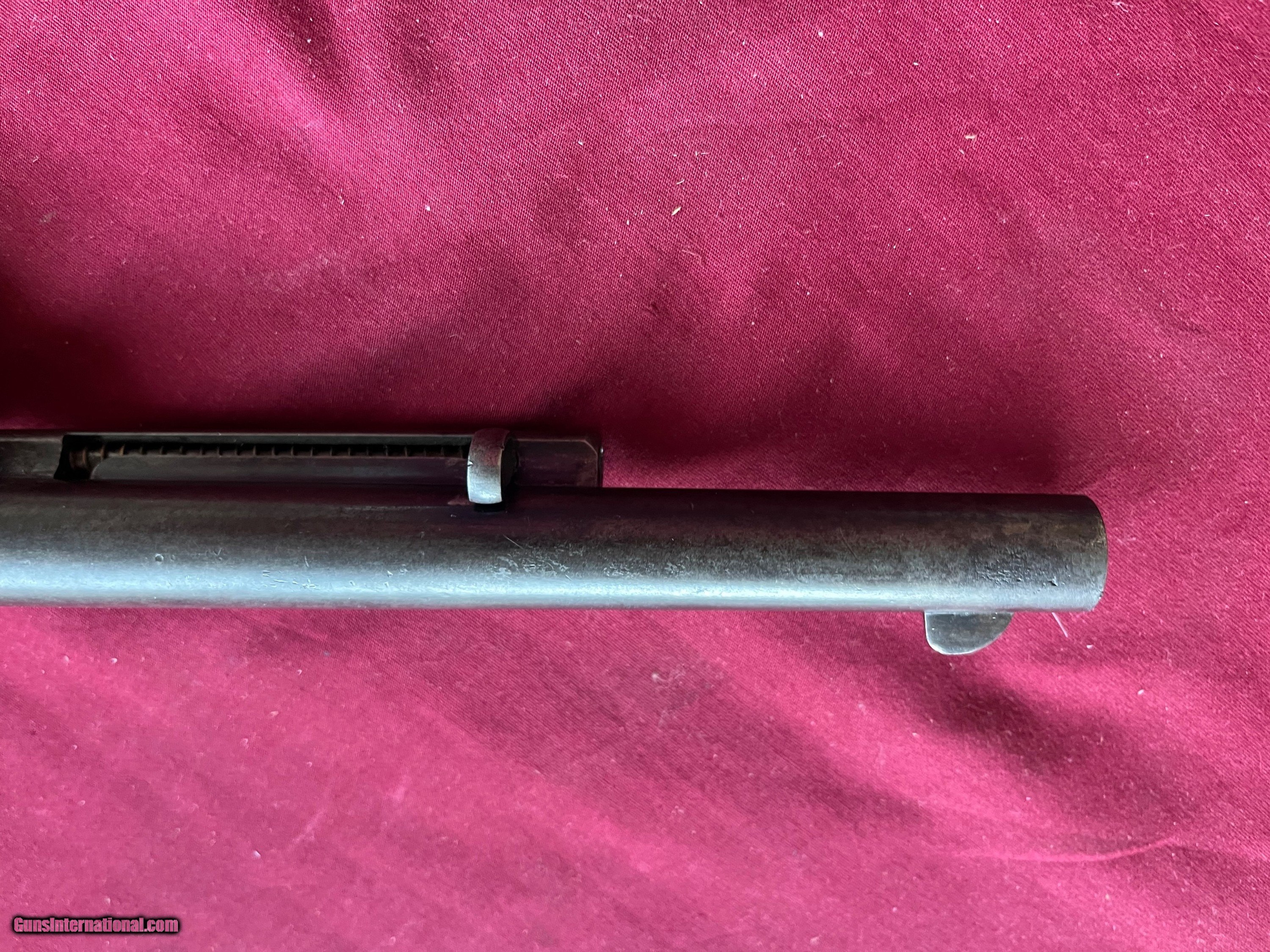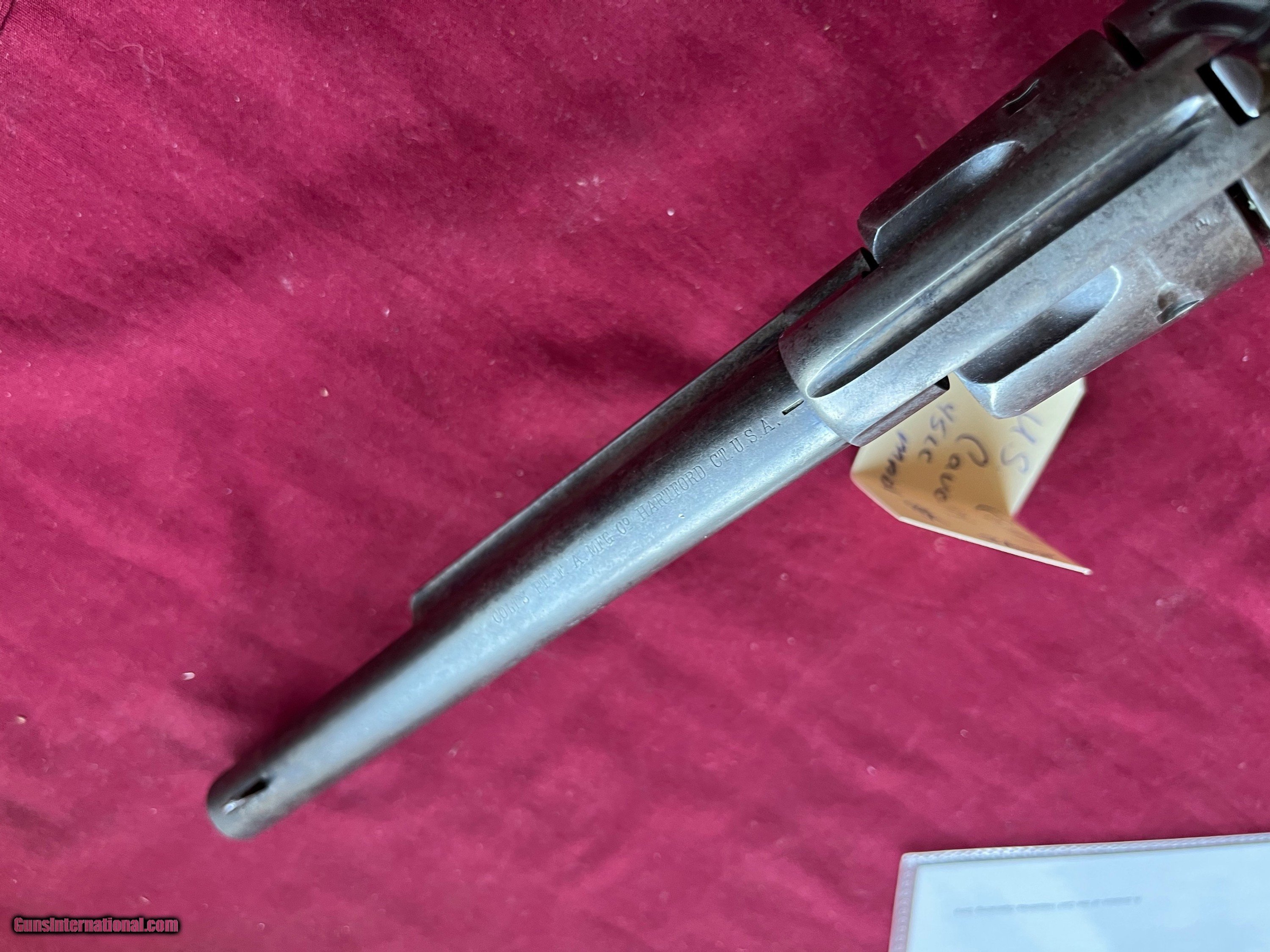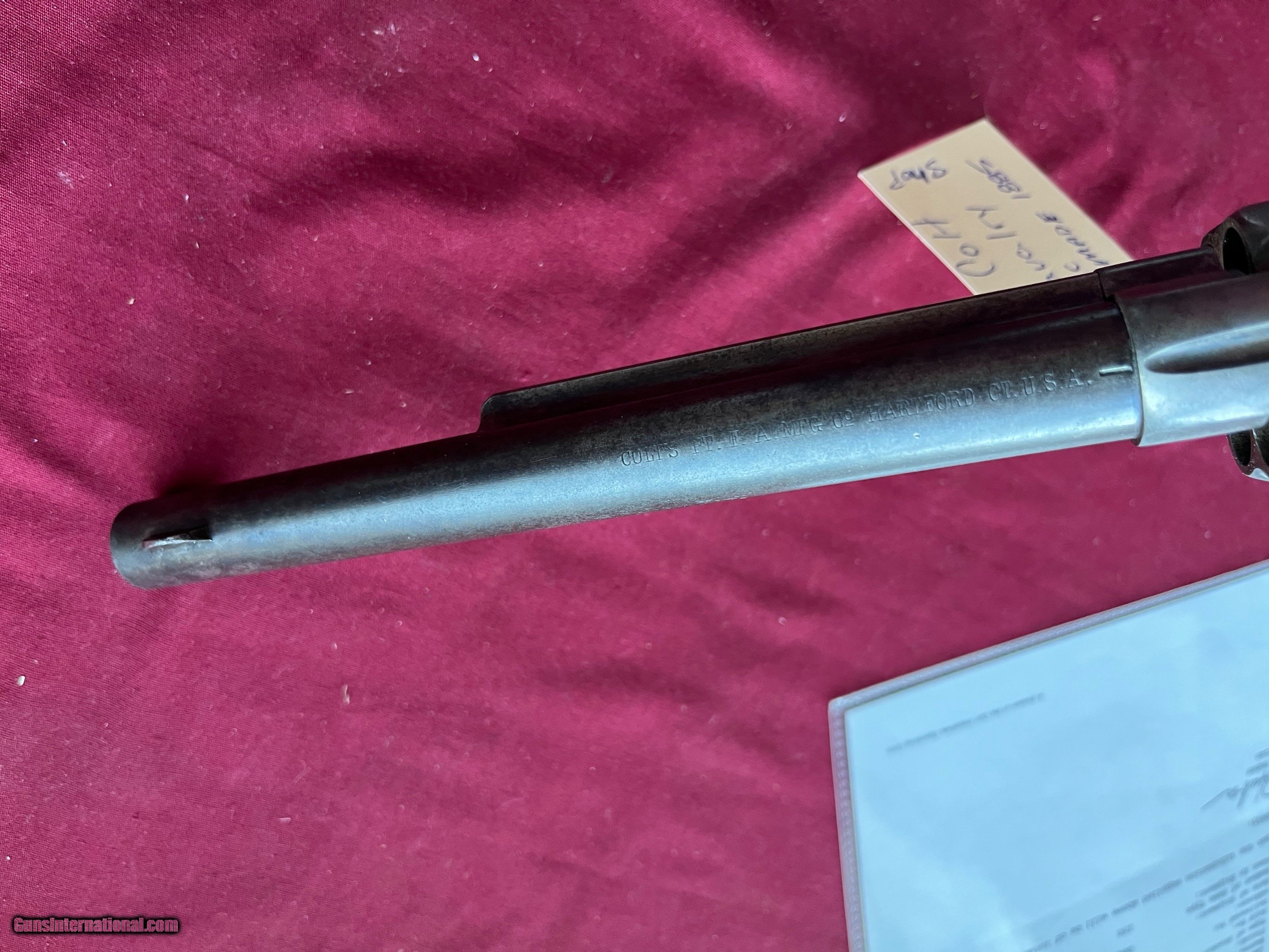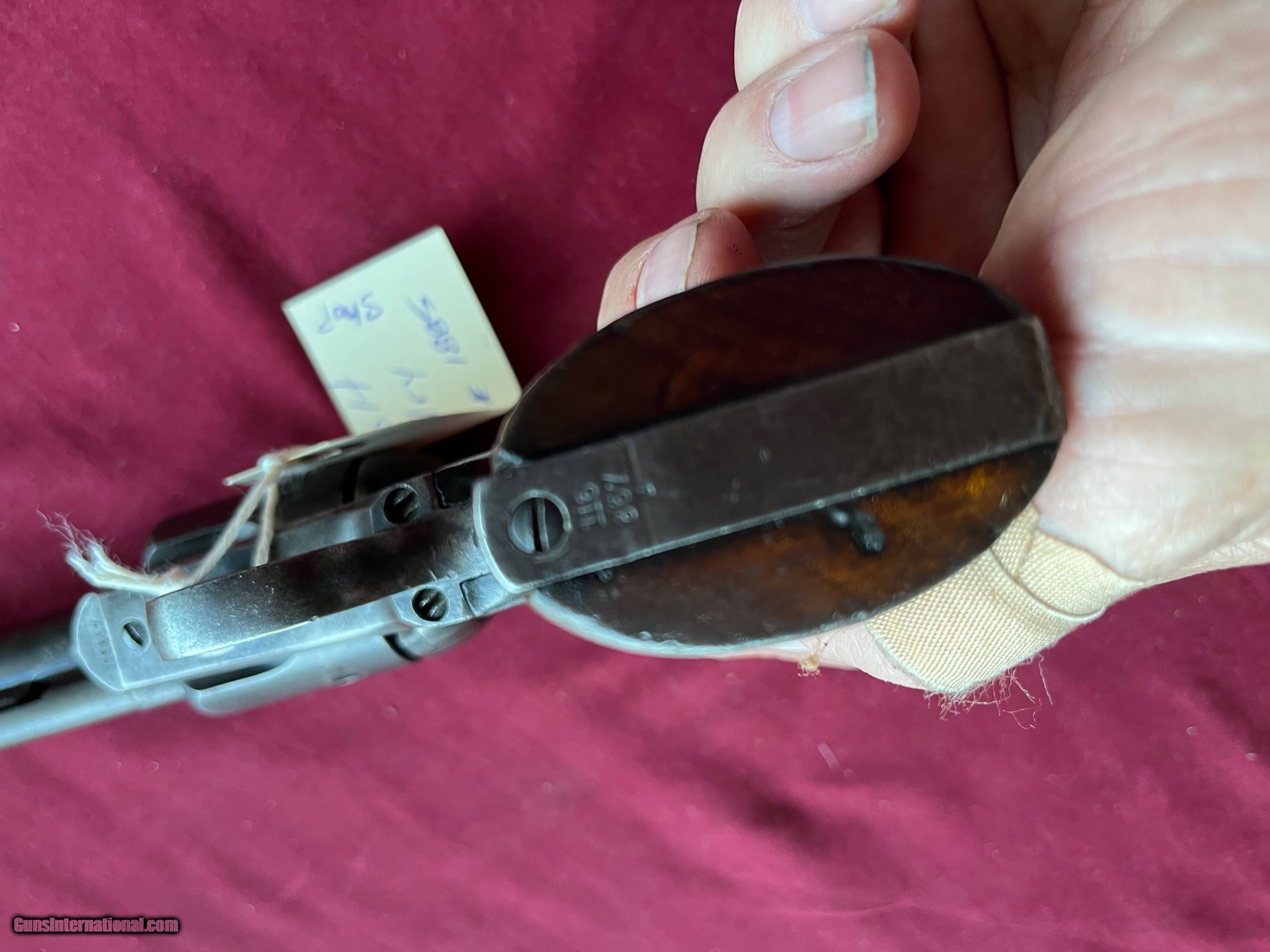 Description: U.S. Colt Single-Action Army Cavalry Model Revolver 45 Colt Made in 1885 serial #116867, 45 Colt, 7 1/2” barrel with a very good bore which is bright for most of its length with strong rifling but shows some pitting in the last third toward the muzzle area. A quite pleasing and honest revolver, the barrel is primarily a plum patina with pewter undertones showing generous trace blue in the very protected areas, the extractor rod housing is similar with strong blue on the underside of the barrel. The cylinder is showing pewter toning on the sharp edges along with a cylinder turn ring, with some scattered pinprick pitting about the surfaces as well. The frame is a silvery-gray-plum case-hardened patina with some generous trace colors lurking in the very protected areas. The backstrap has drifted to a pleasing smooth plum with some generous trace blue at the root of the triggerguard, the frontstrap with a few minor impact marks. The one piece walnut grip rates very good to fine a showing some smoothing, flaked original varnish and light left and right side cartouches which can be faintly read and seem to be Clark and Heath; there is a tiny chip at the front lower edge of left and right of butt and while difficult to discern the number inside the butt recess appears to be “6867”. The “U.S.” remains prominent on left of frame near the three line patent markings with “G” sub inspectors marking and “DFC” prominent ahead of the serial number, on underside of barrel and on cylinder, and all numbers match including the barrel; the ejector rod head on this example now kidney-shaped. A couple of the screws show some very light damage and the head of the base pin is a bit scarred up. The hammer spring is robust and the gun seems to operate properly, the half-cock notch a bit worn as the firing pin does protrude and the bolt drags a tiny bit on the loading notch. The included factory letter shows shipment in December 1885 to the inspector at the Colt plant, and the arm remains a very pleasing and honest example of an original cavalry-length Colt Army Model which is destined to improve in value as the years pass. EASTERN BRANCH FIREARMS ADD 35.00 SHIPPING – HANDGUN USPS PRIORTY MAIL ADD 50.00 SHIPPING – LONG GUNS USPS PRIORTY MAIL OPTIONAL INSURANCE IS AVAILABLE AT 1.25 PER 100.00 SORRY NO MORE UPS SHIPPING – THERE POLICY NOT TO SHIP GUN AS OF 8/29/2022 Questions e-mail or call Glen at Eastern Branch Firearms 207-215-5021 TERMS – PLEASE READ BEFORE I DO NOT HAVE A LAYAWAY OPTION ( WE ACCEPT CREDIT CARDS ) -- I GET ALOT OF REQUEST FOR TRADES, I WOULD PERFER NOT TO DO TRADES ON MY INTERNET LISTINGS PAYMENT OPTIONS- We accept money orders, cashier’s checks , bank checks. sorry no personal checks. We accept all major credit cards please add 3% to the ’s cash discount price.(Shipping within the state of Florida - Florida Residents must pay sales tax) .Handguns and long guns do need to be shipped separate. PLEASE do not send payment via FED EX . USPS & UPS are fine. Thank you. We include a signed copy of our FFL with each firearm shipped. SAFTY NOTICE- Buyer is solely responsible for determining that a used gun is safe to shoot. The firearms offered have not been test fired but have been given a visual inspection only for purposes. It is a requirement that every used firearm is inspected by a qualified gunsmith before firing. By , the buyer agrees to hold seller harmless against damages, injury, or death caused by defective merchandise. RETURN POLICY- All firearms come with a 3-day non firing , non messing with ( turning srews ,taking apart,removing parts, scoping. firing, cleaning or messing with in anyway) inspection/return privilege.Inspection is based on a visual review of the gun to confirm the gun is in the condition stated. In the case of a return, buyer pays all shipping charges & if paid for with a credit card buyer absorbs the 3% credit card charges . So please ask questions BEFORE you bid. Thanks for Looking and Good Luck!! U.S. sales only, no exports…this includes antiques. I will ship to third party for exporting SOLD Antique: Yes |