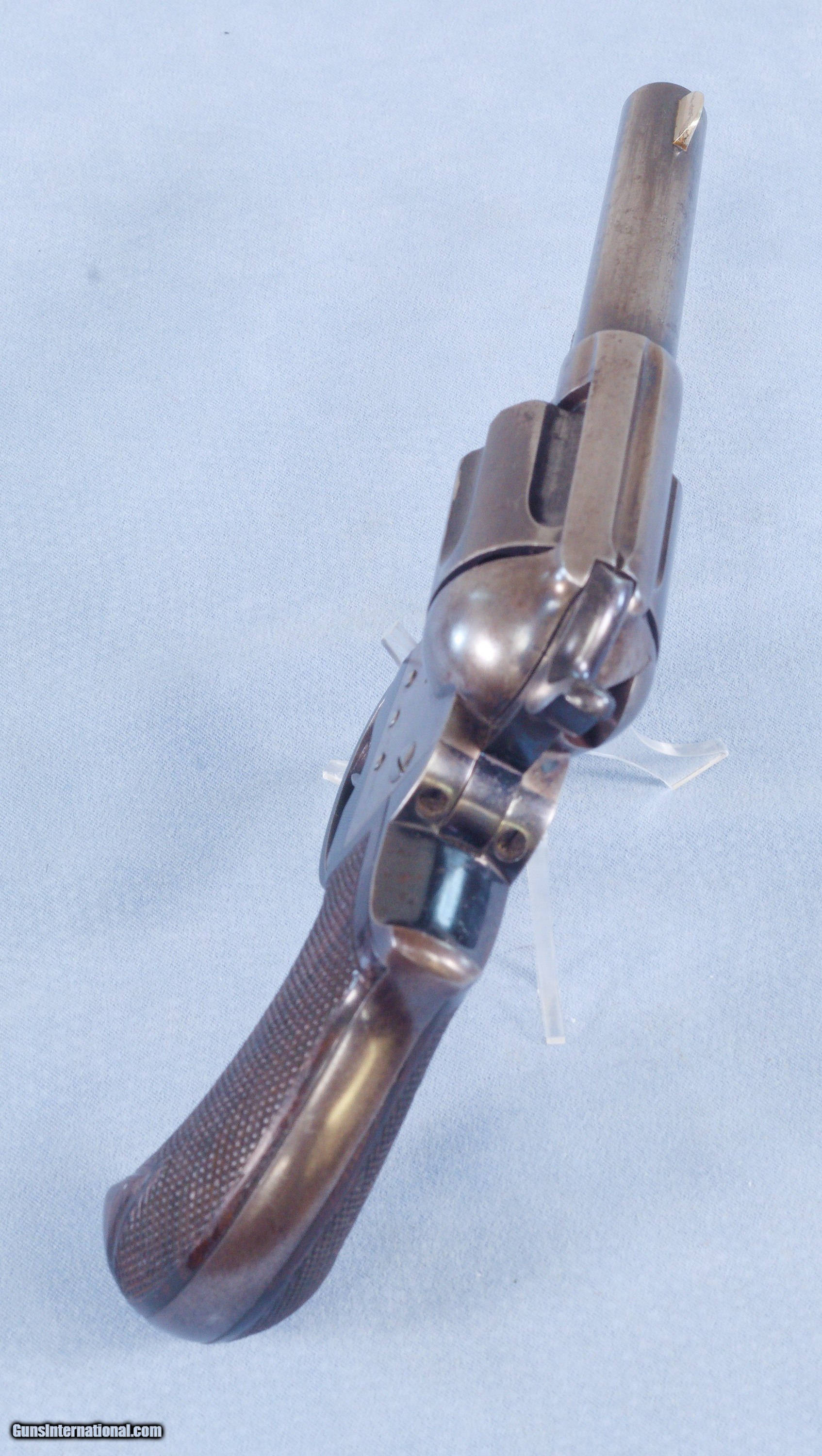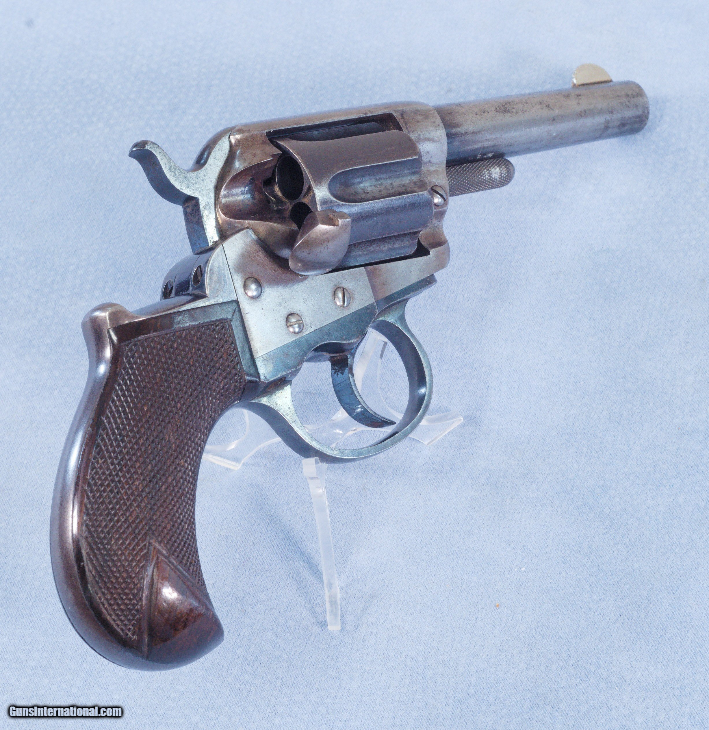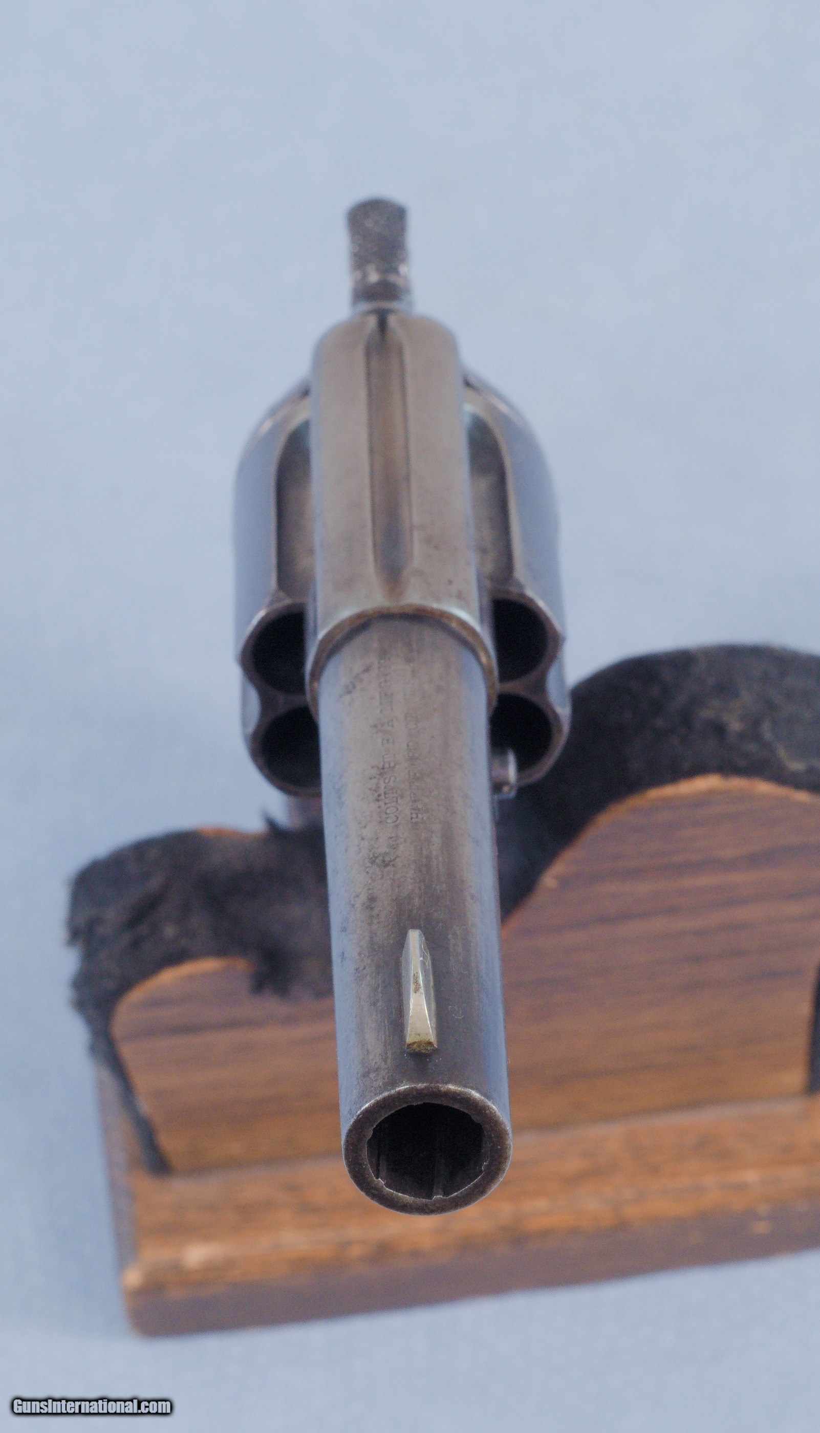 Description: This is a very handsome Colt Model of 1877 "Thunderer" double-action / single-action revolver chambered in ..41 Long Colt that is in very good and all-original condition inside and out. The vast majority of these we encounter are in bad shape and the action is broken, probably a ratio of somewhere between 70 to 80% have completely broken actions or they are badly out of time. Getting this handsome example in that is both unmolested and 100% functional is rare indeed! The Colt Model 1877 was a double-action revolver manufactured by Colt's Patent Fire Arms from January 1877 to 1909 for a total of 166,849 revolvers. The Model 1877 was offered in three calibers, which lent them three unofficial names: the "Lightning", the "Thunderer", and the "Rainmaker". The principal difference between the models was the cartridge in which they were chambered: the "Lightning" being chambered in .38 Long Colt; the "Thunderer" in .41 Long Colt. Both models had a six-round ammunition capacity. The "Thunderer" was the preferred weapon of Billy the Kid, even carried by him when he was killed by Pat Garrett in 1881. Doc Holliday was also known to carry a nickel-plated "Thunderer" in his waistband as an accompanying gun to his nickel-plated Colt 1873. Both had ivory or pearl grips. While this example shows a grey patina on most of the frame and barrel, the grip frame, triggerguard, the trigger, the rear face of the hammer, and a good part of the cylinder still show some very nice original gloss blue. Some of the protected areas also still have factory finish showing. The factory finish on the frames of these pistols is well-known for flaking off rather than actual mechanical wear. This is probably because of a higher than optimum nickel content. The bore in the factory 3.5" inch barrel is excellent! It is bright and clean with sharp rifling the entire way from the forcing cone to the crown of the muzzle. This is not common as most were fired with corrosive ammo and not cleaned right away. The six chambers if the cylinder are also in superb condition. Mechanically this Colt revolver is in excellent condition with the double and single-action functioning perfectly. The action is extremely smooth and slick, and the timing is perfect no matter how it is operated or what speed. At full lock the cylinder just has tiny amount of play in it, another thing these are known for. All of the controls are in perfect working order on this handsome Model 1877. The checkered rosewood grips are spectacular on this Colt and quite frankly make up for a lot of the flaked finish on the frame. They are both very beautiful and in amazingly good condition exhibiting no cracks, chips, repairs, or excessive wear. The checkering on both sides is still crisp and clean, and the grip is perfectly tight to the frame with no wiggle. Shipped to a dealer in New York in 1879 this Thunderer qualifies as an antique and can BE SHIPPED DIRECTLY TO YOUR HOME! This fine Colt would make a great addition to any Colt collection or an excellent addition to antique gun collection. Factory letter from Colt is included. PRICE: $2395.00 We are Antique & Modern Firearms in Lexington, KY, a dealer of fine firearms since 1974. To Inquire please phone us at 859-276-1419 Mon-Fri 9am to 5pm We Buy, Sell, and Trade Firearms & Knives. Have an Individual Firearm, Firearms Collection, or Firearms Estate to sell, let us know, and we can buy or consignment sell it for you. NOTE: No additional fee for a Credit Card payment SOLD Antique: Yes Handgun Caliber: .41 Long Colt (.41 Colt, .41 LC) Manufacturer: Colt Model: 1877 Thunderer Serial Number: 19141 Barrel Length: 3 1/2 inches Condition: Very Good Metal Condition: Very Good Bore Condition: Very Good Manufacture Date: 1879 |