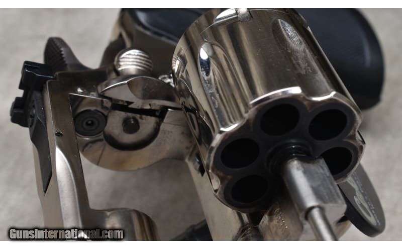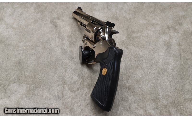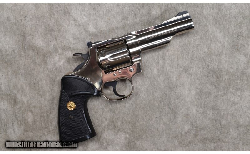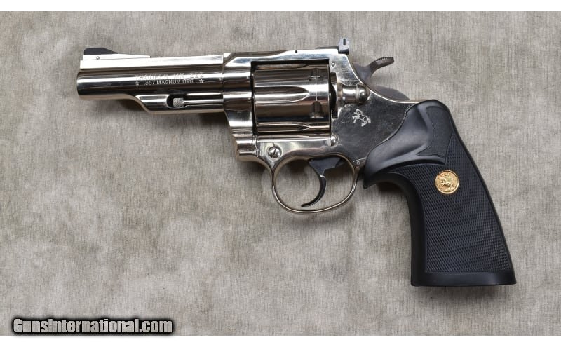 Description: This Colt Trooper features a bright nickel finish, 'sticky' grips, and easy-to-holster 4-inch barrel. It has target pistol type wide trigger and hammer spur. The manufacture date is in 1998. .357 Magnum SOLD Chambers: 6 rounds Metal Condition: Very good. There is a faint turn line and powder residue on the cylinder. Wood Condition: Very good to excellent. Bore Condition: Shiny and bright with good rifling. Barrels: 4-inch Triggers: Factory double and single action trigger. Butt Pad: Checkered hard rubber grips with Colt medallions. Weight: 41 oz. Sights: Serrated ramp/post and adjustable notch Item Location: Rogers  |