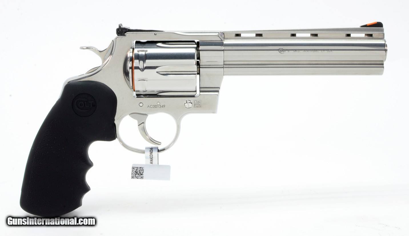 Description: BRAND NEW 2021 Colt Anaconda .44 Mag SP6RTS 6 Inch. In Blue Hard Case AVAILABLE FOR PURCHASE AT OUR ON-LINE STORE Colt’s popular Snake Gun revolver series gains a new addition with the updated Anaconda. The 2021 Anaconda has been fully re-designed to utilize an oversized Python action. Bulked-up with a solid stainless steel frame for strength and durability, this DA revolver is worthy of its pedigree. Experience the Linear Leaf Spring Action for a non-stacking, smooth-as-glass trigger pull. With recoil-absorbing Hogue grips and adjustable, interchangeable sights, this .44 Magnum is cool and comfortable from the range to the woods. A recessed target crown offers protection and the frame is drilled and tapped for optics mounts, making the Anaconda an unstoppable huntsman's sidearm. The Serial Number of the revolver is AC207536. The photos in this ad are stock and thus the serial number on it does not reflect the one on the revolver you will be receiving. SPECIFICATIONS