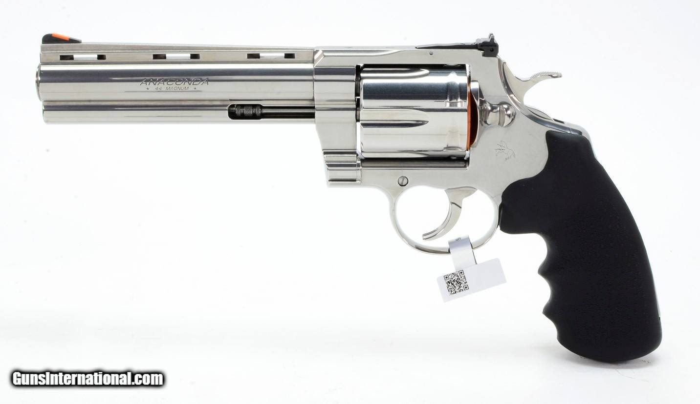 Description: BRAND NEW 2021 Colt Anaconda .44 Mag SP6RTS 6 Inch. In Blue Hard Case AVAILABLE FOR PURCHASE AT OUR ON-LINE STORE Colt’s popular Snake Gun revolver series gains a new addition with the updated Anaconda. The 2021 Anaconda has been fully re-designed to utilize an oversized Python action. Bulked-up with a solid stainless steel frame for strength and durability, this DA revolver is worthy of its pedigree. Experience the Linear Leaf Spring Action for a non-stacking, smooth-as-glass trigger pull. With recoil-absorbing Hogue grips and adjustable, interchangeable sights, this .44 Magnum is cool and comfortable from the range to the woods. A recessed target crown offers protection and the frame is drilled and tapped for optics mounts, making the Anaconda an unstoppable huntsman's sidearm. The Serial Number of the revolver is AC207602. The photos in this ad are stock and thus the serial number on it does not reflect the one on the revolver you will be receiving. SPECIFICATIONS