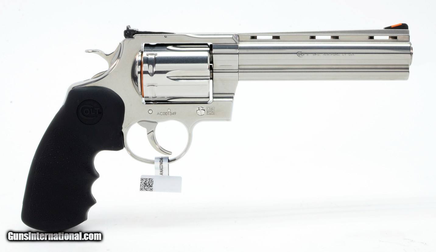 Description: BRAND NEW 2021 Colt Anaconda .44 Mag SP6RTS 6 Inch. In Blue Hard Case AVAILABLE FOR PURCHASE AT OUR ON-LINE STORE Colt’s popular Snake Gun revolver series gains a new addition with the updated Anaconda. The 2021 Anaconda has been fully re-designed to utilize an oversized Python action. Bulked-up with a solid stainless steel frame for strength and durability, this DA revolver is worthy of its pedigree. Experience the Linear Leaf Spring Action for a non-stacking, smooth-as-glass trigger pull. With recoil-absorbing Hogue grips and adjustable, interchangeable sights, this .44 Magnum is cool and comfortable from the range to the woods. A recessed target crown offers protection and the frame is drilled and tapped for optics mounts, making the Anaconda an unstoppable huntsman's sidearm. The Serial Number of the revolver is AC213146. The photos in this ad are stock and thus the serial number on it does not reflect the one on the revolver you will be receiving. SPECIFICATIONS