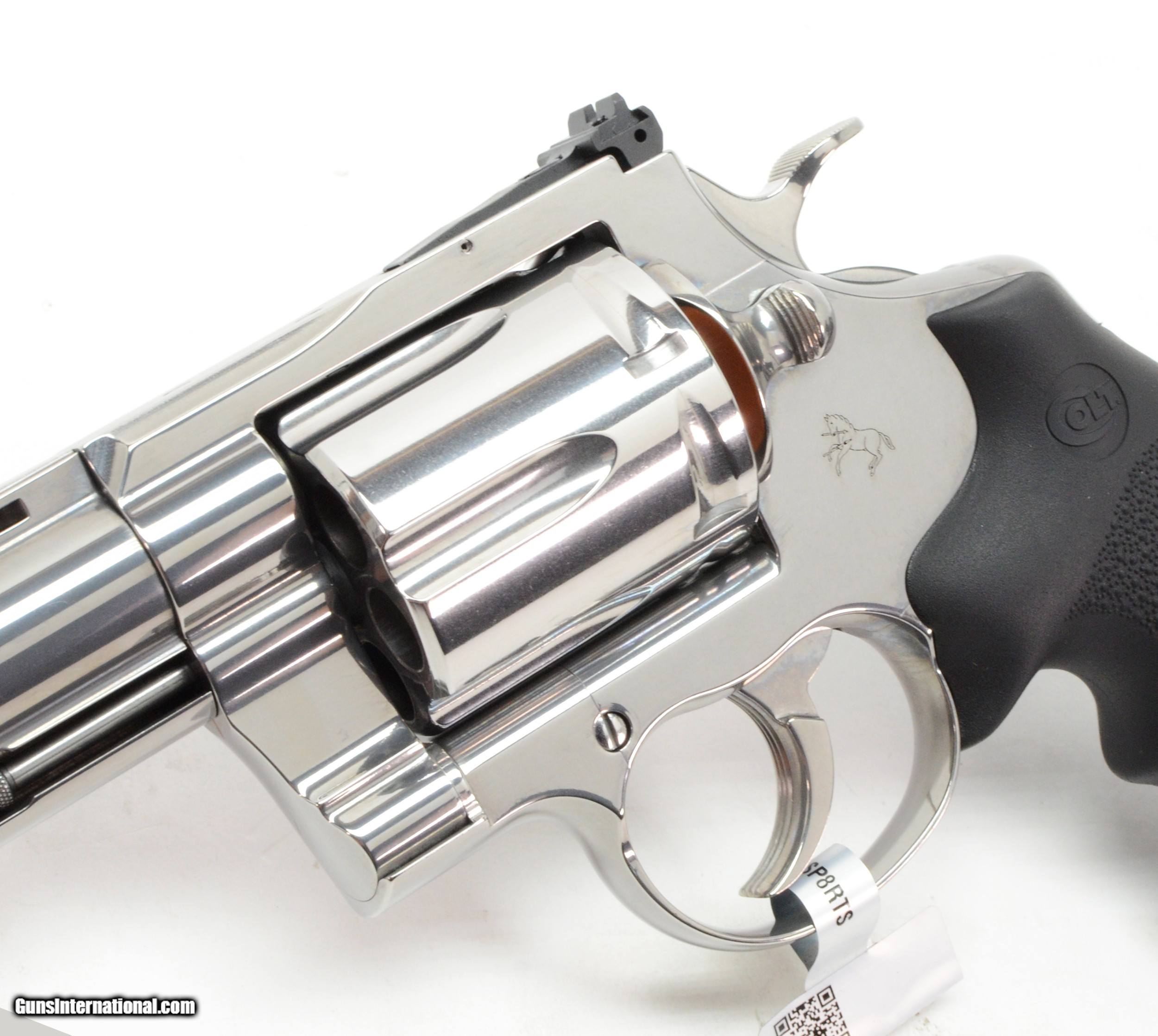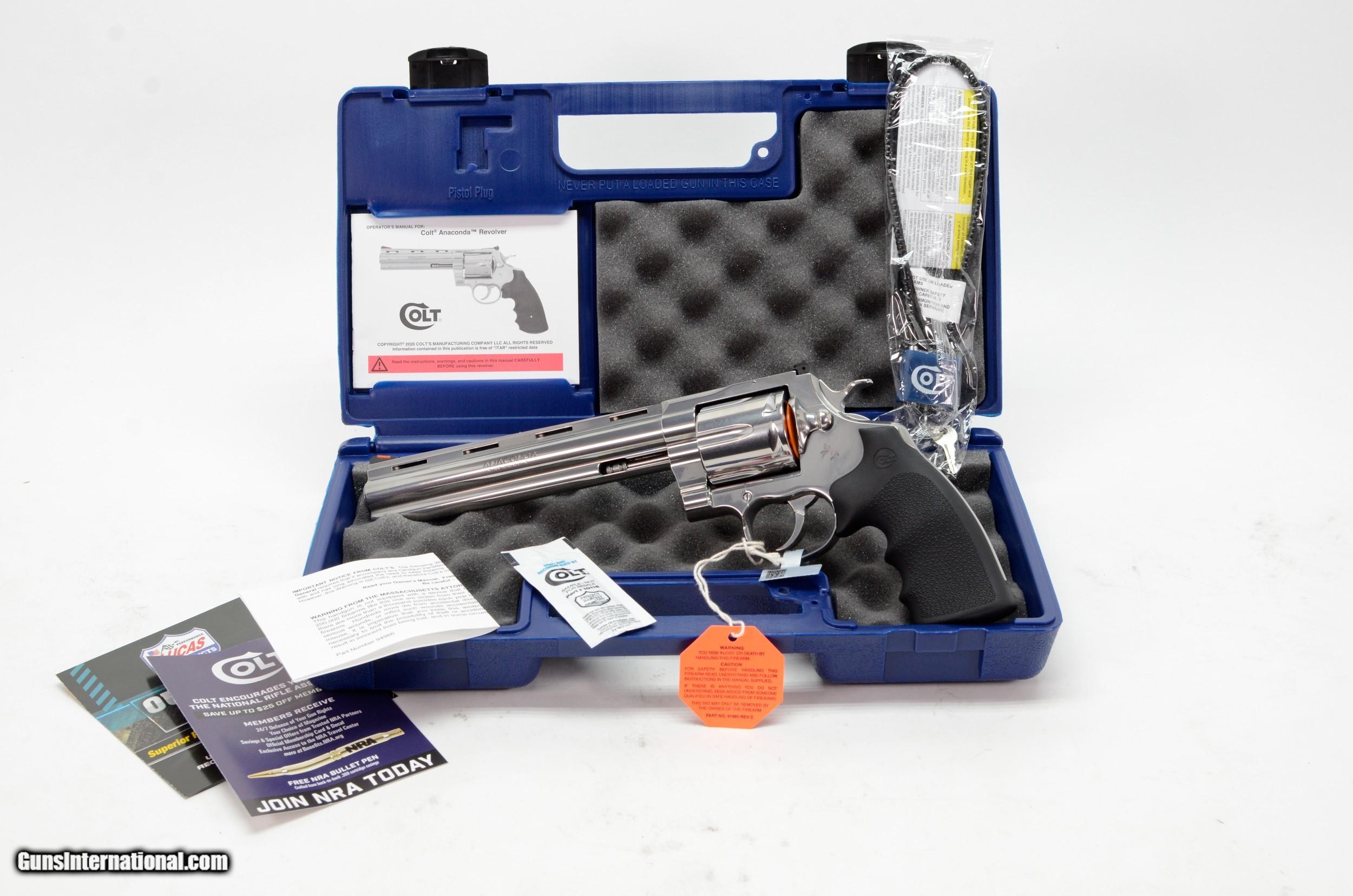 Description: BRAND NEW 2021 Colt Anaconda .44 Mag SP8RTS 8 Inch. In Blue Hard Case AVAILABLE FOR PURCHASE AT OUR ON-LINE STORE Colt’s popular Snake Gun revolver series gains a new addition with the updated Anaconda. The 2021 Anaconda has been fully re-designed to utilize an oversized Python action. Bulked-up with a solid stainless steel frame for strength and durability, this DA revolver is worthy of its pedigree. Experience the Linear Leaf Spring Action for a non-stacking, smooth-as-glass trigger pull. With recoil-absorbing Hogue grips and adjustable, interchangeable sights, this .44 Magnum is cool and comfortable from the range to the woods. A recessed target crown offers protection and the frame is drilled and tapped for optics mounts, making the Anaconda an unstoppable huntsman's sidearm. The Serial Number of the revolver is AC211894. The photos in this ad may be stock and thus the serial number on it may not reflect the one on the revolver you will be receiving. SPECIFICATIONS