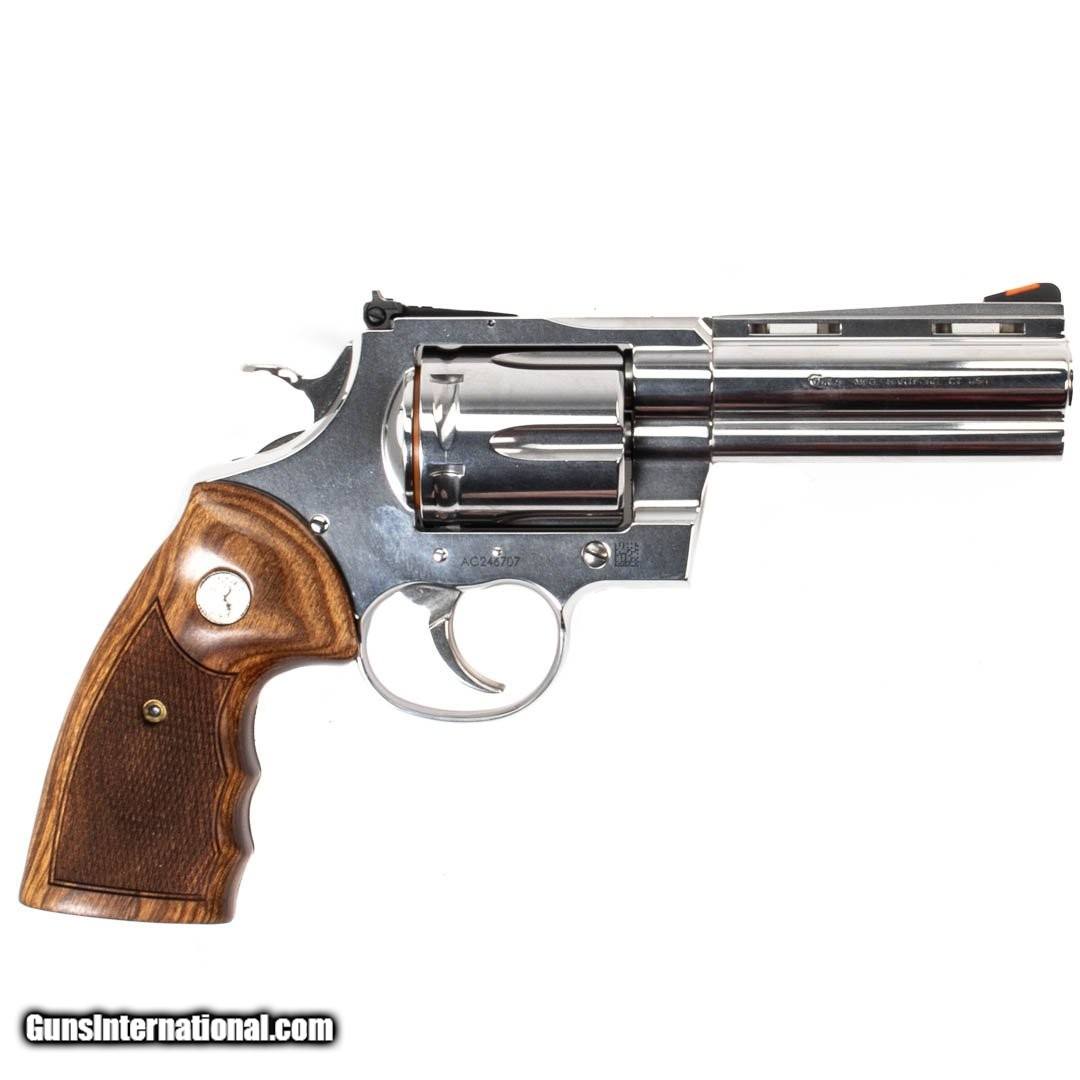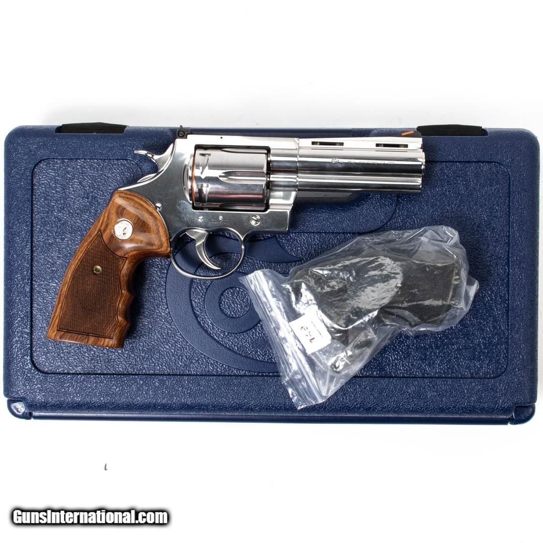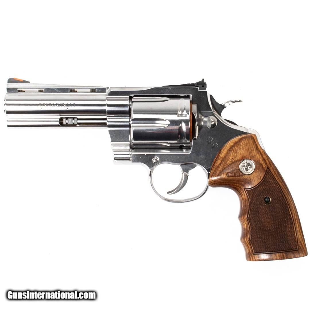 This Colt Anaconda features a vent rib and an adjustable rear sight. It comes with Colt rubber grips, Colt checkered wood grips with a silver medallion (installed), and Colt smooth wood grips with a silver medallion. Purchase also includes the original case, manual, and two speed loaders.
