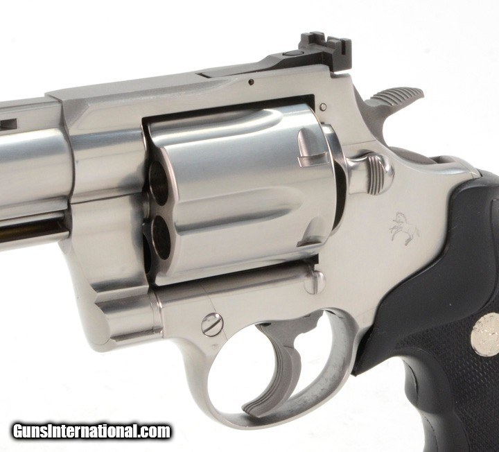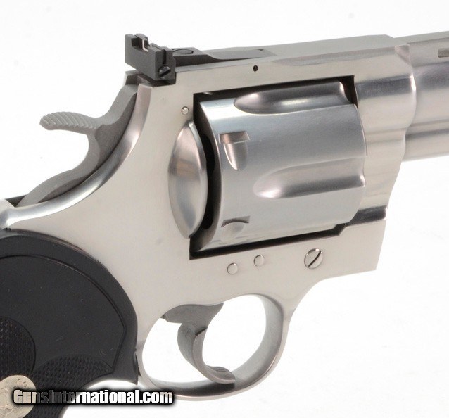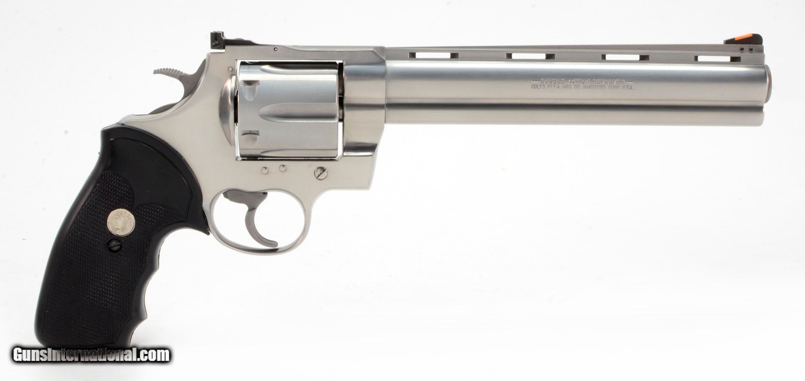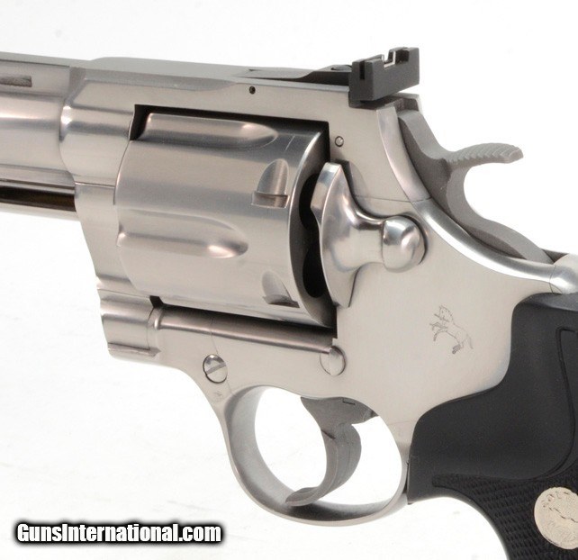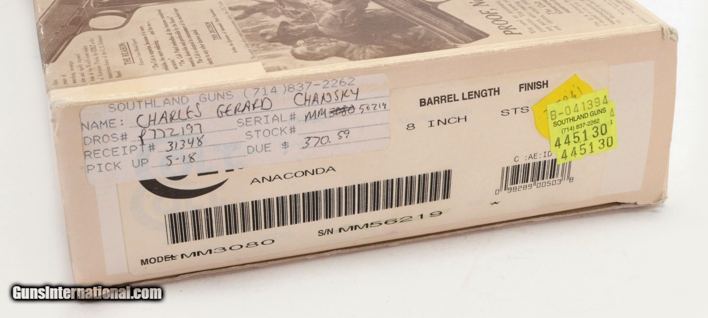 Description: Colt Anaconda 44 Mag. 8 Inch Satin Stainless. Like New In Hard Case, With Original Picture Box AVAILABLE FOR PURCHASE AT OUR ON-LINE STORE The Colt Anaconda, introduced in 1990, is a large frame double-action revolver featuring a full length under-barrel ejection-rod lug and six round cylinder, designed and produced by the Colt's Manufacturing Company. Chambered for the powerful .44 Magnum and .45 Colt center fire ammunition cartridges, the Anaconda marked the Hartford, Connecticut firm’s first foray into the popular large-bore Magnum pistol market.