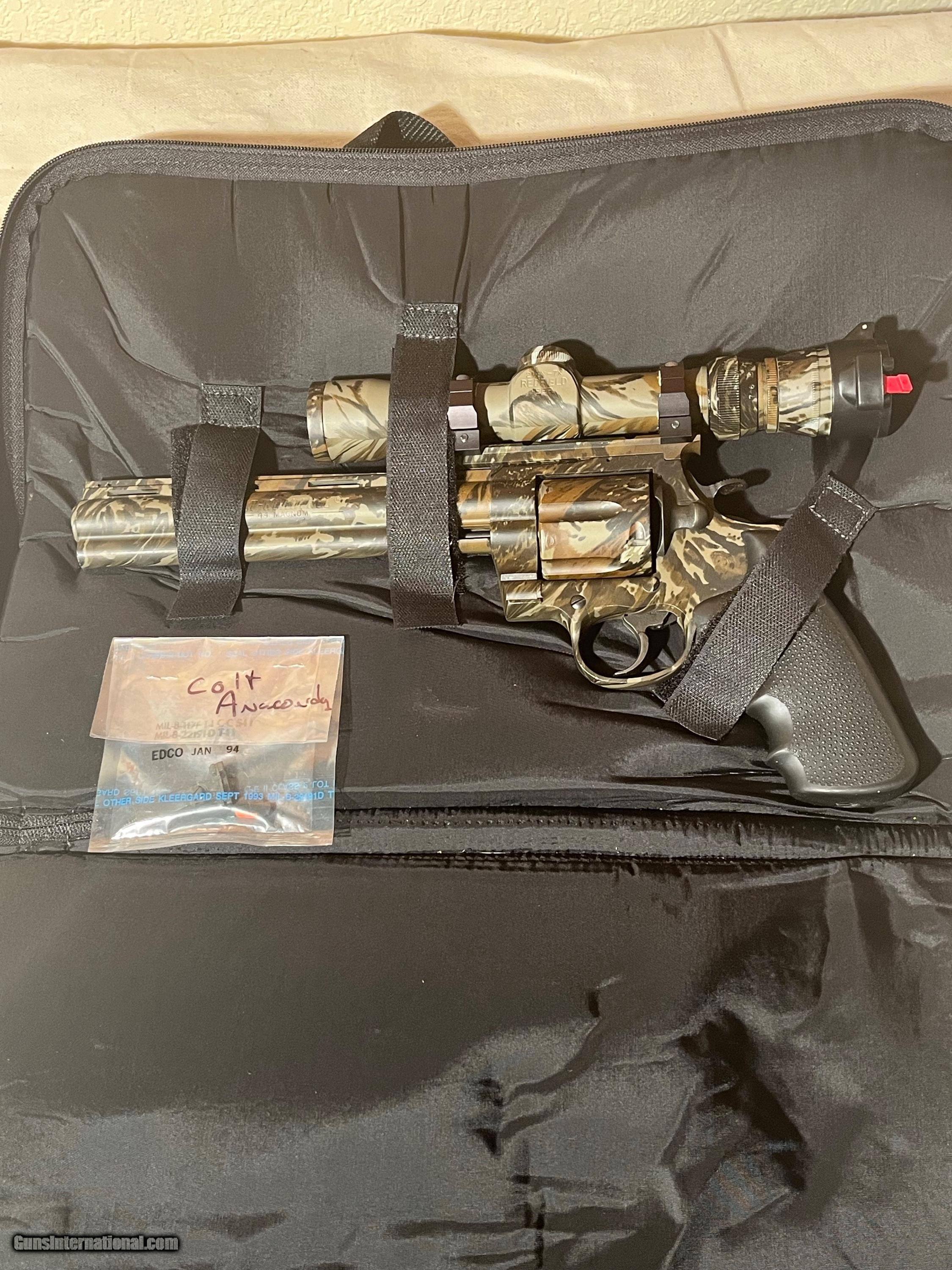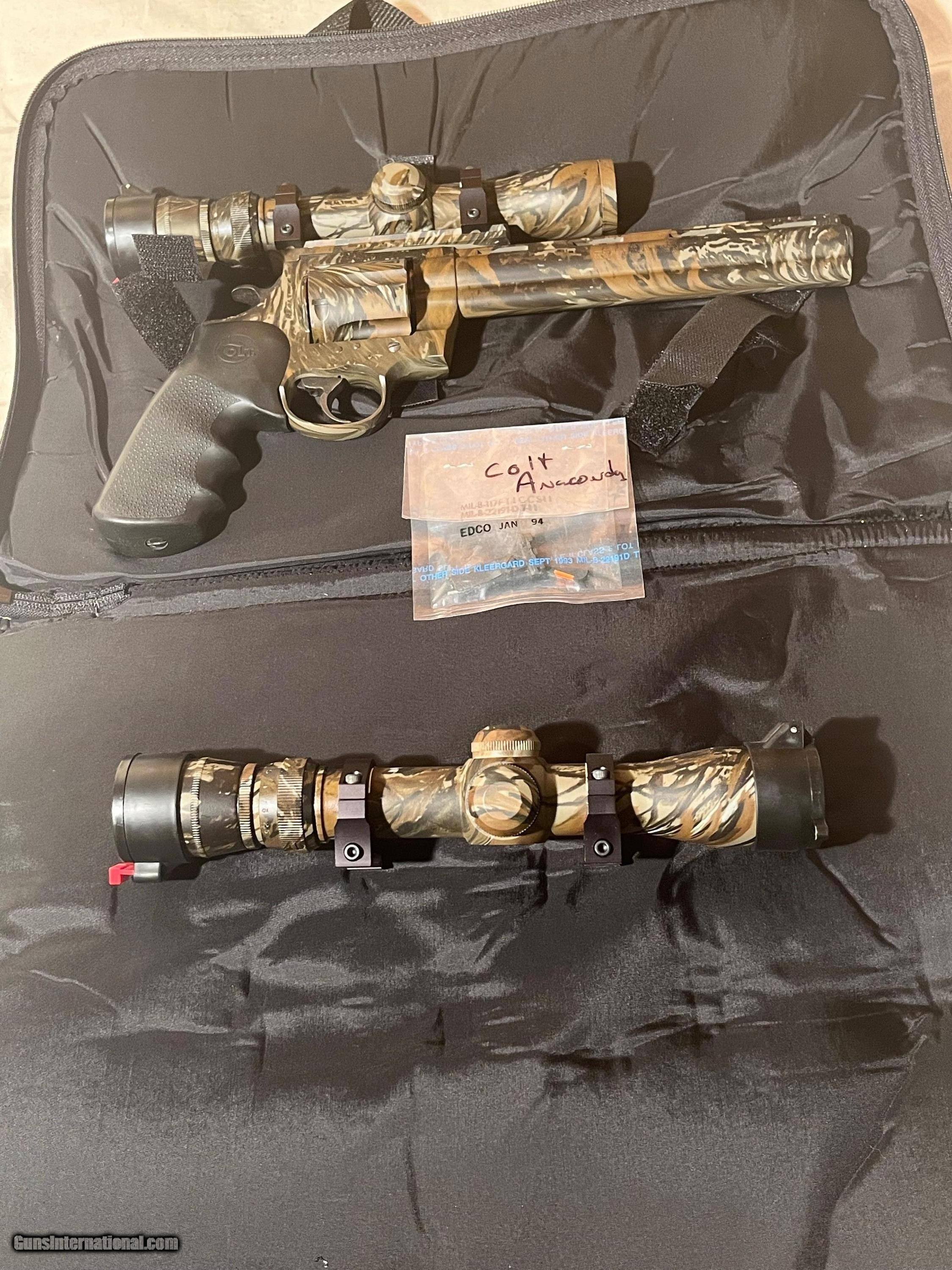 Description: Nice condition. I have not fired in many years. Used occasionally to hunt whitetail. These seem to be fairly scarce. I have the original soft case. I also have a second scope and rings, bought it at a gunshow as a back up. Also have the original iron sights that came as part of the package. I used a red dot sight, was easier to acquire the target, raher than trying to line up the scope! Price is $2750 with one scope $250 for the back up. Will seperate. SOLD Handgun Caliber: .44 Remington Magnum Manufacturer: Colt Model: Anaconda Barrel Length: 8” Condition: EX Metal Condition: EX Bore Condition: EX |