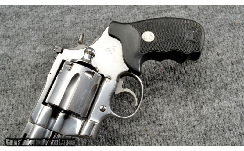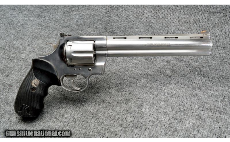 Description: Colt's Anaconda, one of their seven snake-themed revolvers, is a high-powered .44 Magnum 6 shot that packs quite the punch. This Anaconda is in very good condition, with surface marks on the barrel and frame. The bore is excellent and clean with sharp rifling throughout. SOLD Manufacturer: 1995 Caliber Info: .44 Magnum Chambers: 6 shot Metal Condition: Very Good- handling marks on frame and barrel Bore Condition: Excellent- clean, sharp rifling Barrels: 8 inch Triggers: 4.5 lb single action, >8 lb double action Butt Pad: Rubber Colt grips Weight: 57 oz Sights: Orange ramp front, adjustable rear Item Location: Gainesville, VA |