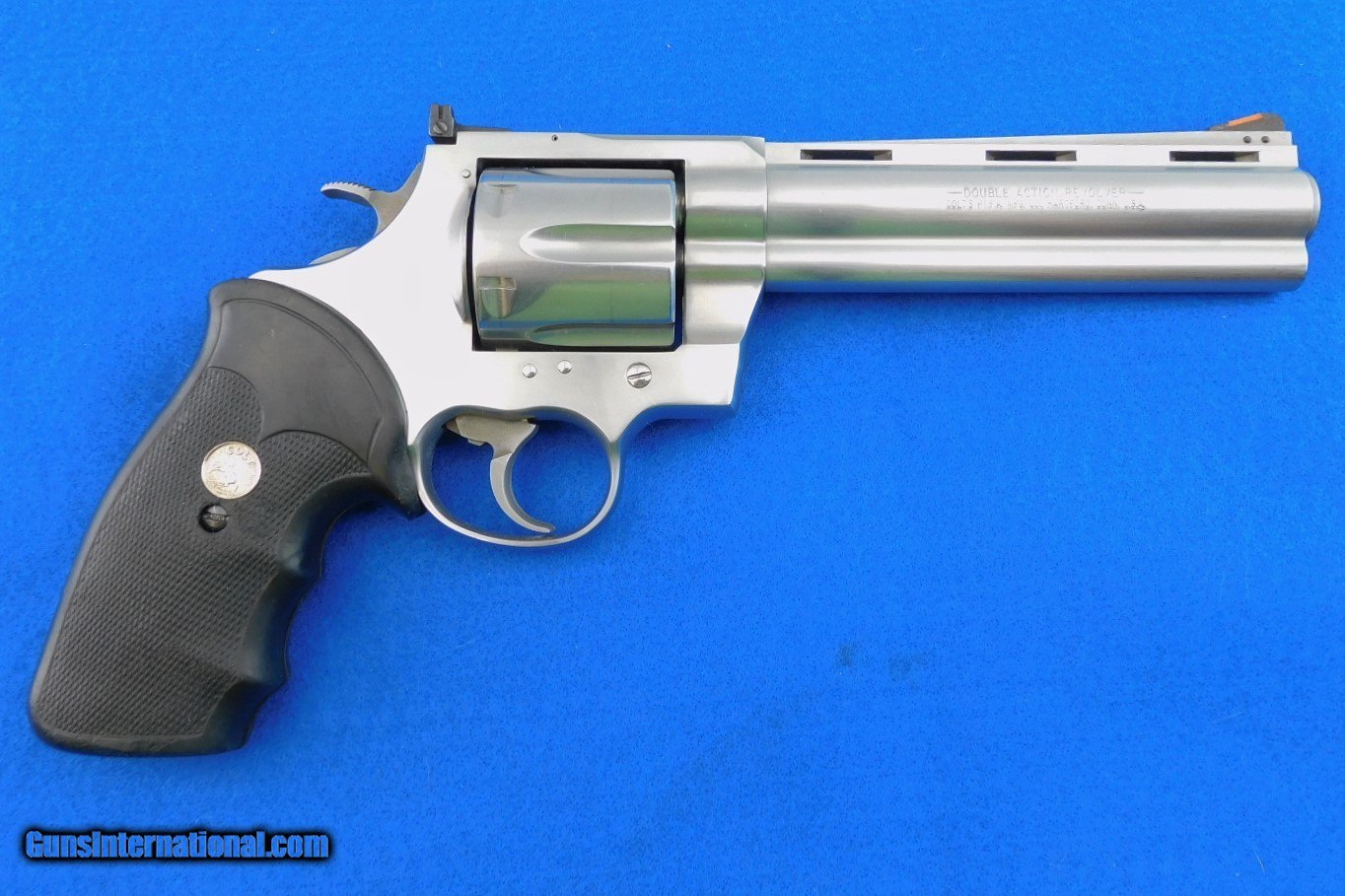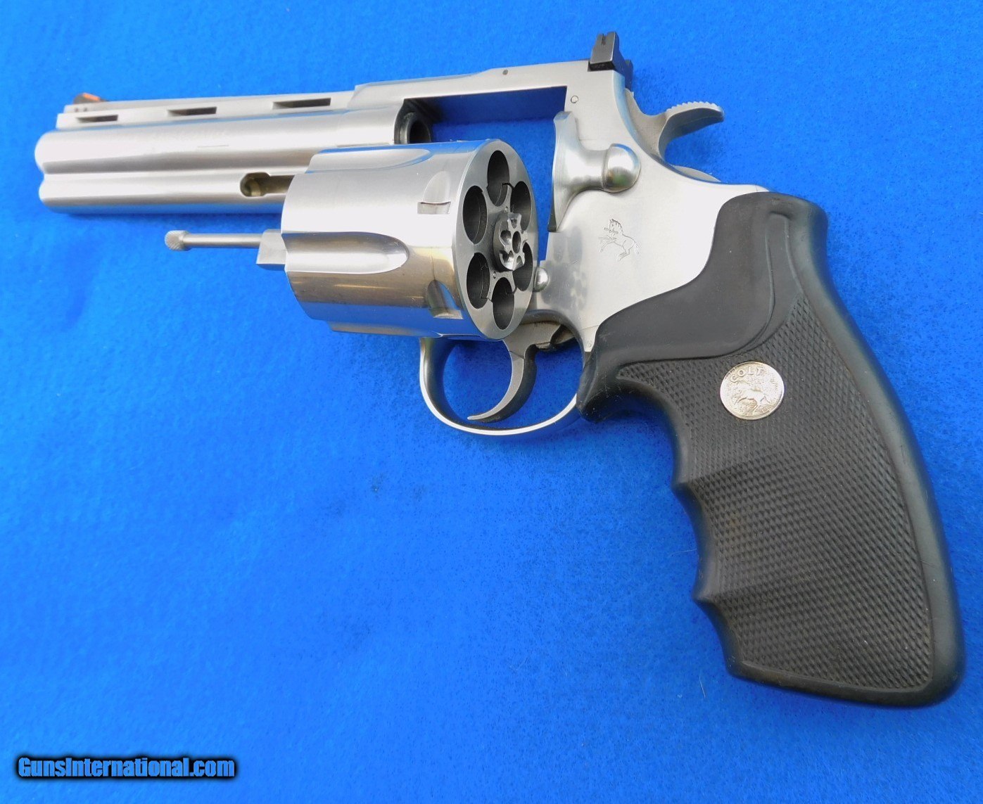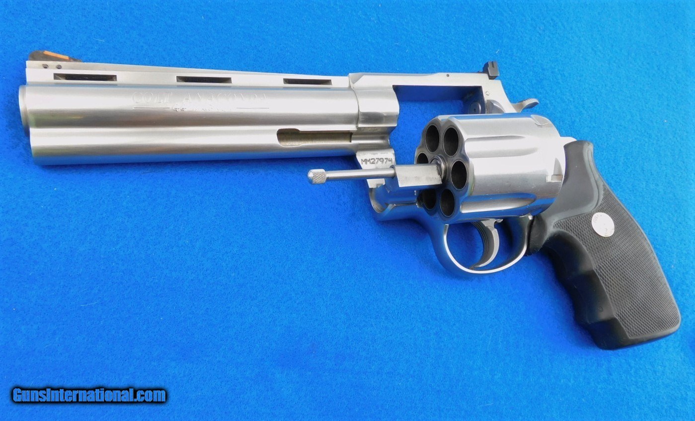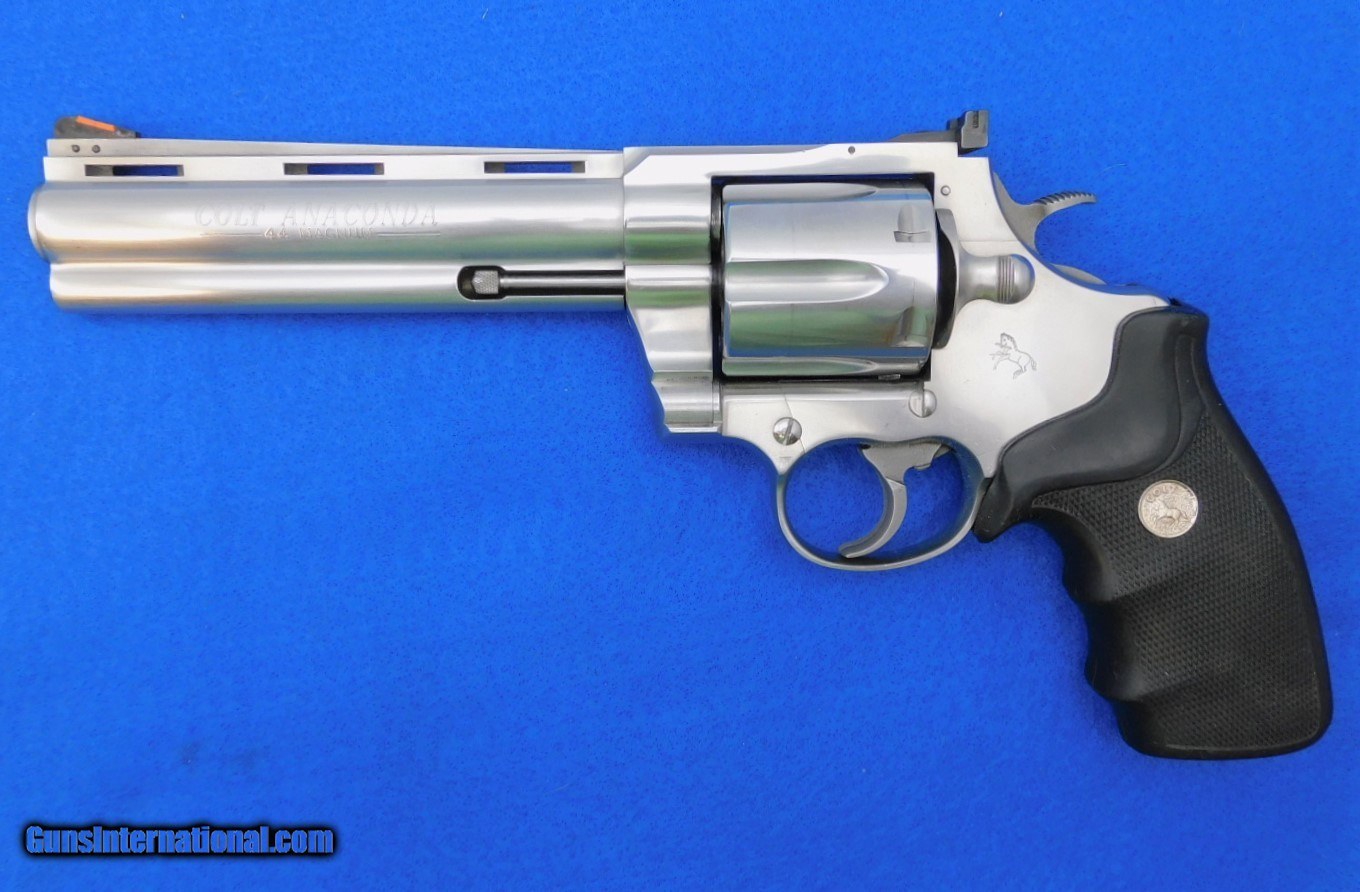 Description: Colt Anaconda 44 MAG, 6in vented rib barrel, shiny bore, good rifling, adjustable white line square notch rear sight, red ramp front sight, full length ejector rod housing, transfer bar safety, 6 shot, stainless steel, and black checkered combat grips with Colt medallion. This is a very nice revolver with few handling marks, tight action, and clean bore. Add 3% for Credit Card Shipping $25.00 (AK & HI actual cost) SOLD |