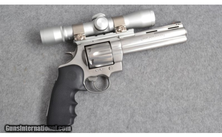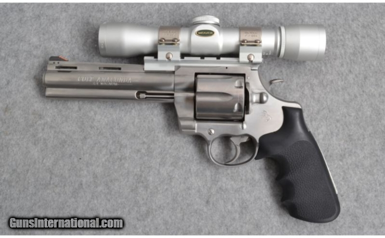 Description: Nice Colt Anaconda with a weaver scope and mount. Missing rear notch rear sight. SOLD Caliber Info: .44 Magnum Chambers: Double action 6 shot revolver Metal Condition: Great conditon with minor wear from use in the field Bore Condition: Bright bore Barrels: 6 Inches Triggers: Stock Stock: Hogue rubber grips Sights: Weaver 4 power EER scope Item Location: Lone Tree, CO |