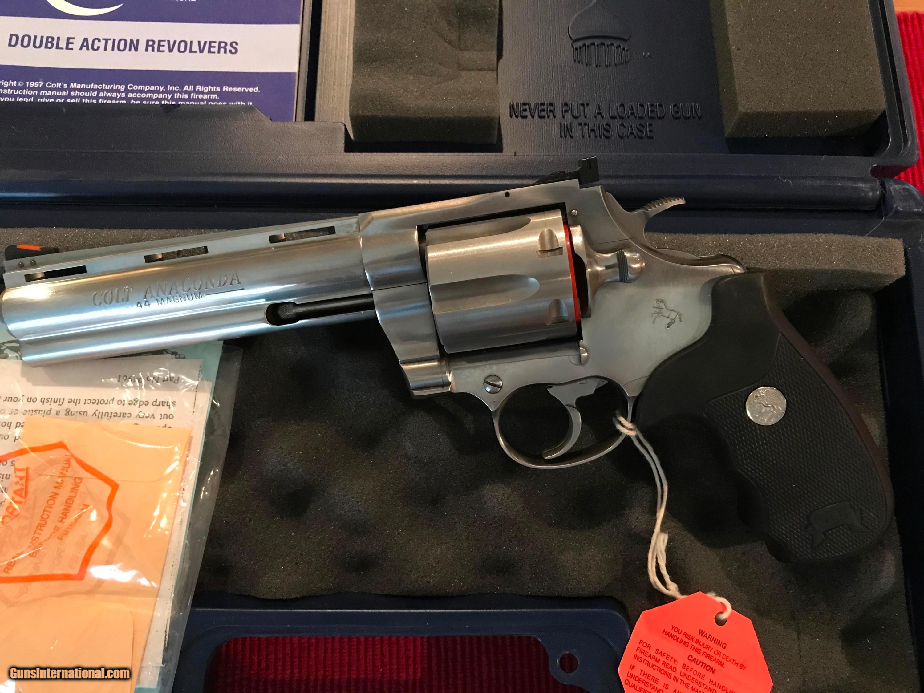 Description: Why mess with the REST, when you have found the BEST!! This Colt Anaconda 44 Magnum is a six-shot revolver-NIB. Features the much sought-after 6" ventilated rib, factory drilled & tapped for scope mounting. Has Colt black rubber grips. Includes original blue, hard locking case with all the paperwork. Please include $55.00 for shipping/handling/insurance. IT IS UP TO THE BUYER TO DETERMINE IF THE FIREARM IS LEGAL IN YOUR AREA PRIOR TO YOUR PURCHASE. THE FIREARM WILL BE SHIPPED TO THE FFL HOLDER THAT YOU SPECIFY. THEIR RELEASE TO YOU IS BASED ON YOUR PRIOR ARRANGEMENTS WITH THEM. IF YOU ARE INTERESTED IN A COLT ANACONDA .45 SIX-SHOT REVOLVER, PLEASE SEE OUR OTHER AD UNDER COLT.45s; THESE GUNS HAVE NEARLY IDENTICAL SERIAL #'S AND WOULD BE A GREAT SET!! SOLD Manufacturer: Colt Model: Anaconda Serial Number: S/N AN098XX Caliber Info: 44 Mag Bore: Bright & Shiny Chambers: 6-shot revolver Condition: NIB Metal Condition: New Bore Condition: New Barrel Type: Ventilated rib Action: SA/DA Triggers: Stainless steel Stock: Colt rubber grips Weight: 3.2 lbs Sights: Front-fixed orange blade; rear-adjustable with white outline Extras: All original paperwork Case: Hard, blue locking Item Location: Pueblo West |