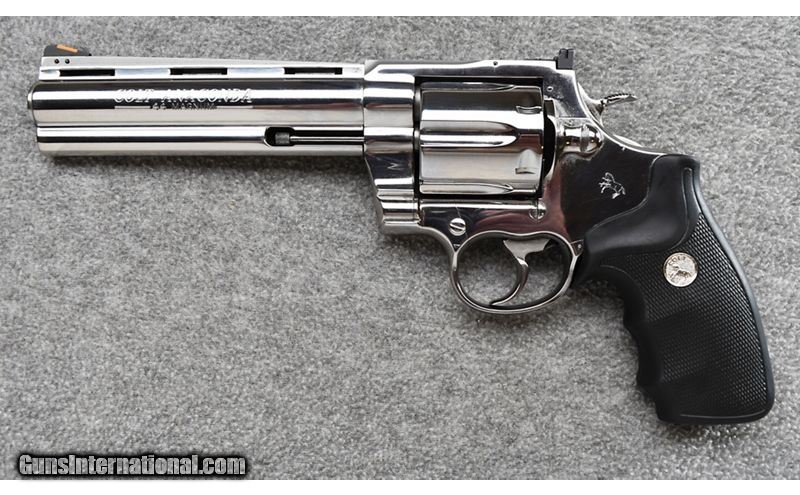 Description: This Colt Anaconda was manufactured in 1984 and remains excellent throughout showing little use. Light drag ring on cylinder. Complete with original Colt blue plastic case and paperwork! .44 Magnum SOLD Metal Condition: Excellent Bore Condition: Excellent Barrels: 6" Vent Rib - Full Lug Triggers: Factory Target Trigger - Wide Target Hammer Butt Pad: Checkered Black Rubber Colt Grips with Colt Medallion Weight: 52 oz. Sights: Ramp Front with Orange Insert - Adjustable White Outline Square Notch Rear Item Location: Wheeling |