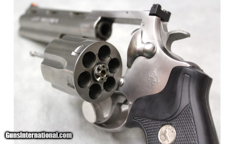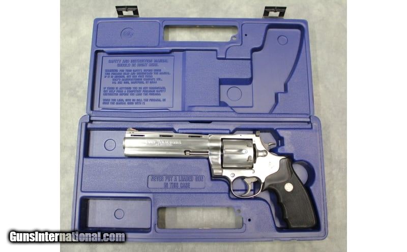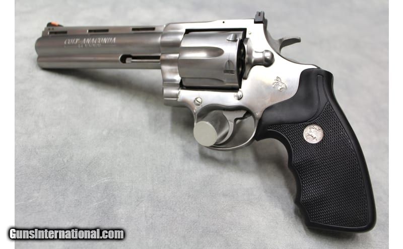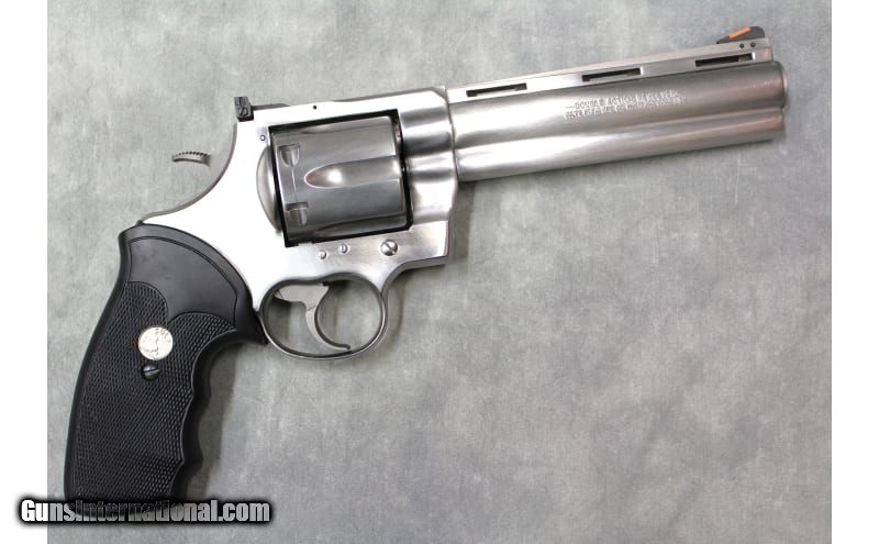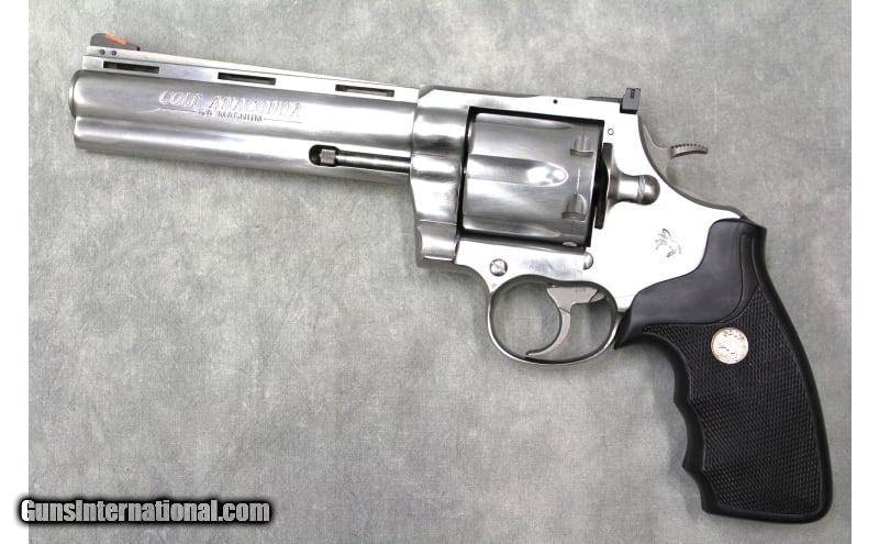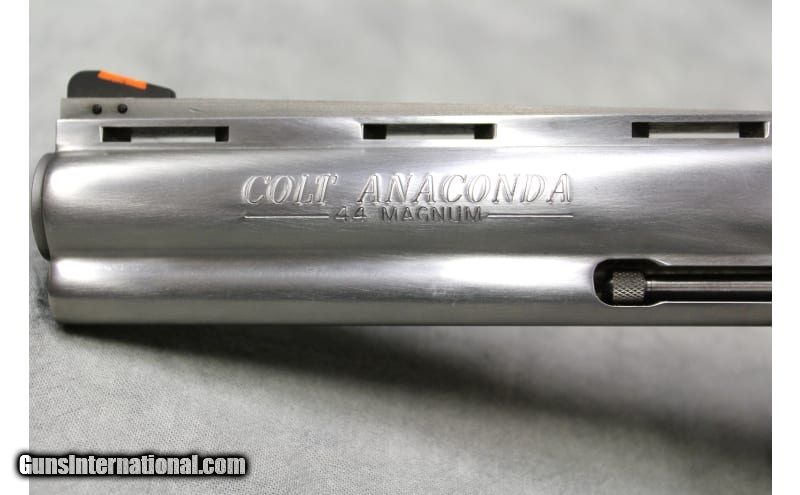 Description: This is a USED Colt Anaconda 'Ultimate Bright' Double Action Revolver chambered in the powerful .44 Magnum. It has a 6-inch full lug ventilated rib barrel with an excellent bore. This Anaconda was manufactured in 1993 and features the company's "Ultimate bright" polished stainless steel. The metal surfaces rate Overall Excellent with a few minor handling marks. The serrated service trigger and target hammer both rate Overall Excellent. The checkered rubber factory grips with silver Rampant Colt medallions are in overall Excellent condition with some light handling/use wear. .44 Magnum SOLD Chambers: 6 Metal Condition: Overall Excellent with some signs of light to moderate use. Bore Condition: Excellent Barrels: 6 Weight: 3 lbs Sights: "Fixed ramp front sight with Hi-viz orange insert, adjustable rear sight. Item Location: Las Vegas, NV |