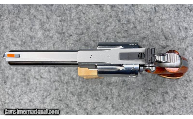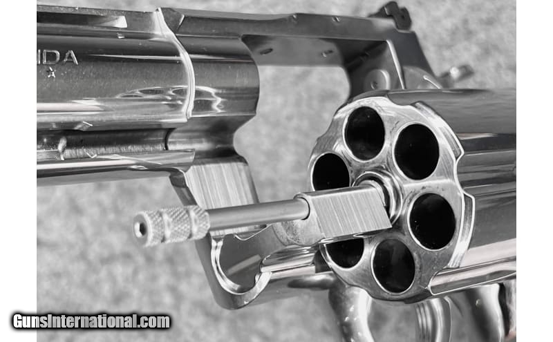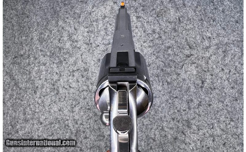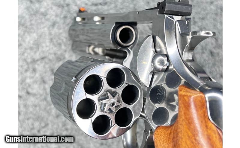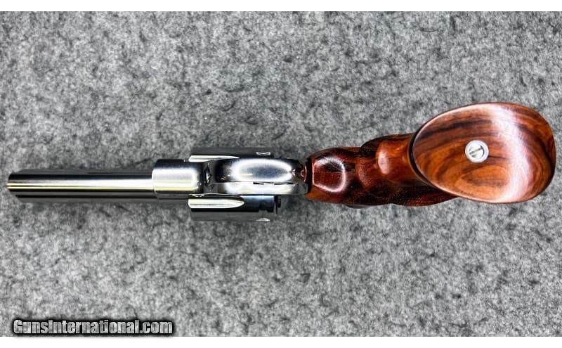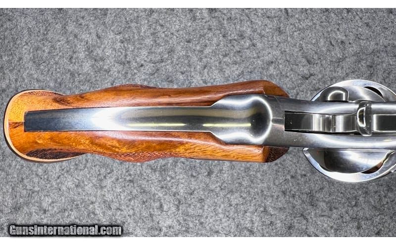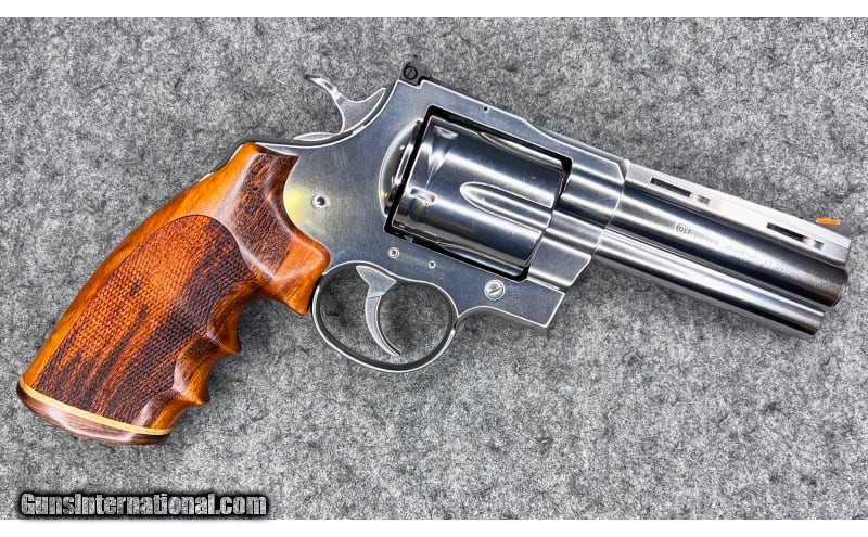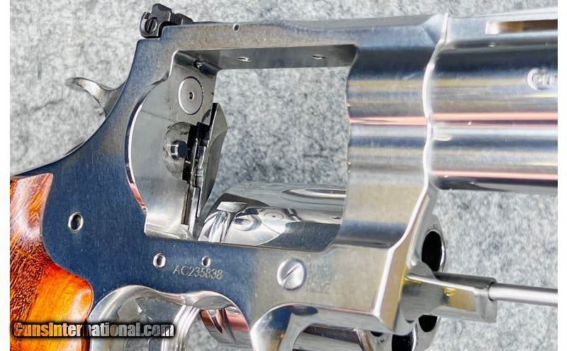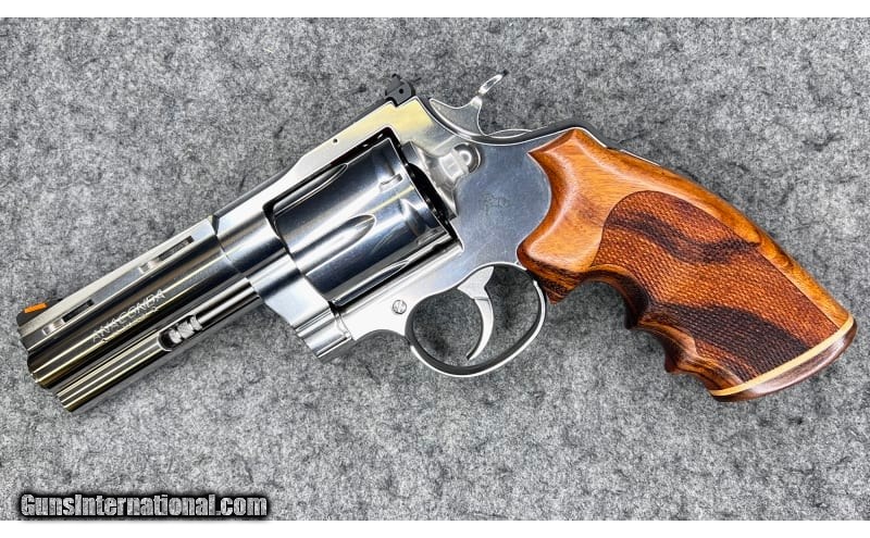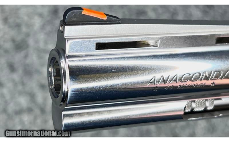 Description: This six-round double action revolver is a Colt Anaconda chambered in .44 Magnum. It has a 6-round fluted cylinder, a 4¼" ventilated rib, full lug barrel, a fixed ramped blade front sight, an adjustable square notch blade rear sight, and a knurled knob, shrouded ejector rod. The stainless steel finish is in excellent condition, with little to no handling wear evident. Likewise, the one-piece checkered wood grips are in excellent condition, with no discernable wear observable. It comes with the original factory blue plastic case, owner's manual, and orange safety label. .44 Magnum SOLD Chambers: 6-round fluted cylinder Metal Condition: "Stainless steel finish is in excellent condition, with little to no handling wear evident Wood Condition: One-piece checkered wood grips are in excellent condition Bore Condition: Bore is bright and shiny with strong rifling intact Barrels: "4¼"" ventilated rib, full lug barrel Triggers: Curved serrated trigger Stock Dimensions: 10¼" overall length Fore End: "Knurled knob, shrouded ejector rod Butt Pad: "Dark walnut, finger-grooved checkered grips Weight: 3lb Sights: "Fixed ramped blade front sight, adjustable square notch blade rear sight Item Location: Wichita, KS |