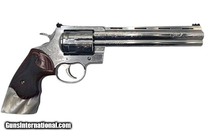 COLT ANACONDA .44 MAG 8\" BARREL ENGRAVED ROSEWOOD AND PEARL GRIPS 1 OF 250 This eye catching custom-engraved cylinder and frame is uniquely paired with rosewood and pearl grips, creating a legendary look that combines beauty & exceptional craftsmanship. Every piece comes with a certificate of authenticity, signed by the owner of CNC Firearms. CNC Firearms honors the integrity of \"Colt Rosewood Anaconda 44 Mag\" and promises to never reproduce these pieces again to allow every piece to increase in value as a family heirloom to be passed down for generations.