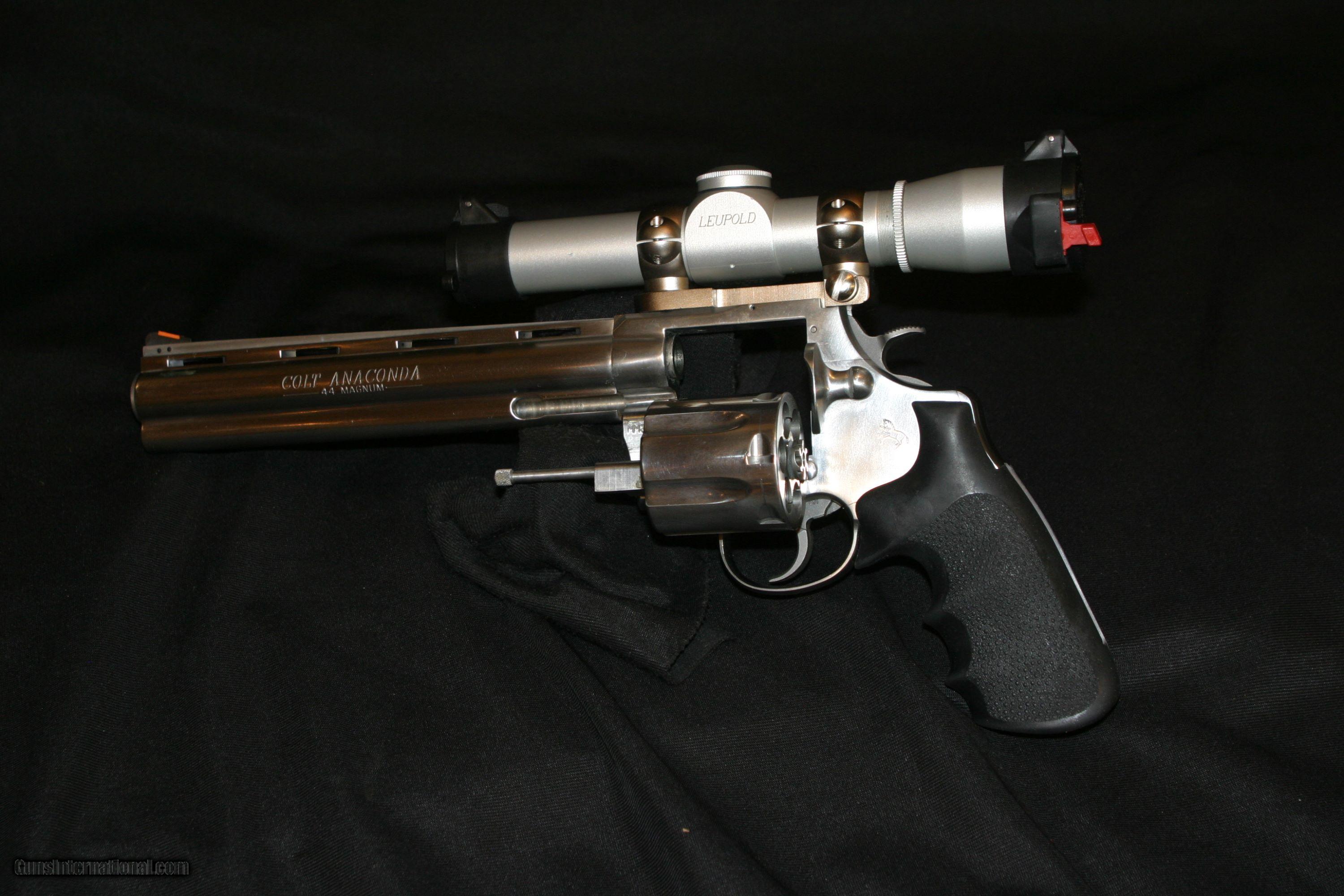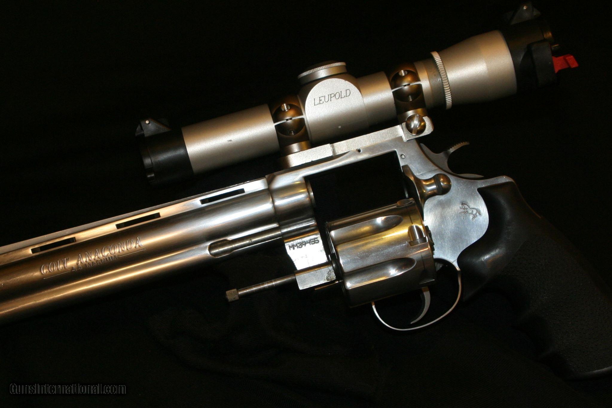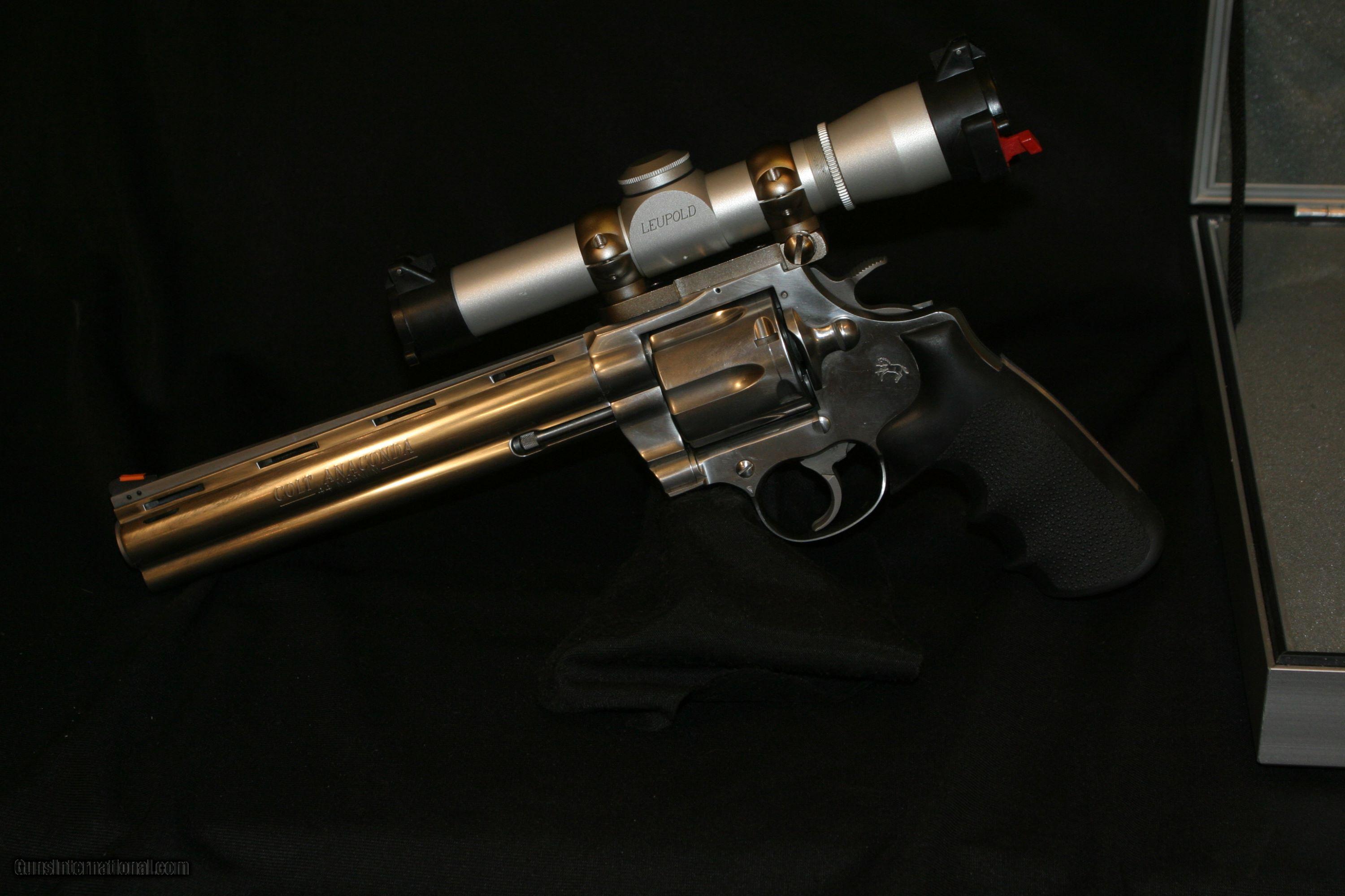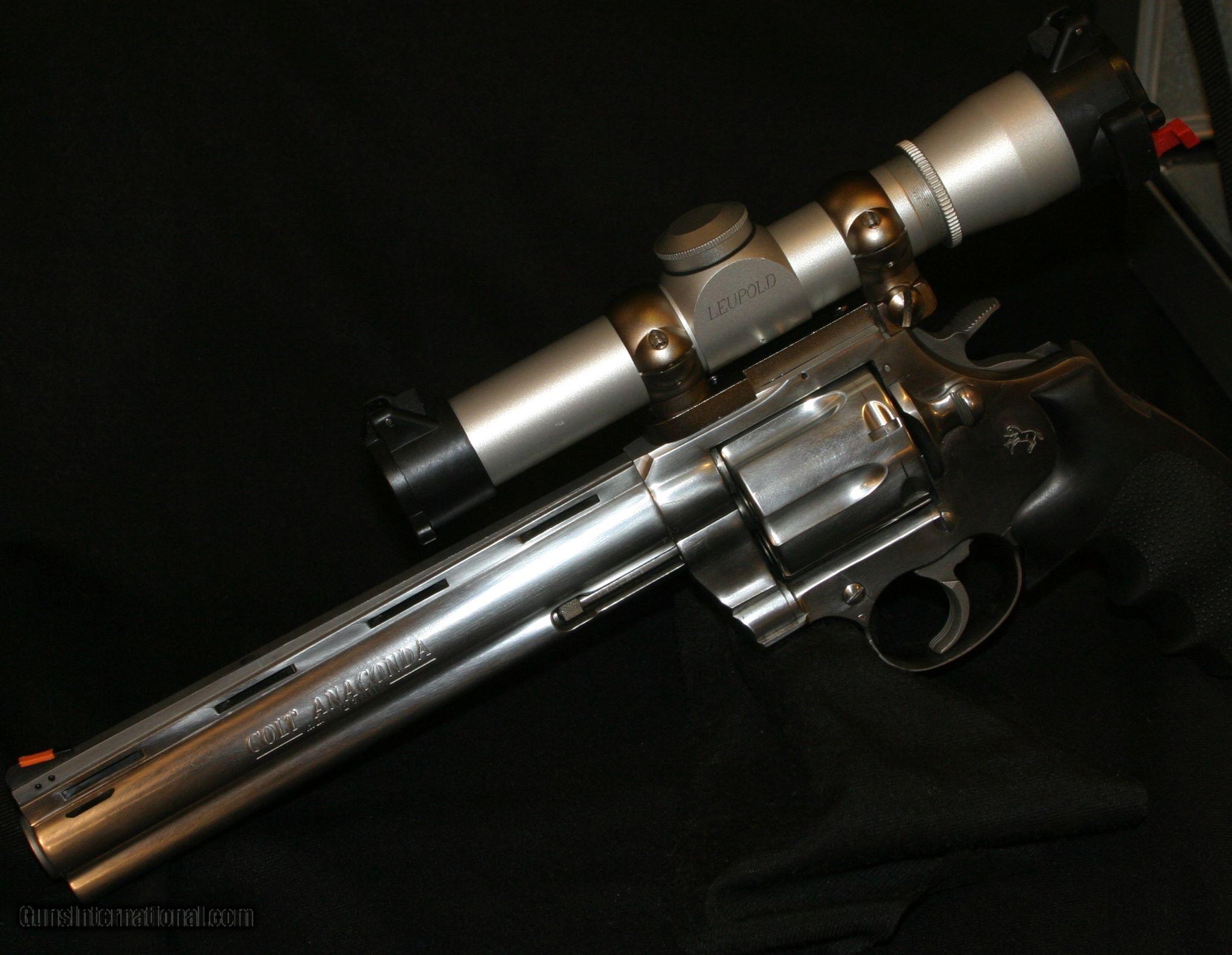 Description: ALL ORIGINAL 8" COLT ANACONDA IN .44 MAGNUMES WITH A MOUNTED LEUPOLD 2X PISTOL SCOPE AND CARRY CASE, MAG-NA-PORTED. SOLD |