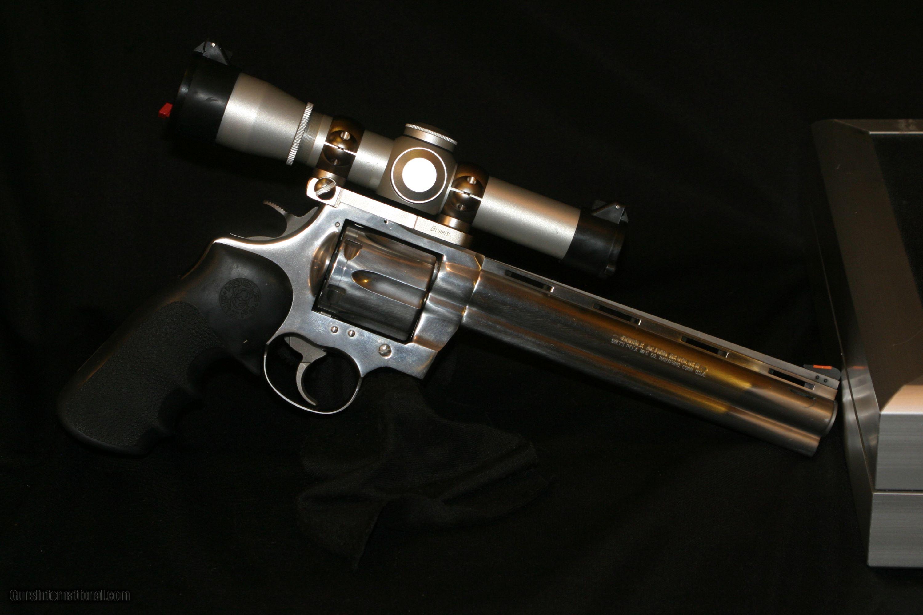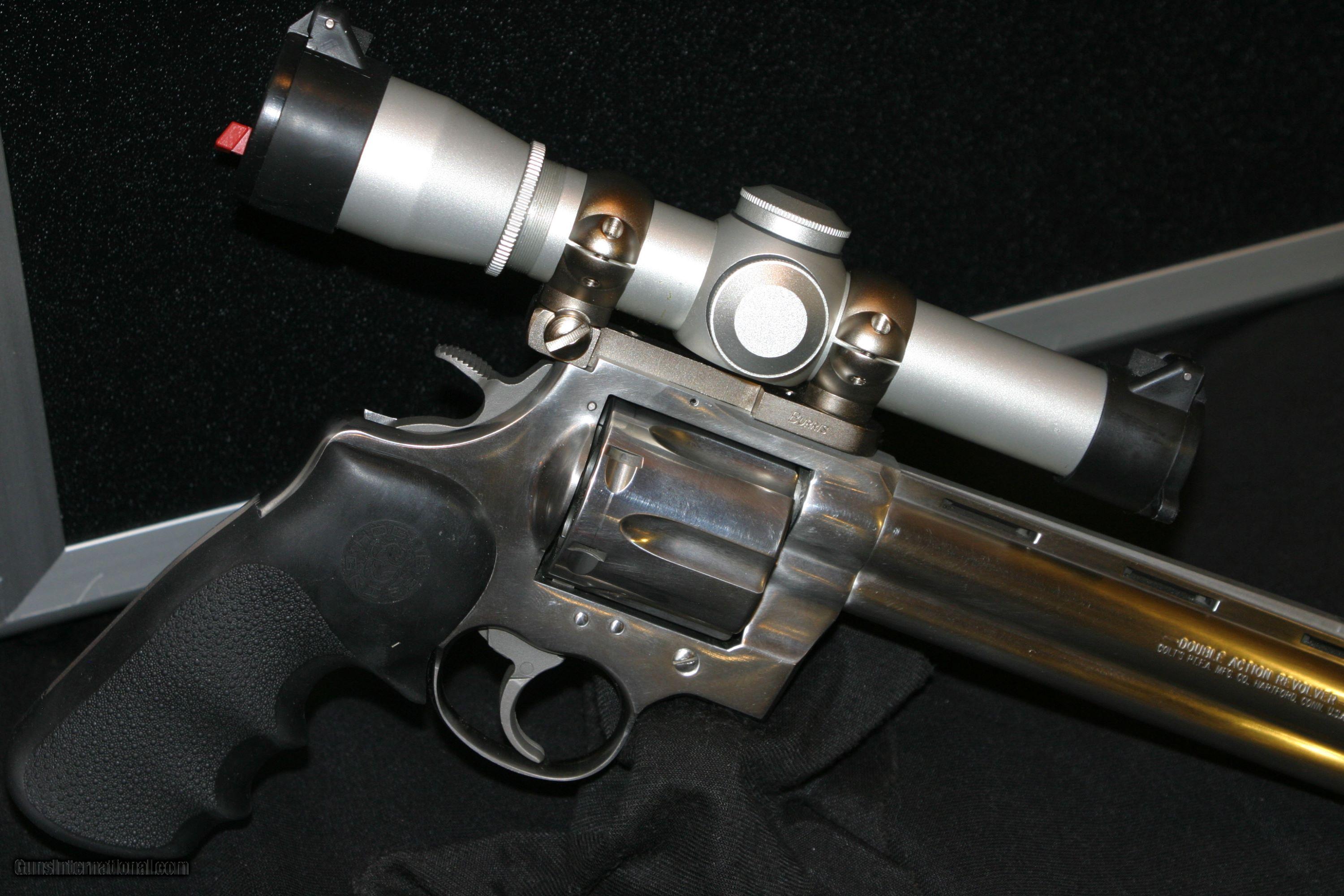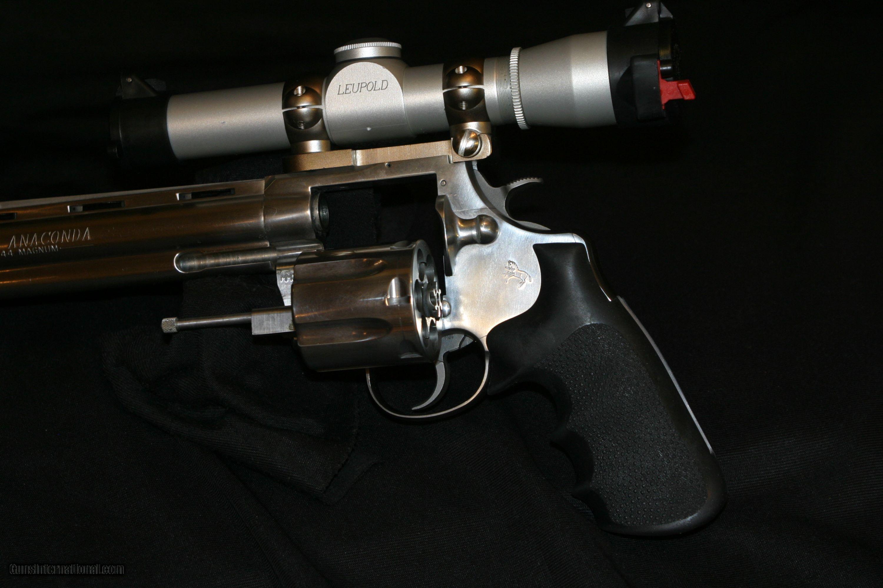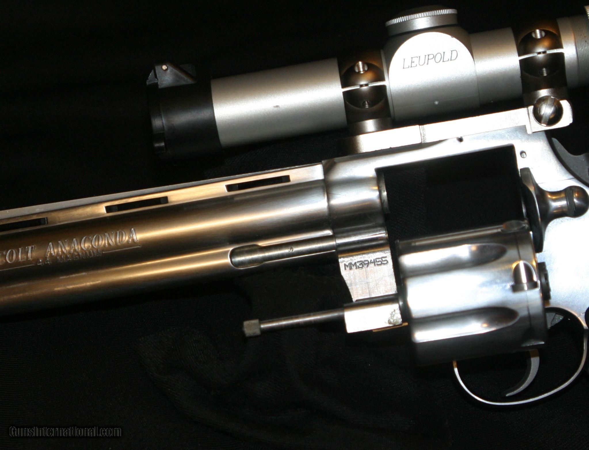 Description: ALL ORIGINAL 8" COLT ANACONDA IN .44 MAGNUMES WITH A MOUNTED LEUPOLD 2X PISTOL SCOPE AND CARRY CASE, MAG-NA-PORTED. SOLD |