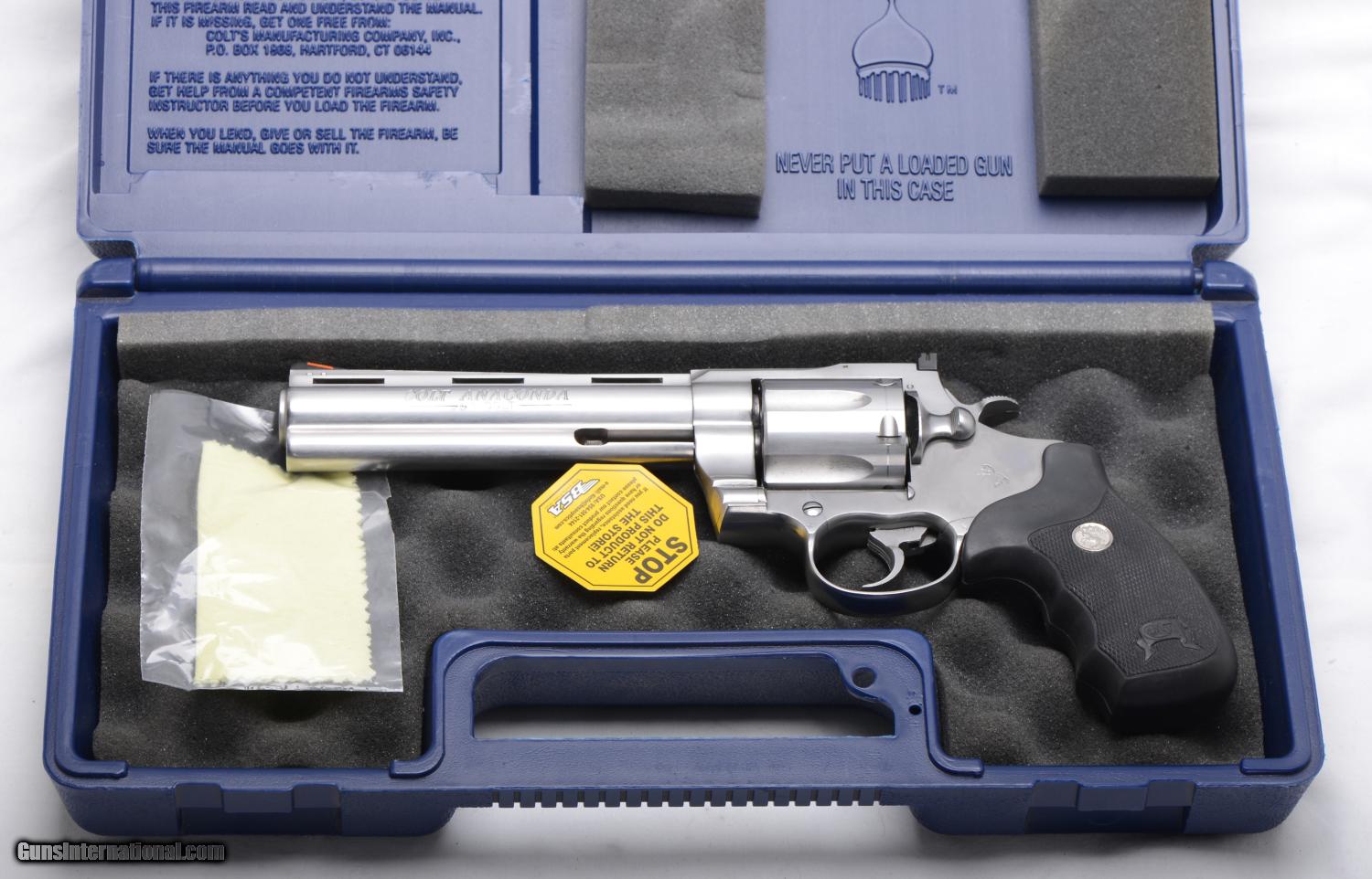 Description: Colt Anaconda .45 long colt revolver. 6” stainless steel made in 1999. This is the “must have” Anaconda for the Colt Snake collector. Although this gun has been fired it apparently had been shot very little as the condition remains at 98%. Original box. SOLD |