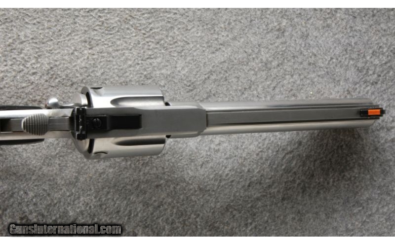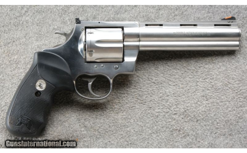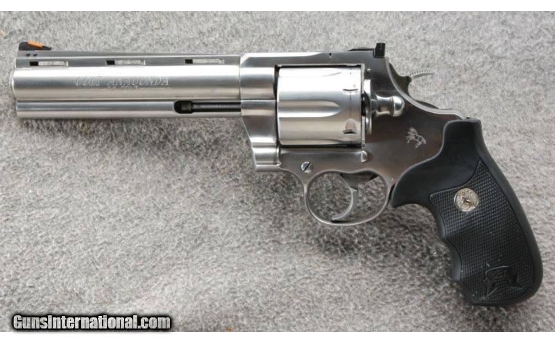 Description: This is a hard to find Colt Anaconda in .45 LC. The revolver has been fired but still looks great. There is a light turn line and a couple of very small marks you have to look for on the stainless steel but nothing bad. The grips are in excellent conditon. All in all a nice and hard to find Colt Snake gun. SOLD Caliber Info: .45 Long Colt. Chambers: 6 Shot revolver. Metal Condition: Excellent. Wood Condition: The grips are excellent. Bore Condition: Excellent. Barrels: 6 inch stainless steel with a vent rib and sights. Triggers: Single for single and double action. Stock: Black Colt rubber grips with Colt medallions. Weight: 3 Lbs 2 Oz. Sights: Adjustable rear and a fixed blade with orange insert front. Extras: Comes with the factory case. Item Location: Owatonna, MN |