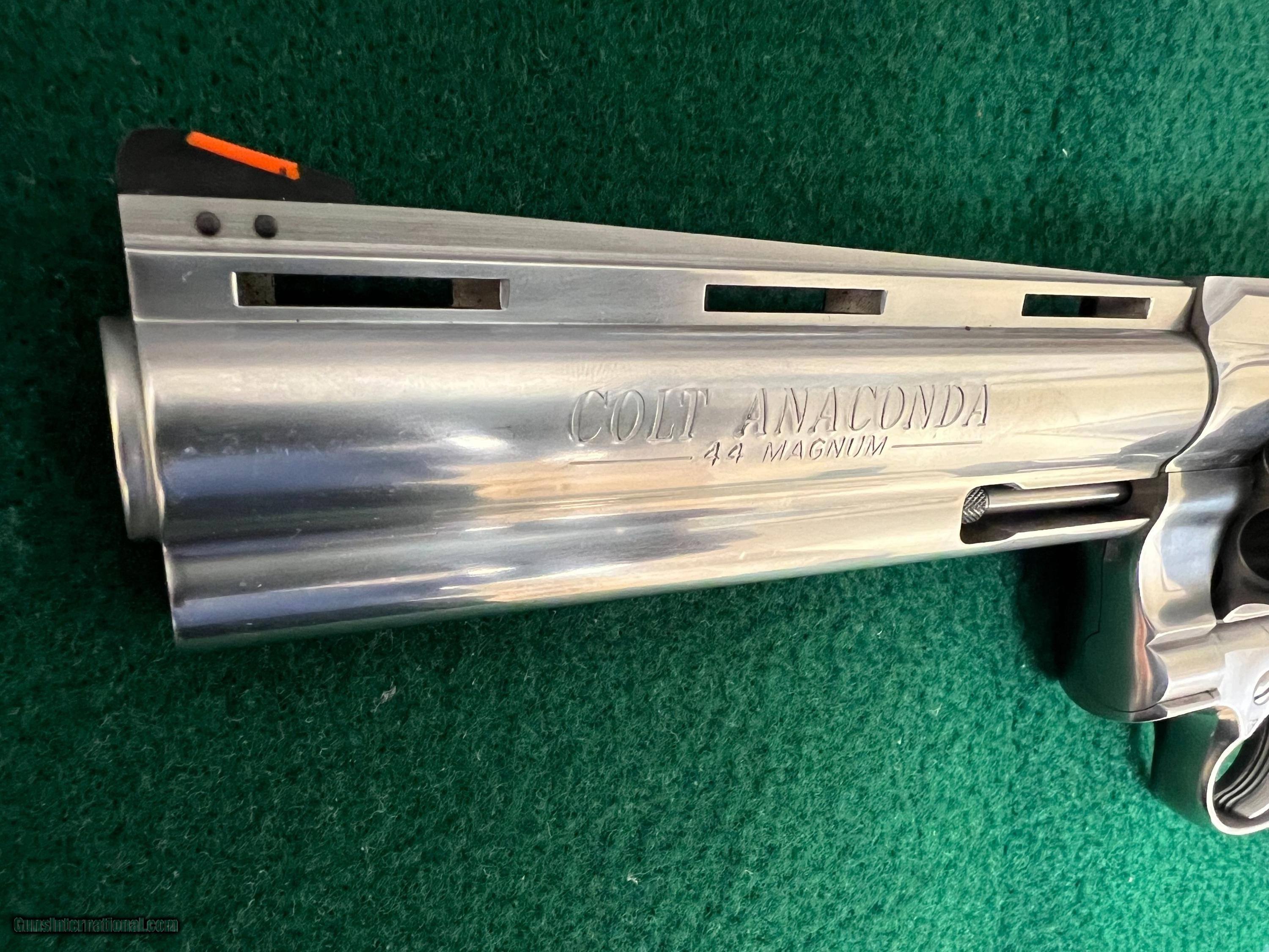 Description: REDUCED BUYER PAYS SHIPPING AND INSURANCE The Colt Anaconda is a large frame double-action revolver featuring a full length under-barrel ejection-rod lug and six round cylinder, designed and produced by the Colt's Manufacturing Company in 1990. Chambered for the powerful .44 Magnum. Built on a new and heavier ‘MM' frame, the Anaconda was brought out to compete with .44 Magnum contemporaries such as the Smith & Wesson Model 29, the Sturm, Ruger & Co. Redhawk and Blackhawk, and the Dan Wesson Firearms Model 44. Considering that many of these models had been marketed and sold for fully 35 years upon its introduction, the Anaconda was a very late entry into the large-bore handgun market.[3] Unlike most other pistols introduced in the 1980s and 1990s, the Anaconda was never offered with a carbon steel blued finish, but was available only in stainless steel. THIS IS A 1997 ANACONDA 6 INCH WITH BOX AND PAPERWORK. LOCKS UP TIGHT. HAS BEEN SHOT BUT NOT BY ME SO I DONT KNOW HOW MANY TIMES. APPEARS ALL ORIGINAL AND IN GREAT SHAPE. NICE COLLECTORS PEICE. PLEASE SEE MY OTHER LISTINGS AND ANY REASONABLE OFFER WILL BE CONSIDERED SOLD Handgun Caliber: .44 Remington Magnum Manufacturer: COLT Model: ANACONDA Serial Number: MM94649 Barrel Length: 6 Bore: LIKE NEW Condition: LIKE NEW Metal Condition: LIKE NEW Bore Condition: LIKE NEW Barrels: 6 INCH Action: REVOLVER Finish: STAINLESS Manufacture Date: 1997 |