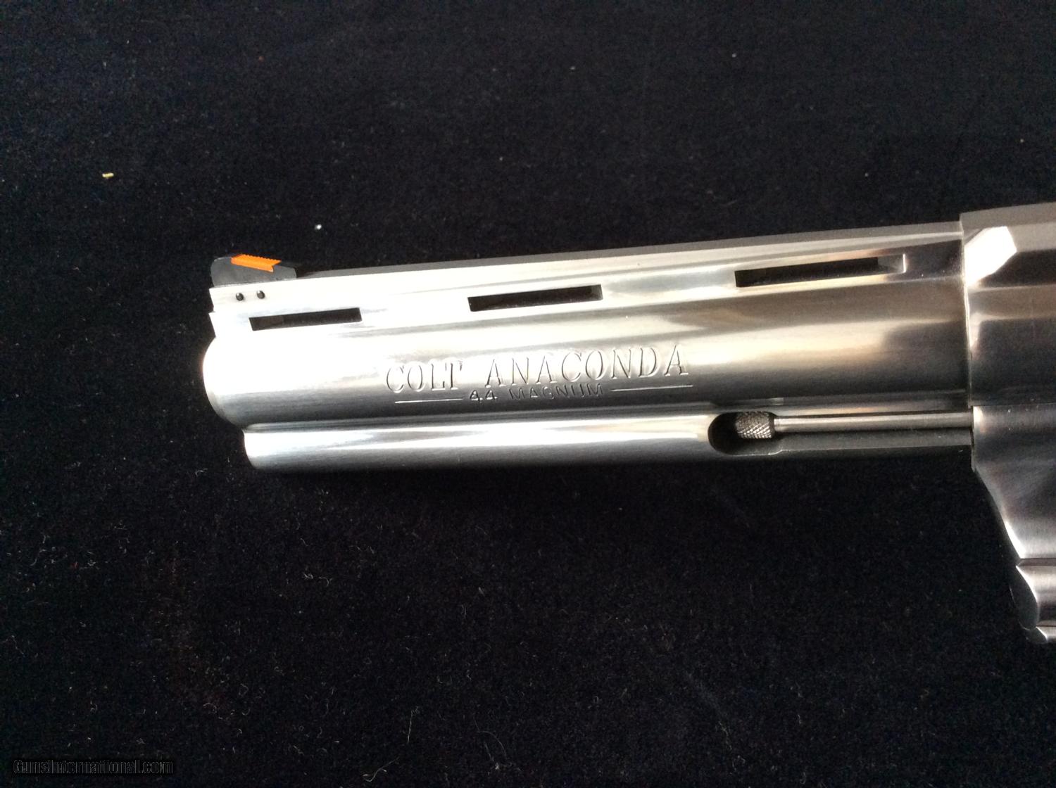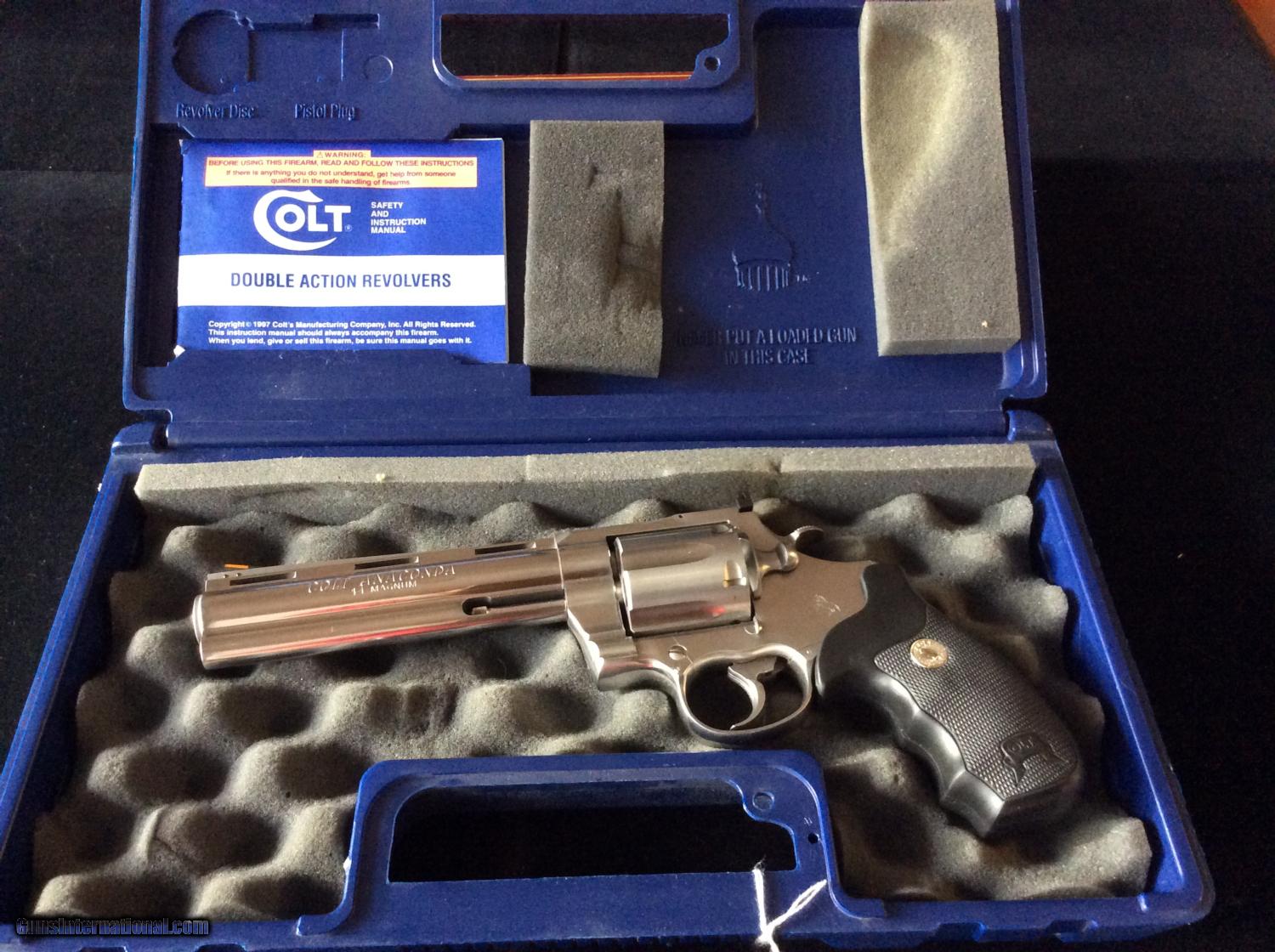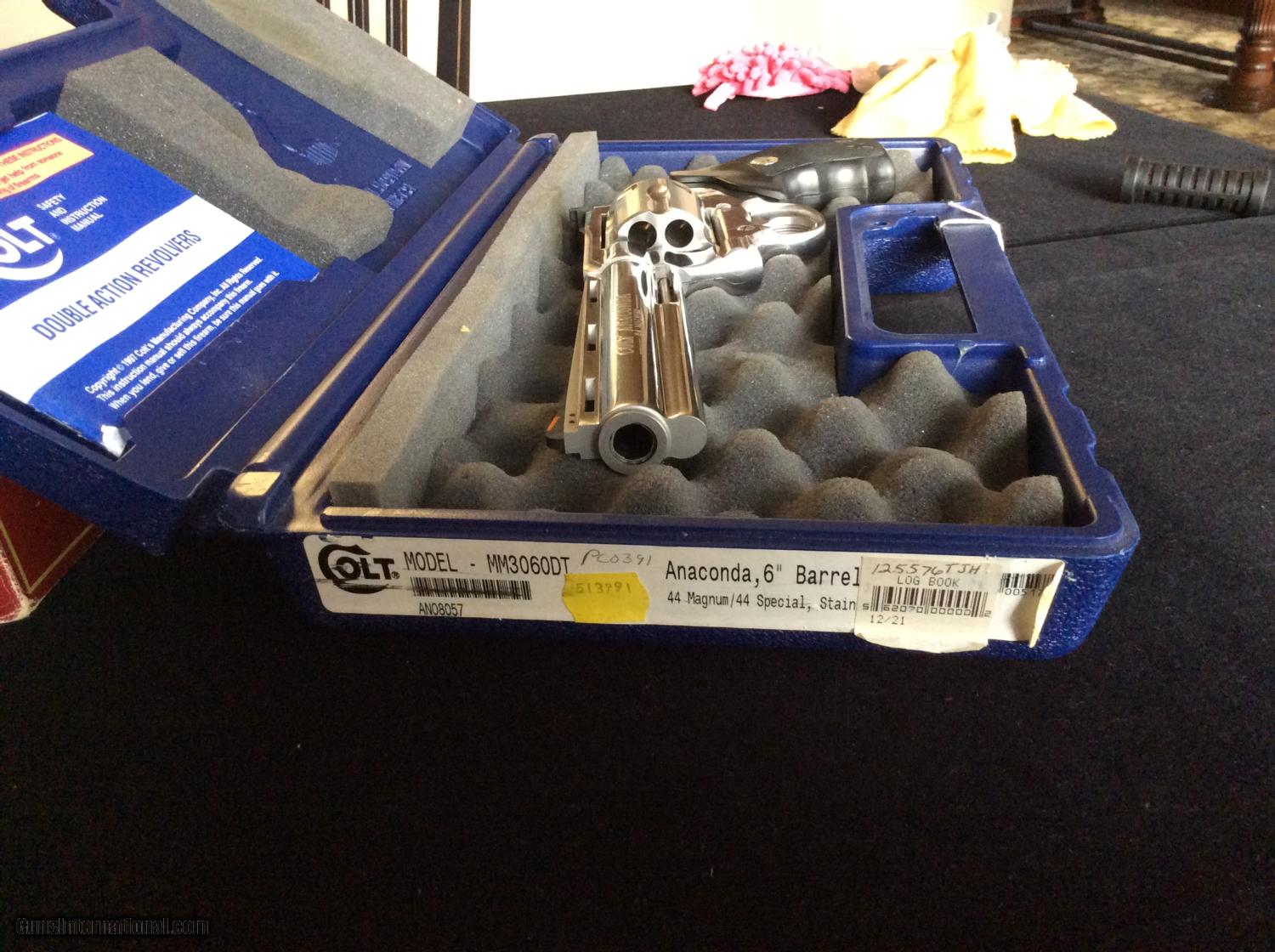 Description: Colt Anaconda 6” STS Drilled and Tapped. For sale is a very nice Colt Anaconda chambered in the powerful .44 Magnum with the very rare and sought after factory drilled and tapped option from the colt custom shop. Even retained the plastic tapped hole plugs. This Snake features a perfect condition bore inside the 6 Inch Barrel and the factory adjustable sights on the outside. The condition overall is very nice with no issues and a very light turn line on the cylinder. This gun has been fired very little and has tight lock-up, perfect timing. The action is crisp as expected from a Colt Snake. This Anaconda is fitted with the original Colt grips and comes in a Colt factory original serialized blue case and manual. No disappointments here. You will not find another one in this condition at this price. Please know your state laws. This firearm will ship FFL to FFL only. Shipping is $40 insured. Payment is due within 5 business days. Money Orders, Postal preferred, certified bank checks or personal checks only. All payments will need to clear prior to shipping so allow ten business days once funds are received. SOLD Manufacturer: Colt Model: Anaconda Caliber Info: ,44 Condition: EX Metal Condition: EX Wood Condition: EX Bore Condition: EX |