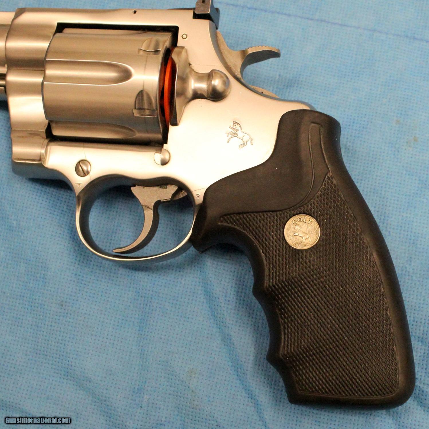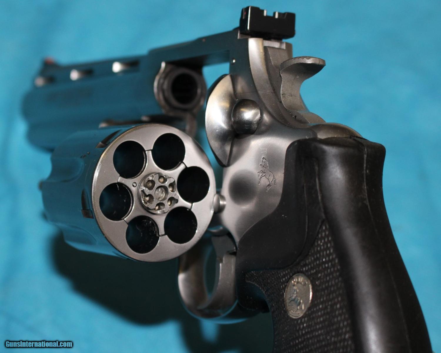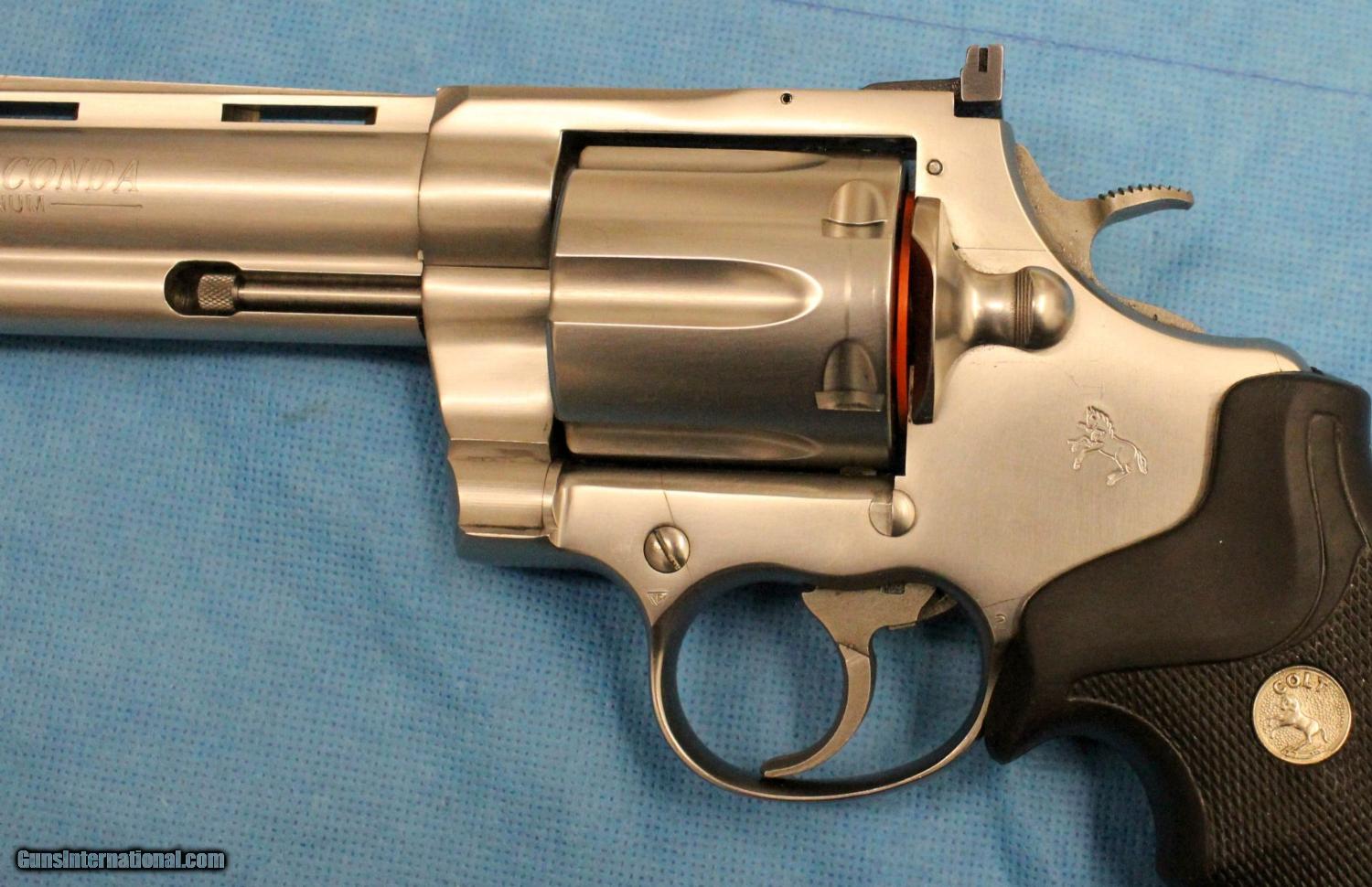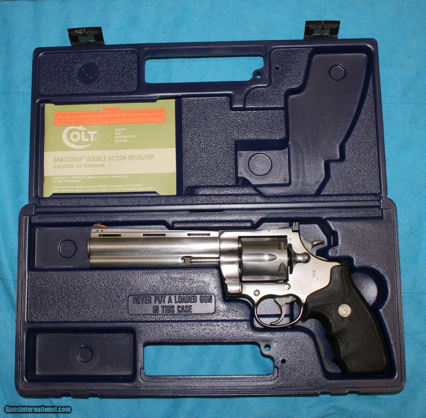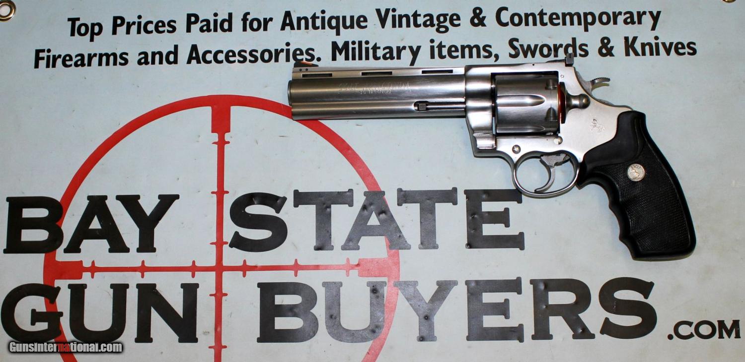 Description: We are offering for sale a Colt ANACONDA Double Action revolver chambered in .44 Magnum caliber. This gun is in excellent 98% condition and comes with original hard case and manual. 6” barrel is excellent with very light surface wear. Bore is perfect with strong rifling; Muzzle is excellent. Frame is excellent with only very light wear. Cylinder shows light drag line; Locks tightly to frame. Double action works flawlessly. Rubber medallion grips are near excellent and shows some minor handling wear. All marks are crisp in detail. EXCELLENT EXAMPLE OF THIS “SNAKE” GUN BY COLT $$ 30.00 USPS Priority Shipping FULLY INSURED $$ **** PLEASE NOTE: WE ONLY ACCEPT MASTERCARD AND VISA AS PAYMENT OPTIONS **** Make: Colt Model: Anaconda Caliber: .44 Magnum SN: MM3303X Action Type: Double Action Barrel Length / Condition: 6” barrel is excellent Ribbing (Y/N): Yes, Vented Rib Muzzle Condition: Excellent Frame Condition (ie. Bluing, Engraving, etc.): Excellent; Very minor wear Kind of Sights (ie. Front, Rear): Front ramp sight; Rear adjustable Trigger/Trigger Guard: Excellent Grip Condition (checkering, etc.): Near Excellent rubber medallion grips Cylinder Condition: Very Good; locks up tightly; drag line PLEASE LOOK AT ALL PHOTOGRAPHS FOR CONDITION Please know the legality of any weapon in your state before . If a gun can’t be transferred to you we will charge a 15% re-stocking fee. Also, we are a PART TIME business, Only in office Wednesday through Saturdays 10am-4pm. If you make an offer on Sunday-Tuesday we may not get back to you for 24+ hours, please send us an email with any questions, and we will do our best to get back in a timely manner. Thank You. We are not a shop open to the public, no private viewings. We stand behind our descriptions, and gladly take returns, however we know based on the descriptions given, you will not be disappointed. No Face To Face Transfers! Please note: Clicking "buy" does not guarantee that this gun is yours, However clicking “Buy” will reserve this gun for you, if it hasn’t been sold in store. We will try to do our best to remove the posts as efficiently as possible, but sometimes delays may ensue. “Buy” is your safest bet to reserve a gun. Also please add 6.25% MA state sales tax (if from MA) and 3% credit card shop courtesy fee. After Clicking “buy” we will need the following from you, via email before we ship. 1: A copy of your preferred FFL’s license via email () 2: Your preferred method of payment (If Credit card: 16 digit, MM/YY exp date, 3 digit code Plus billing address) 3: Your Shipping information/ Your preferred FFL’s Shipping information. You have 5 business days to arrange payments and ffl information to us. Any purchase not completed within this time frame will be cancelled, and the ad will be put back active online. Please before calling with concerns read these conditions and meet them accordingly. SOLD |