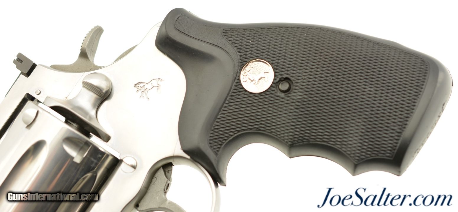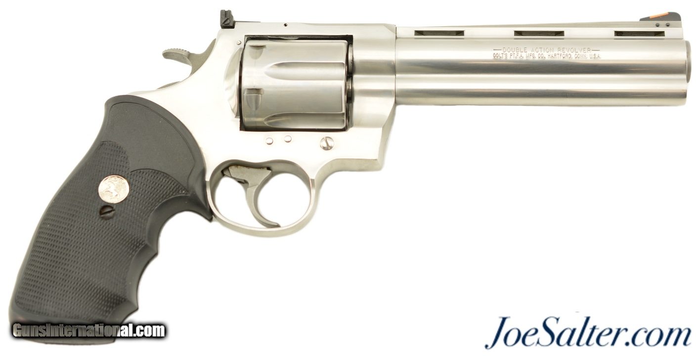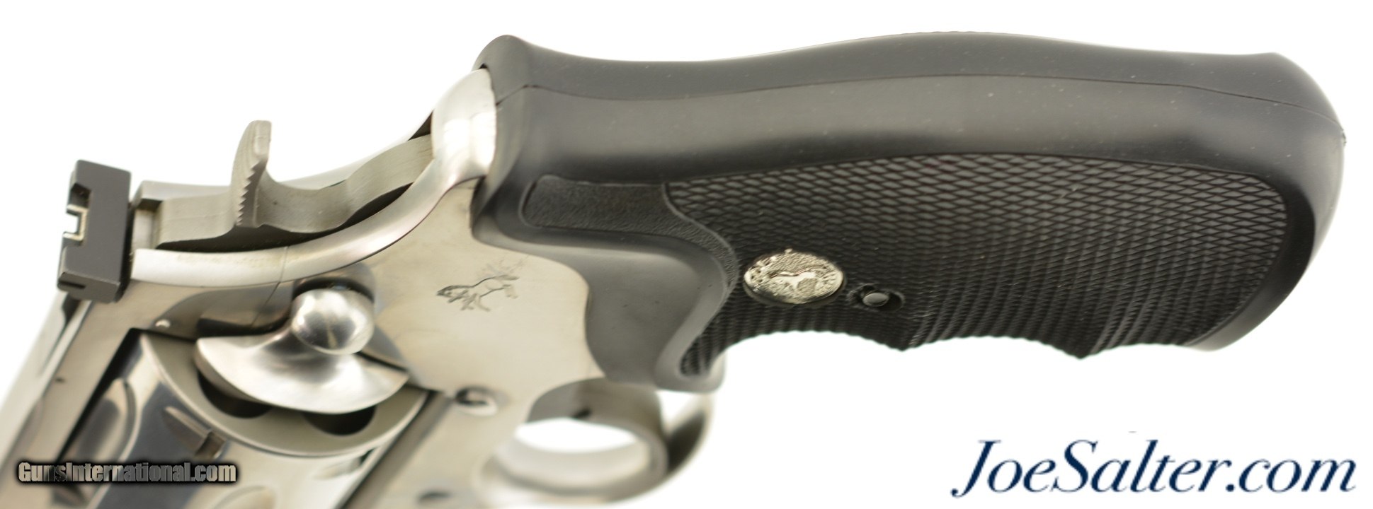 Description: Serial #MM39593, .44 Magnum, 6" barrel with an excellent, bright bore. This stainless steel revolver exhibits a minor turn-ring on the cylinder, and has a few very mild surface scratches scattered about the otherwise excellent stainless steel surfaces. The original Pachmayr Presentation, Colt medallion grips are likewise in excellent, almost unworn condition. The firing pin retaining pin does protrude from the frame somewhat, may have been replaced. The lock-up is tight and the mechanism functions flawlessly. This is a splendid 1990s, .44 Colt "Snake Gun" and is in excellent overall condition. FFL SOLD |